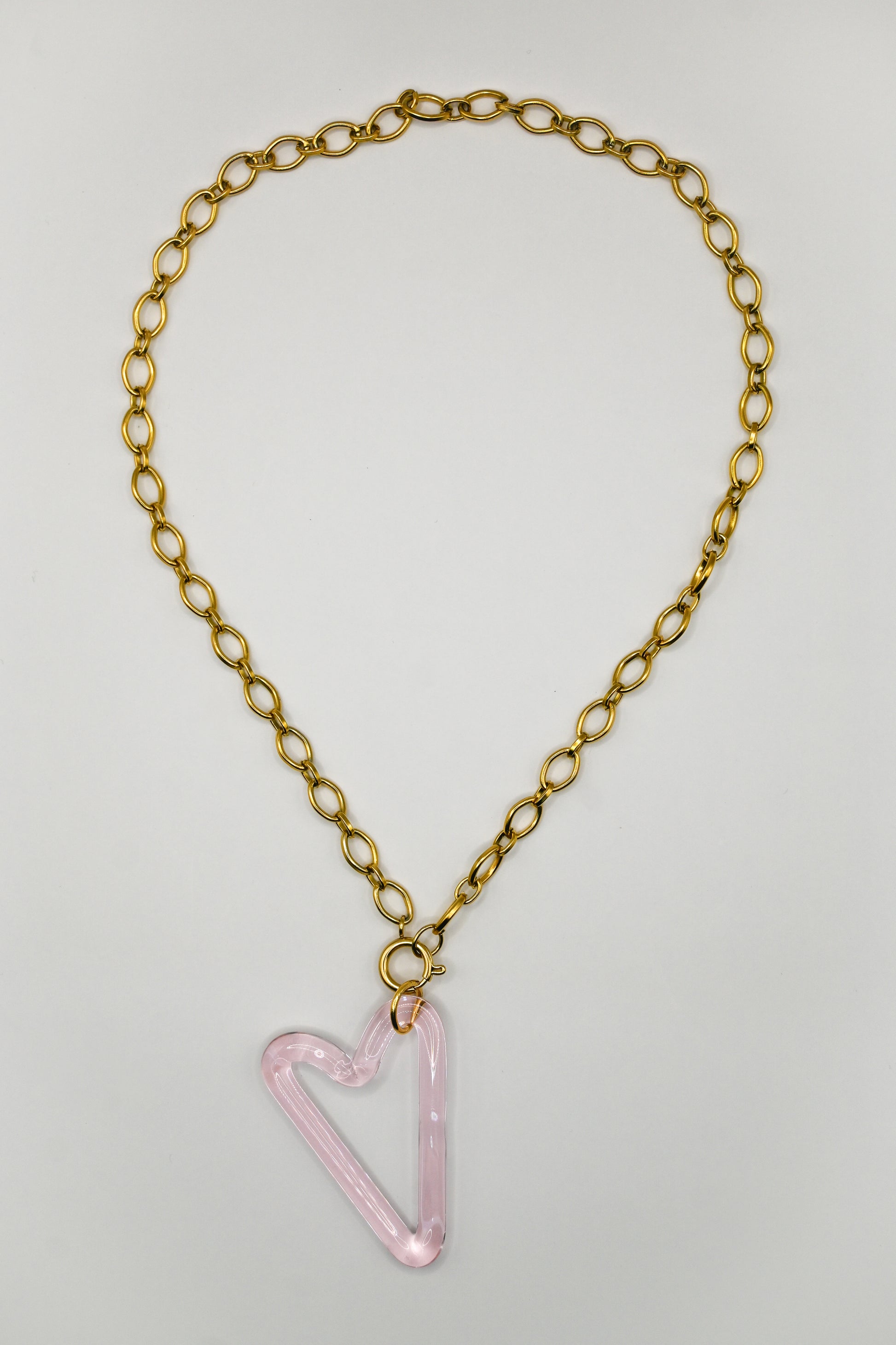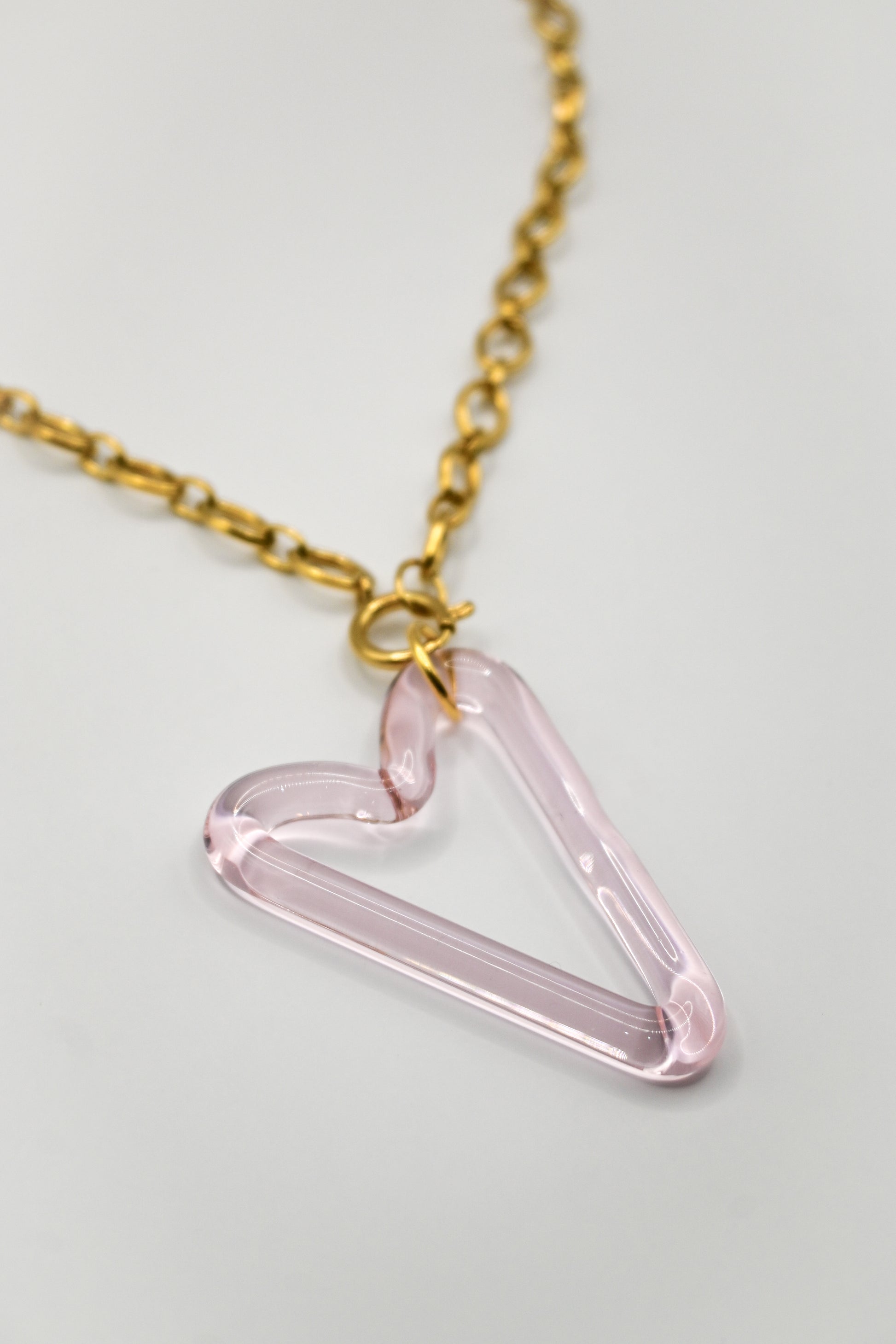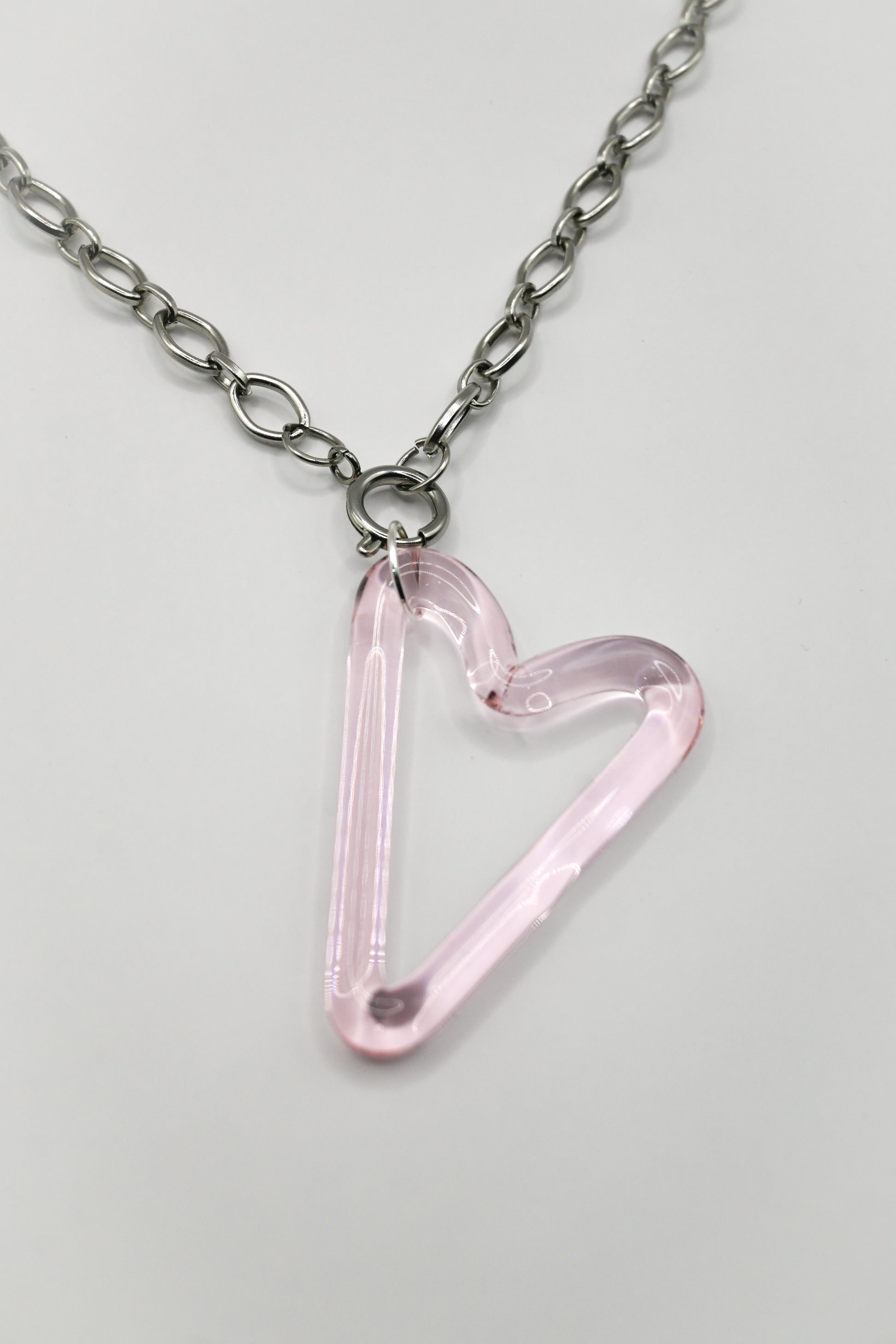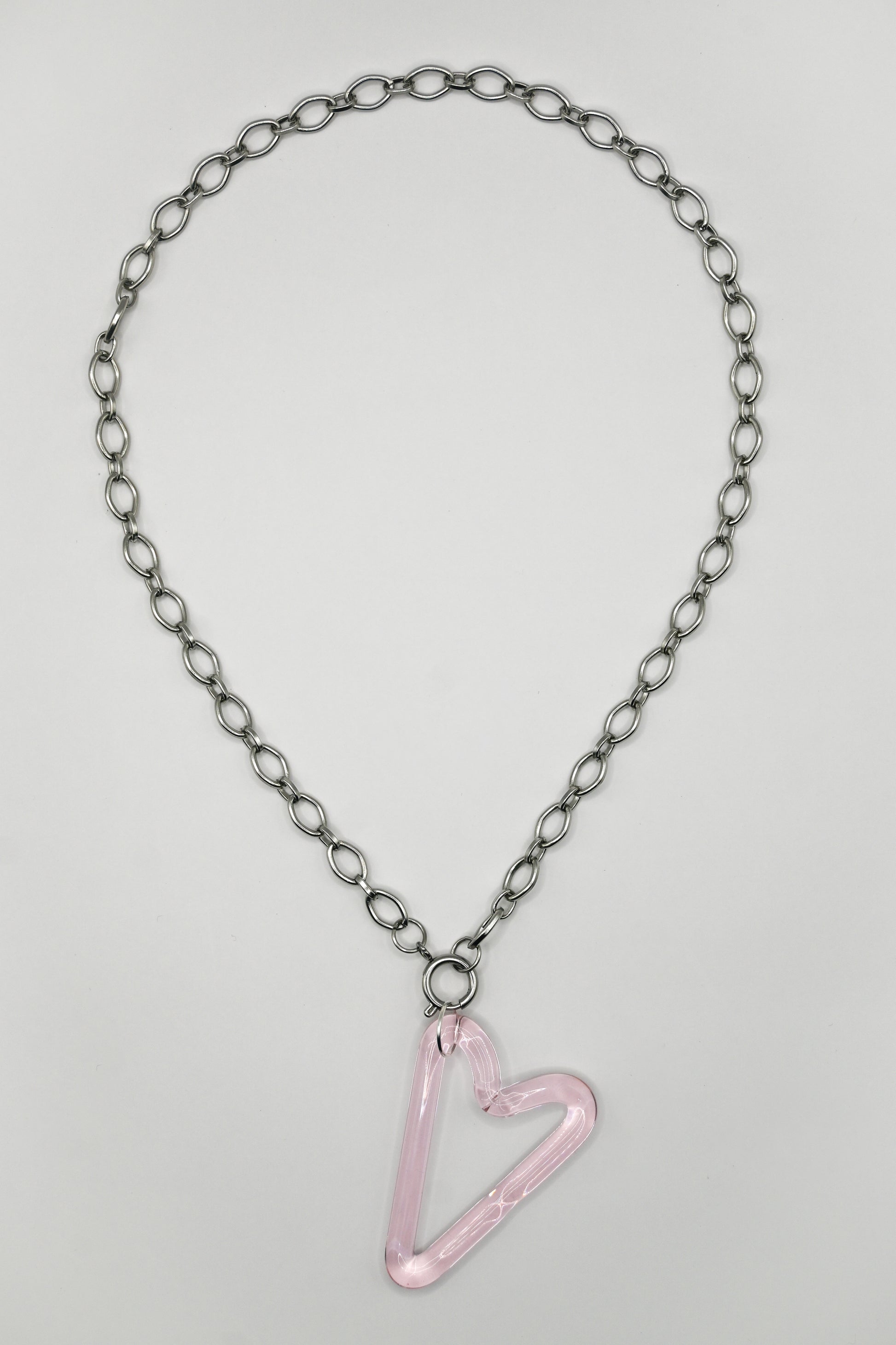 Un collar de 1 corazón rosa único hecho a mano con una cadena y cierre que combina la elegancia del vidrio borosilicato con la durabilidad y el brillo del acero.
