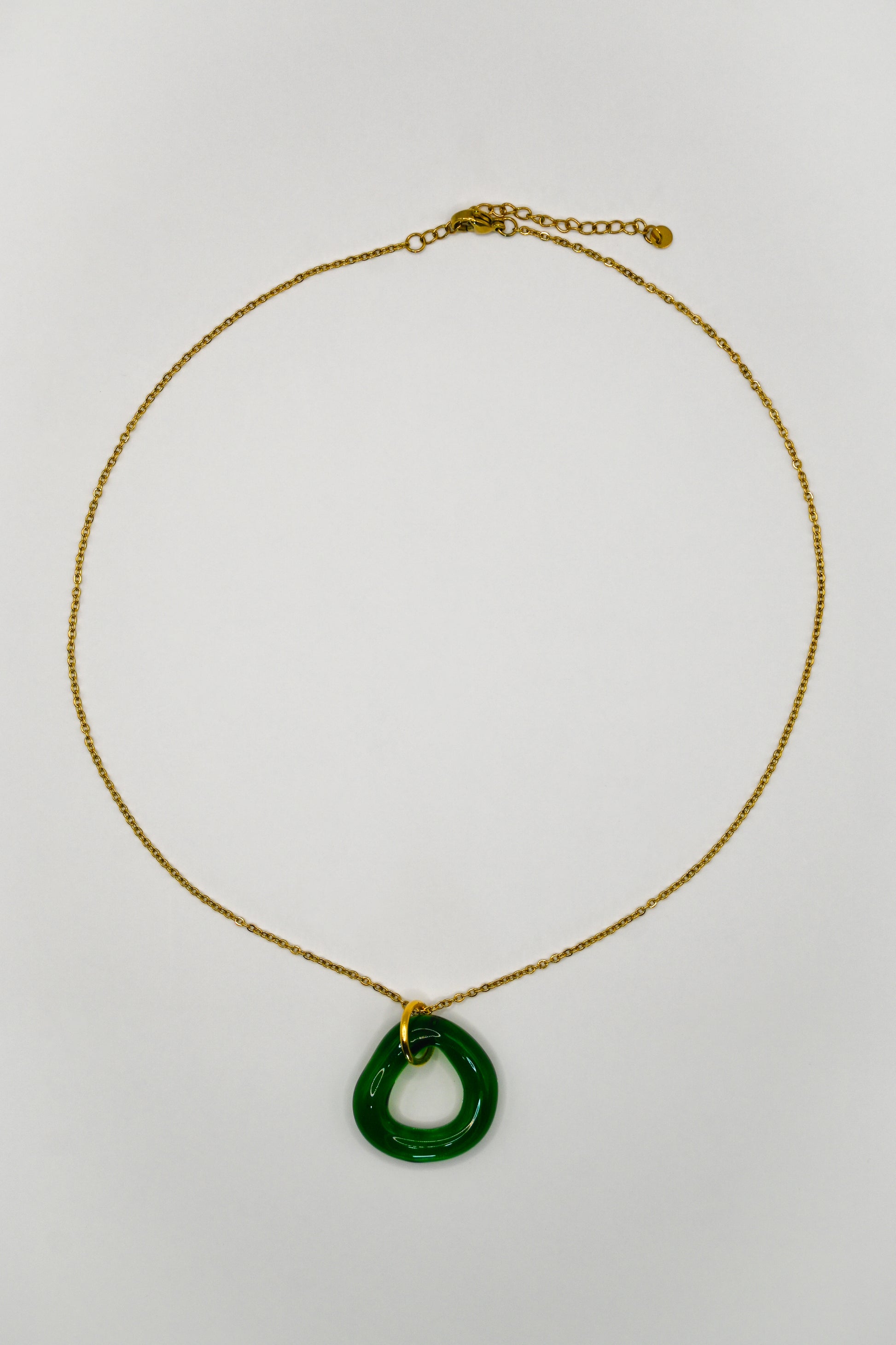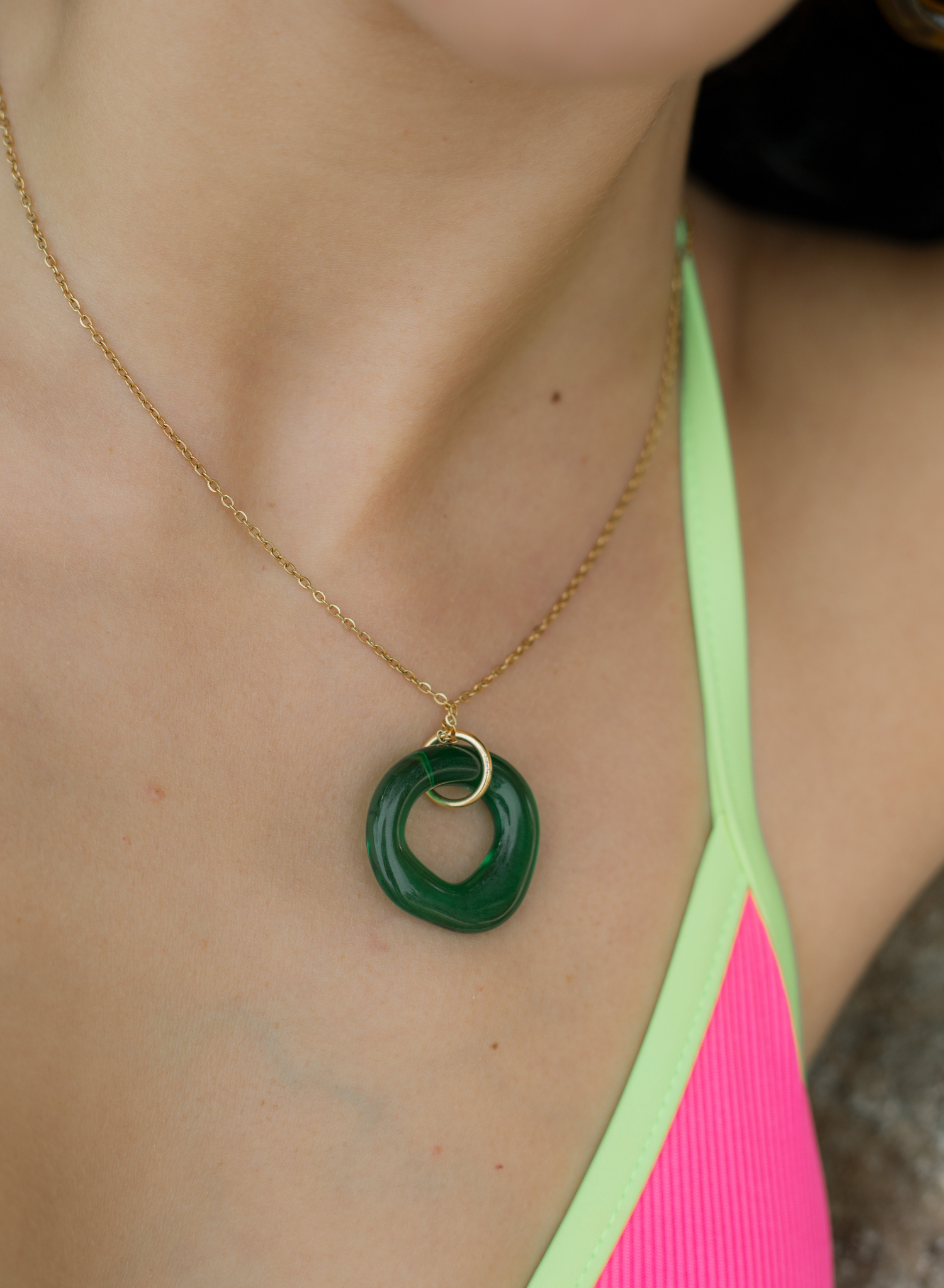 - ORO: Vidrio borosilicato verde junto con una cadena de acero inoxidable bañado en oro de 18k de 45cm.