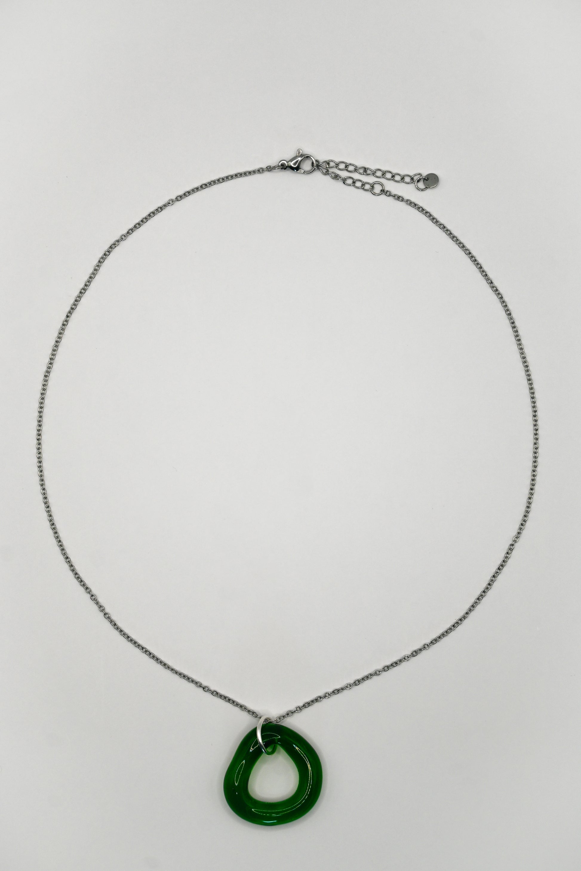 - PLATA: Vidrio borosilicato verde junto con una cadena de acero inoxidable de 45 cm.