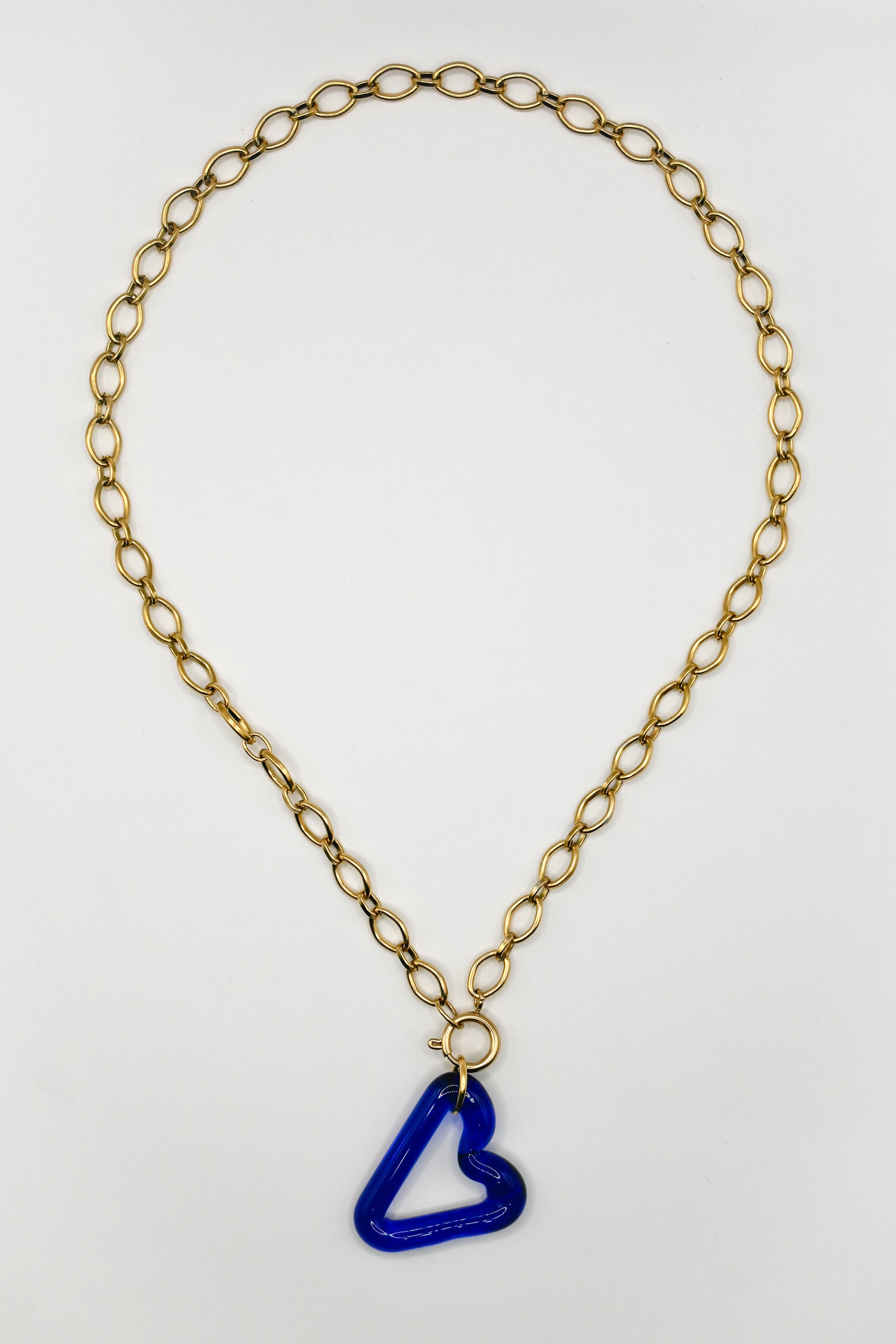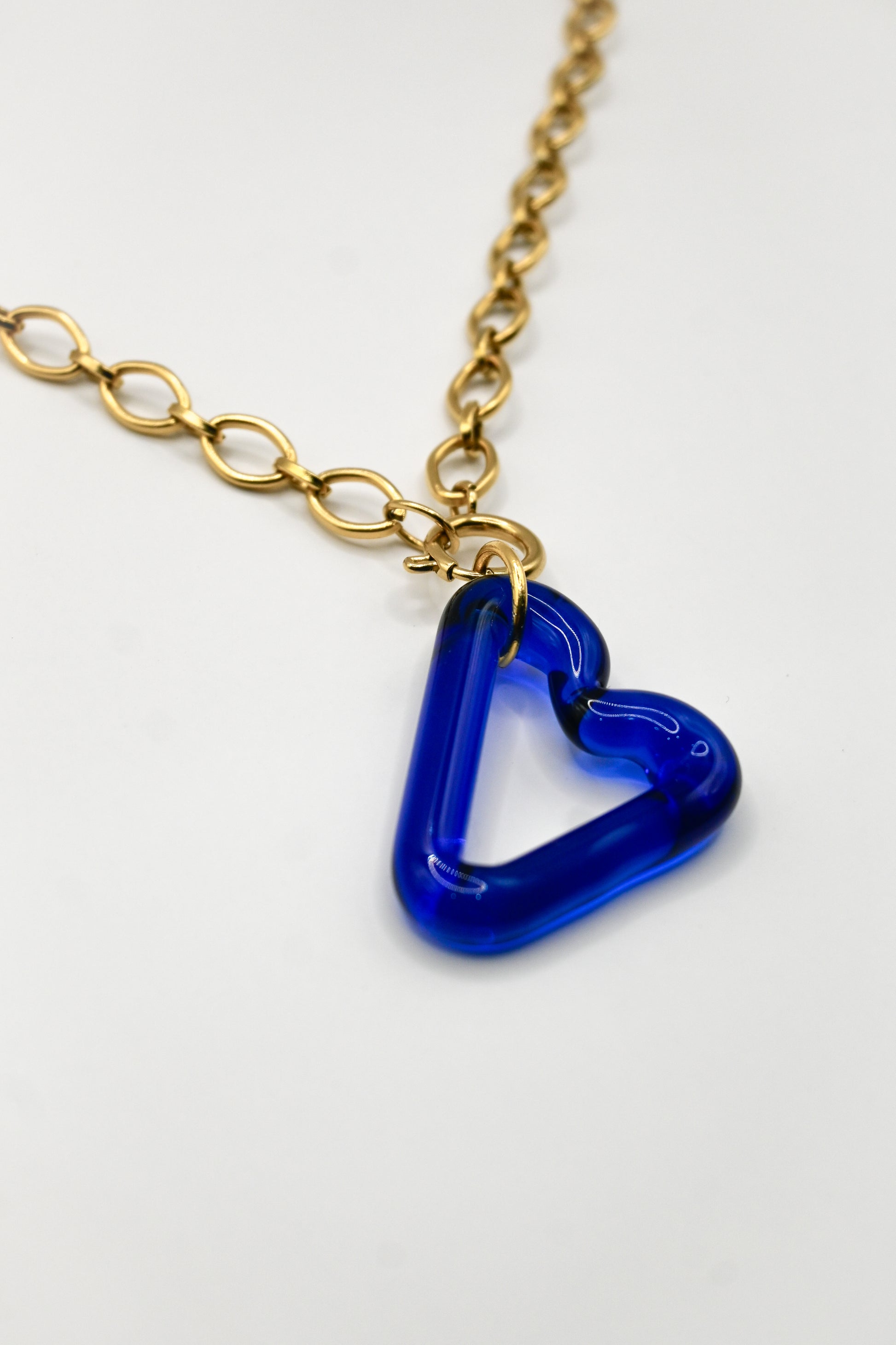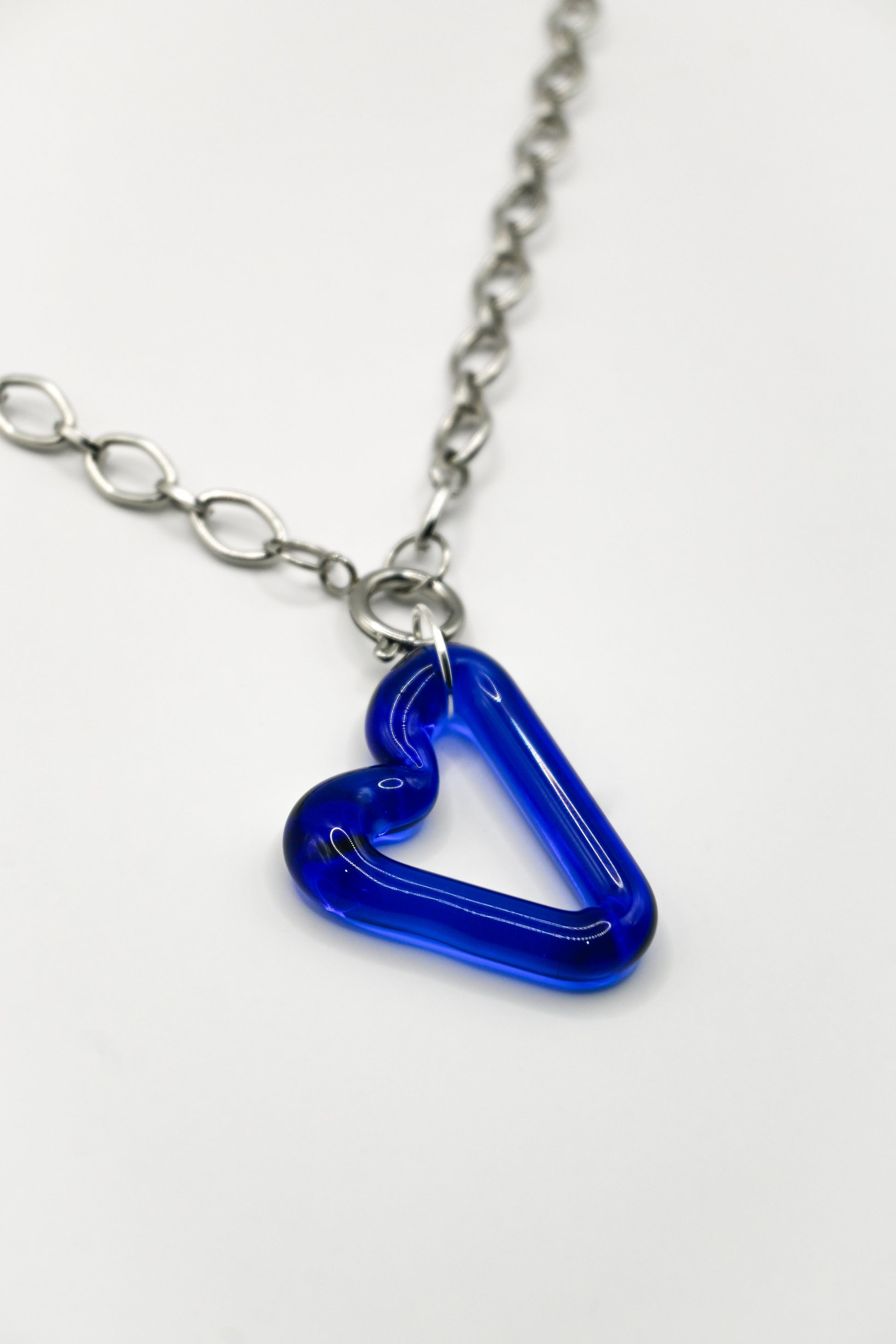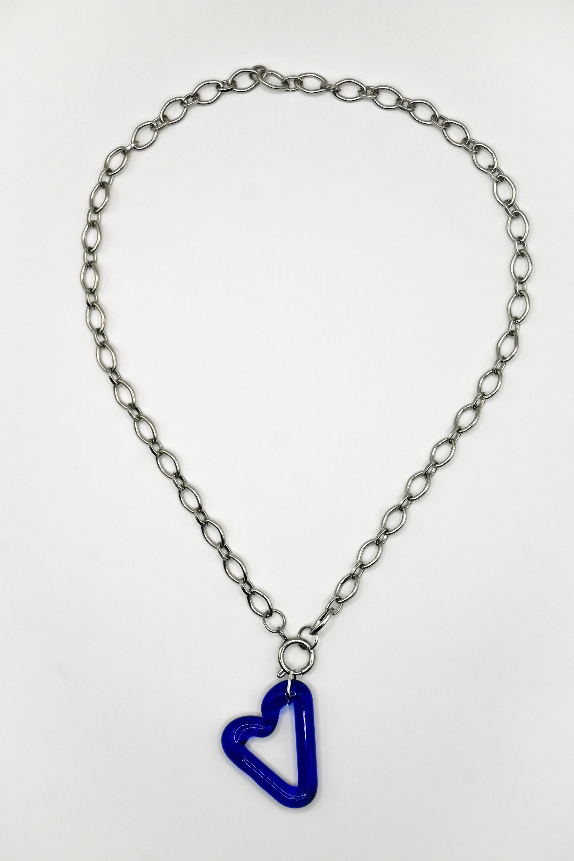 Un collar de 1 corazón azul único hecho a mano con una cadena y cierre que combina la elegancia del vidrio borosilicato con la durabilidad y el brillo del acero.