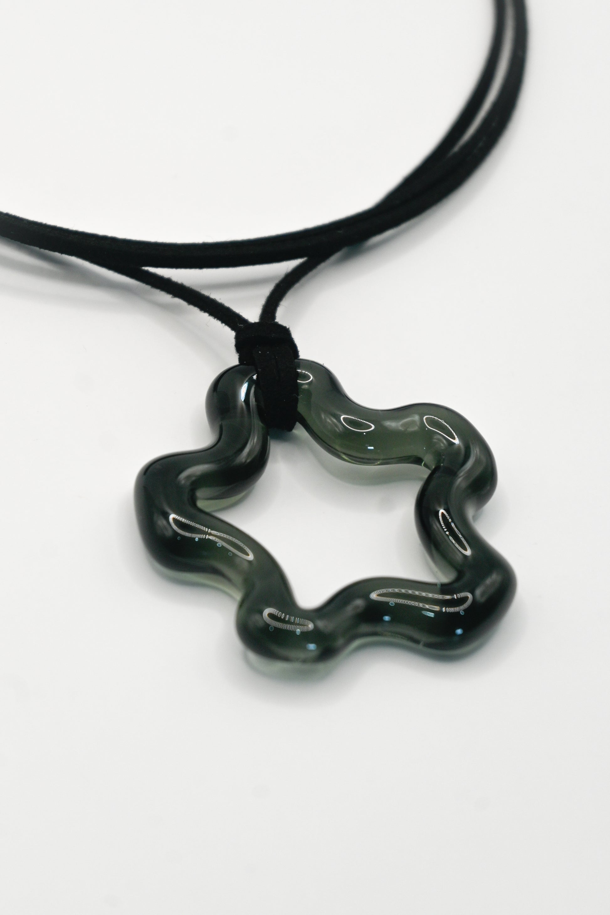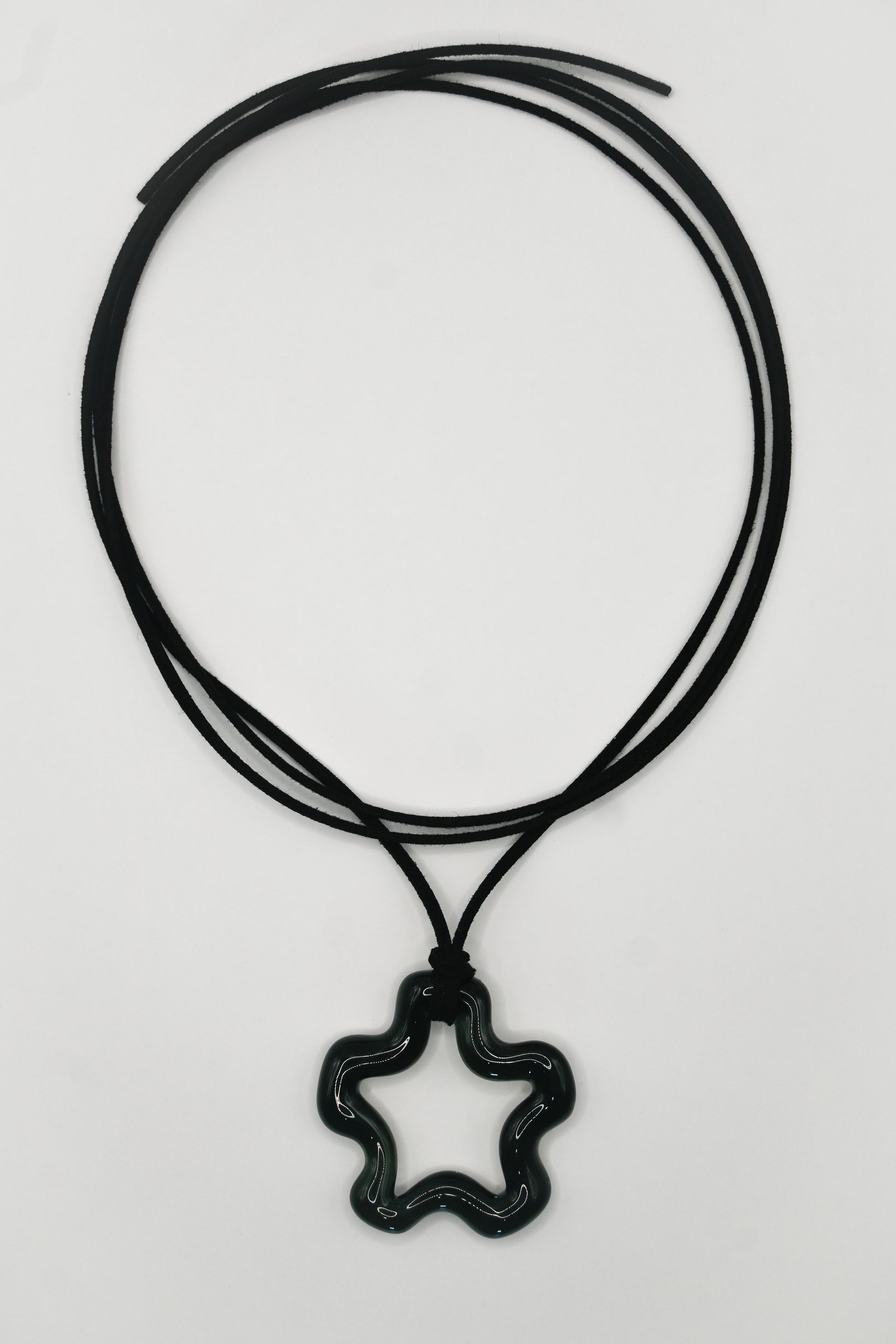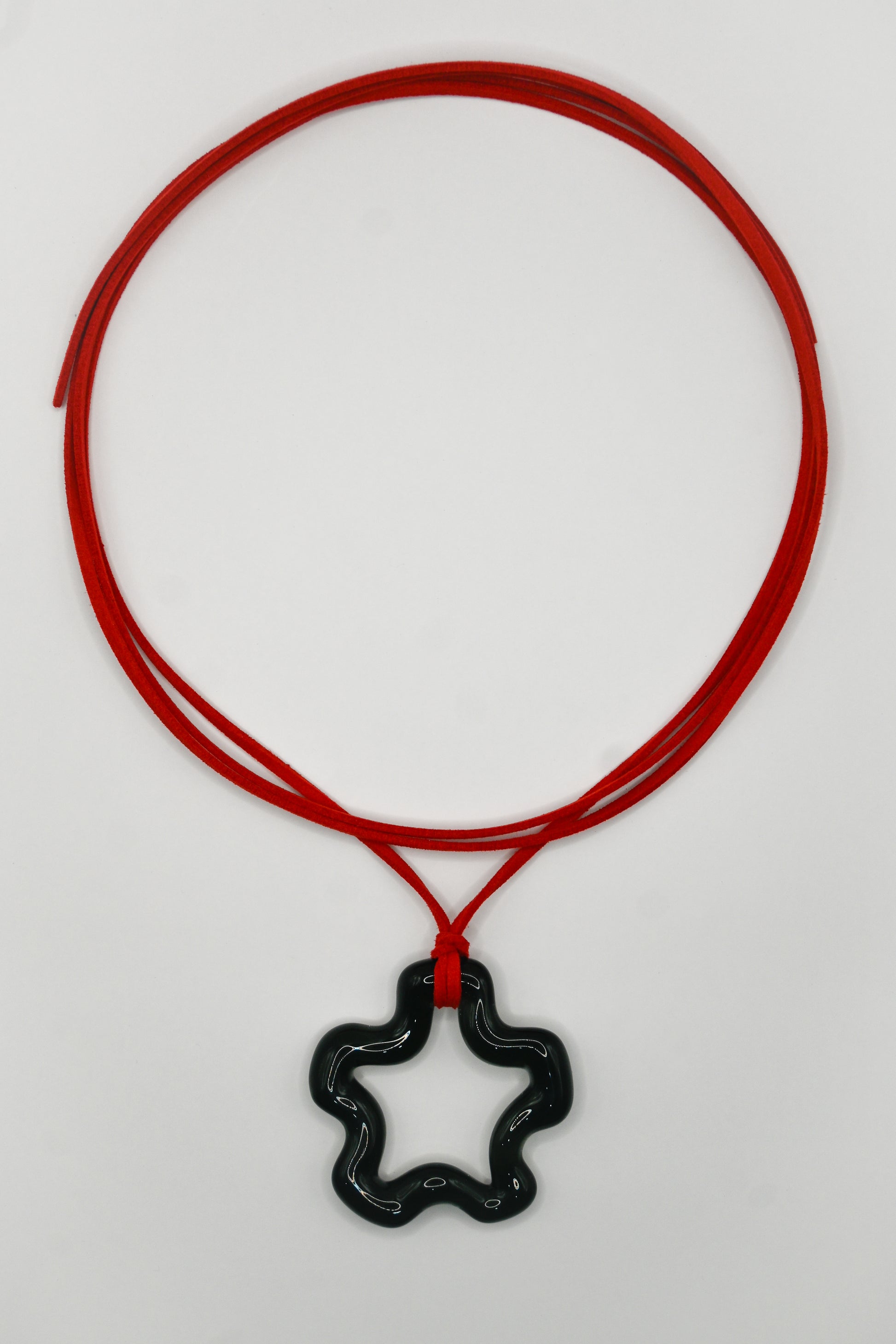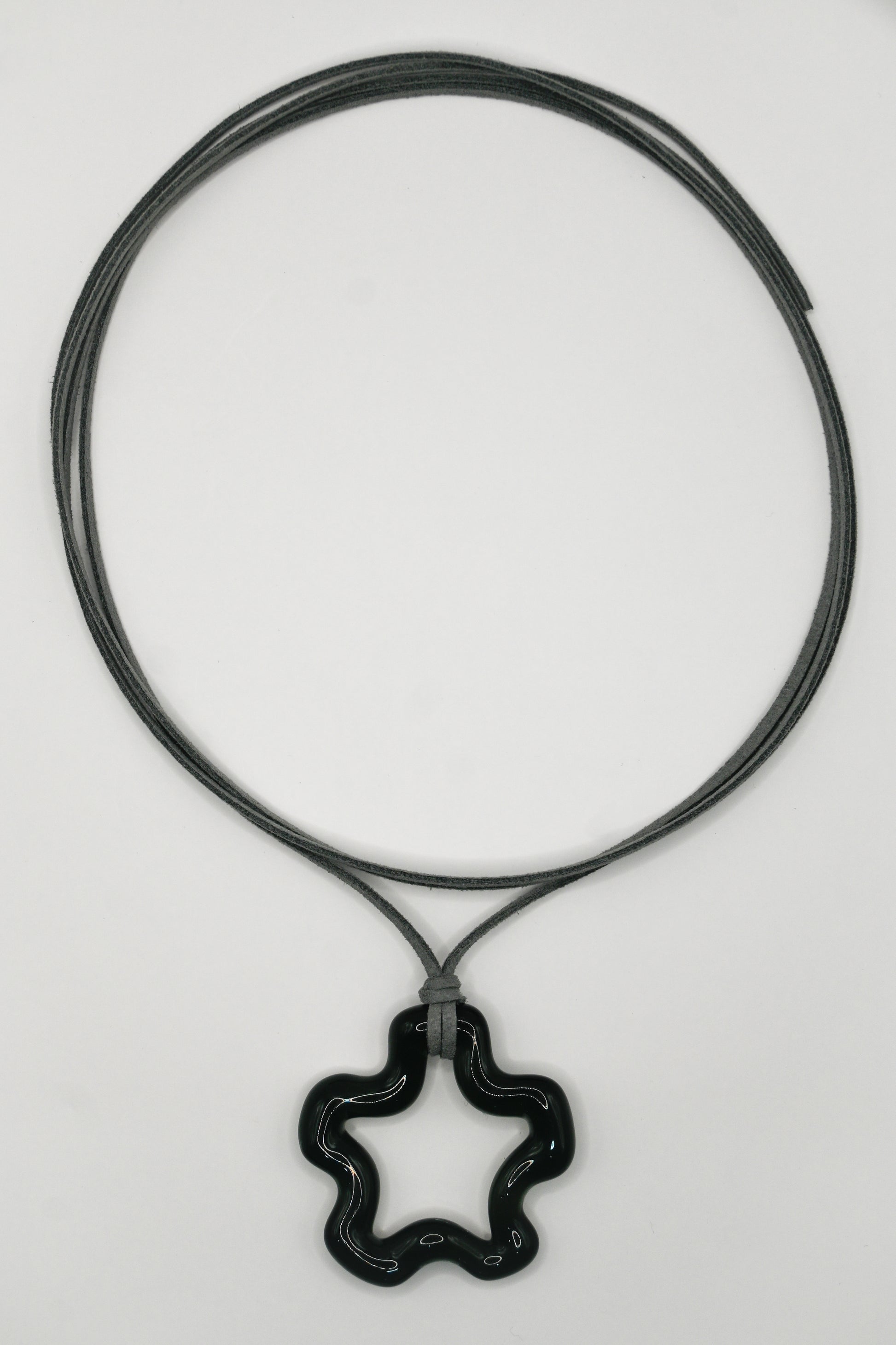 Un collar hecho a mano con vidrio y cordón de antelina plano presenta una estética artesanal y natural. La pieza central de forma irregular negra representando el coral del mar, moldeada a mano con detalles únicos y texturas fascinantes. El cordón de antelina plano complementa el estilo rústico y orgánico del collar, ofreciendo un contraste suave y elegante alrededor del cuello. Esta combinación crea una pieza de joyería que destaca por su simplicidad, pero al mismo tiempo, por su singularidad y belleza artesanal.