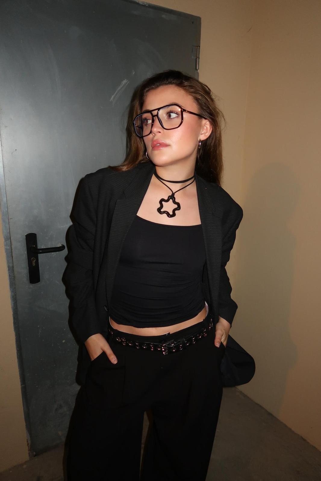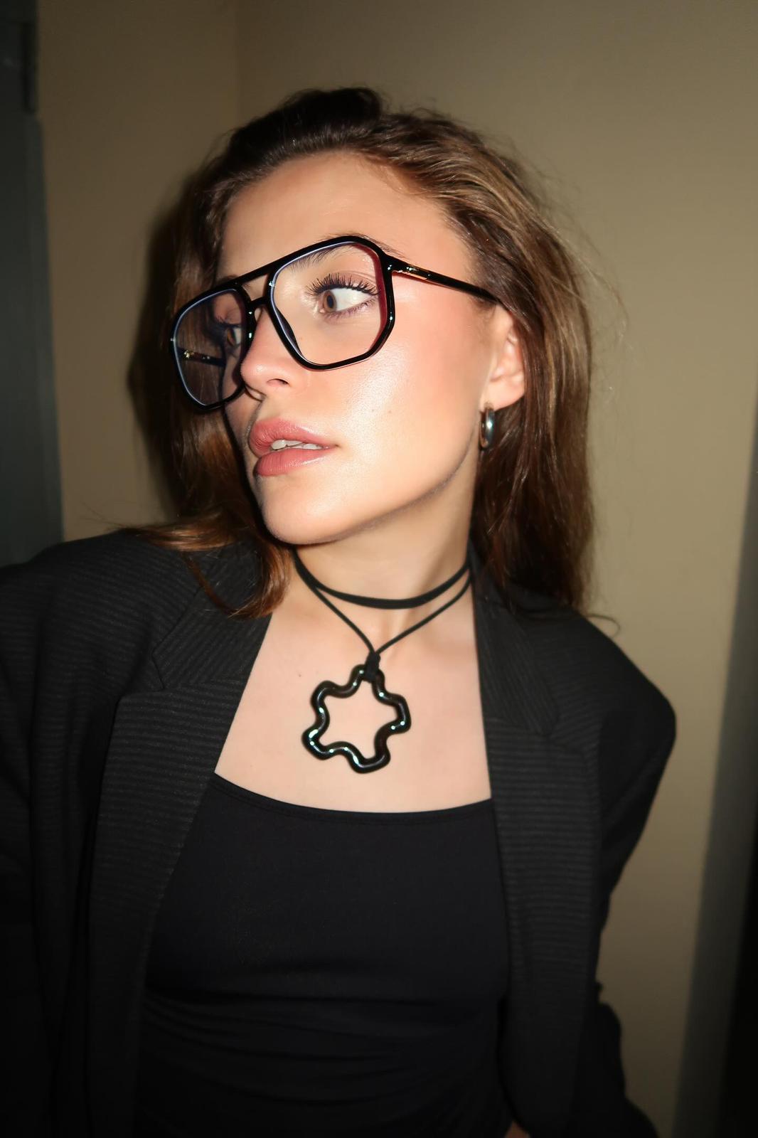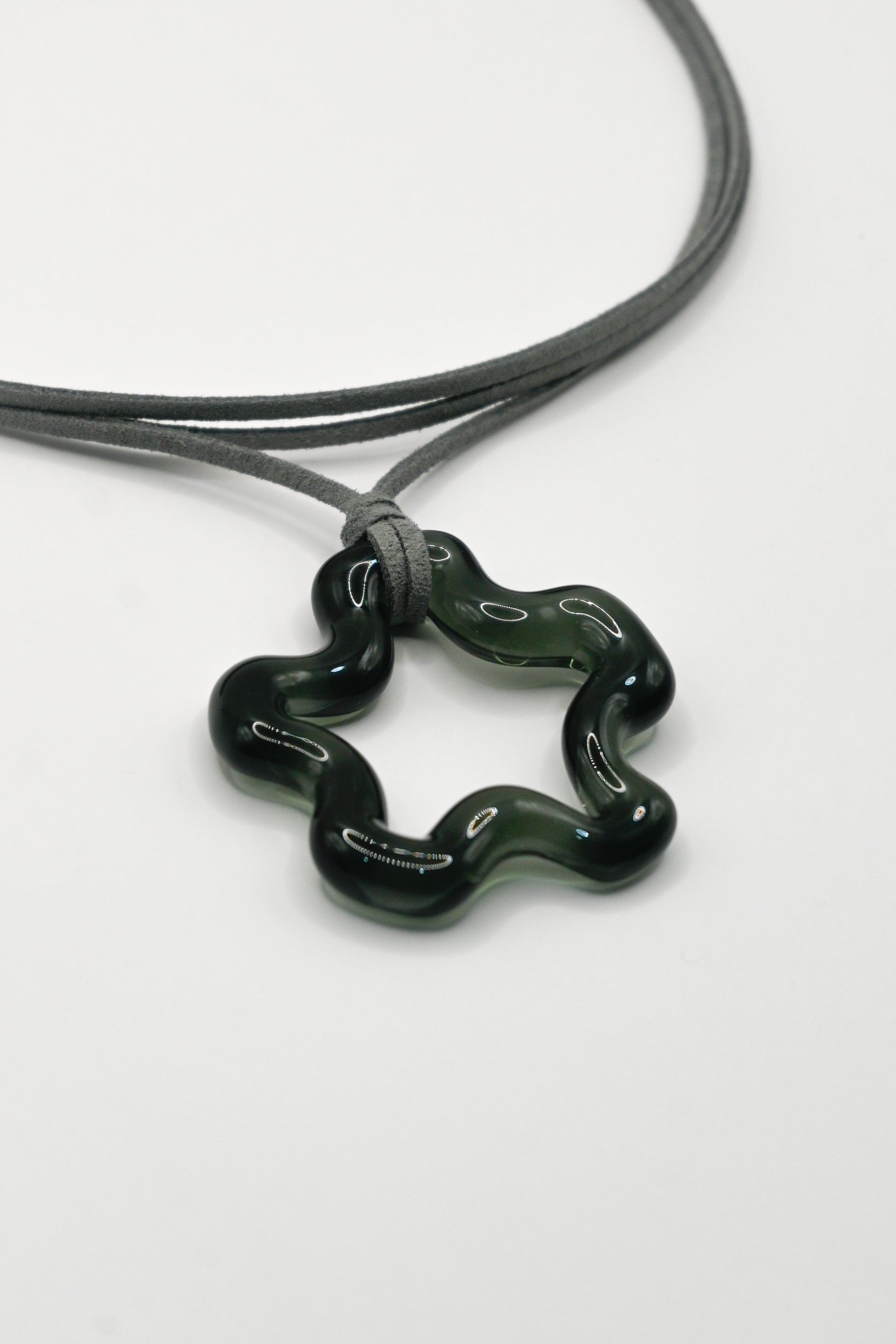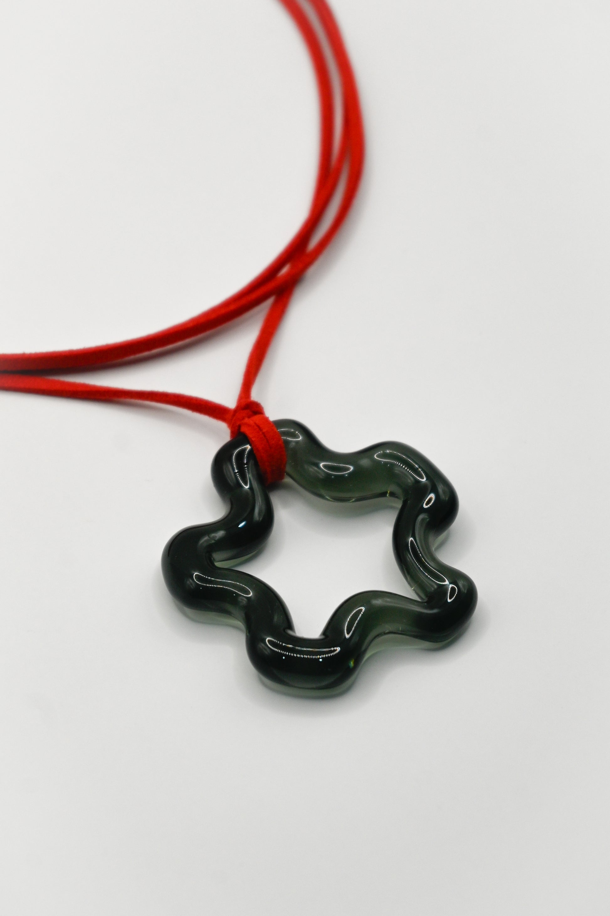 Un collar hecho a mano con vidrio y cordón de antelina plano presenta una estética artesanal y natural. La pieza central de forma irregular negra representando el coral del mar, moldeada a mano con detalles únicos y texturas fascinantes. El cordón de antelina plano complementa el estilo rústico y orgánico del collar, ofreciendo un contraste suave y elegante alrededor del cuello. Esta combinación crea una pieza de joyería que destaca por su simplicidad, pero al mismo tiempo, por su singularidad y belleza artesanal.