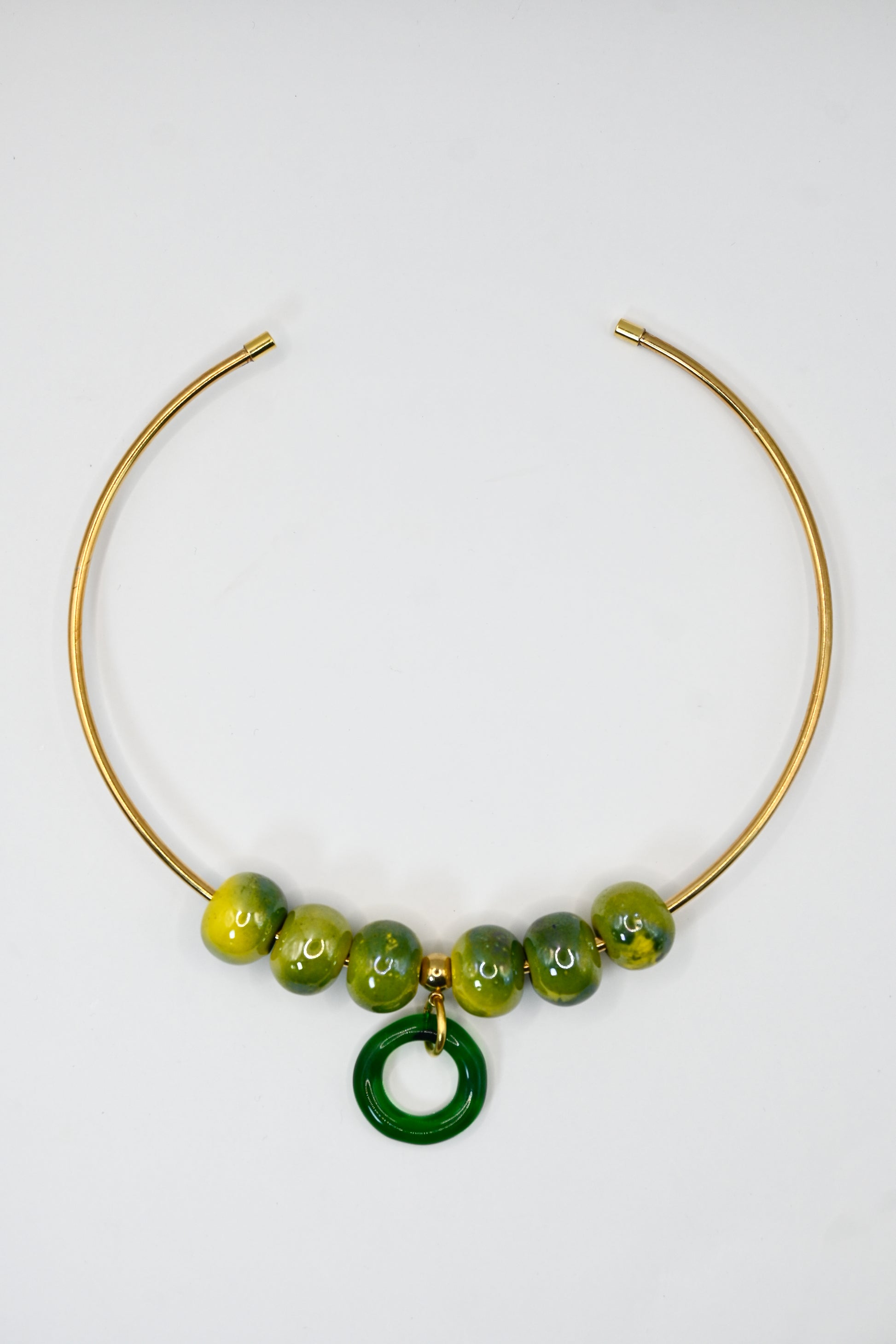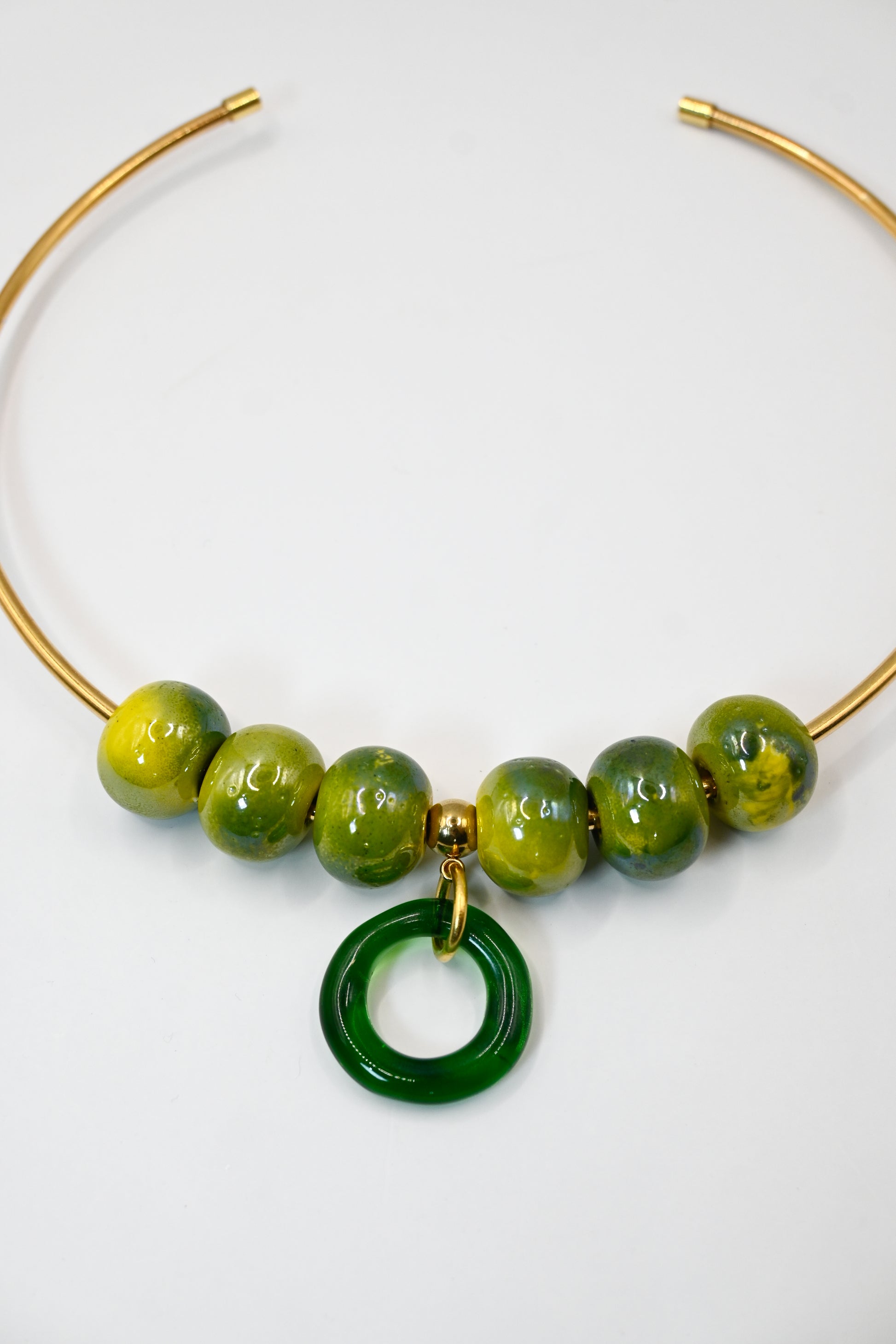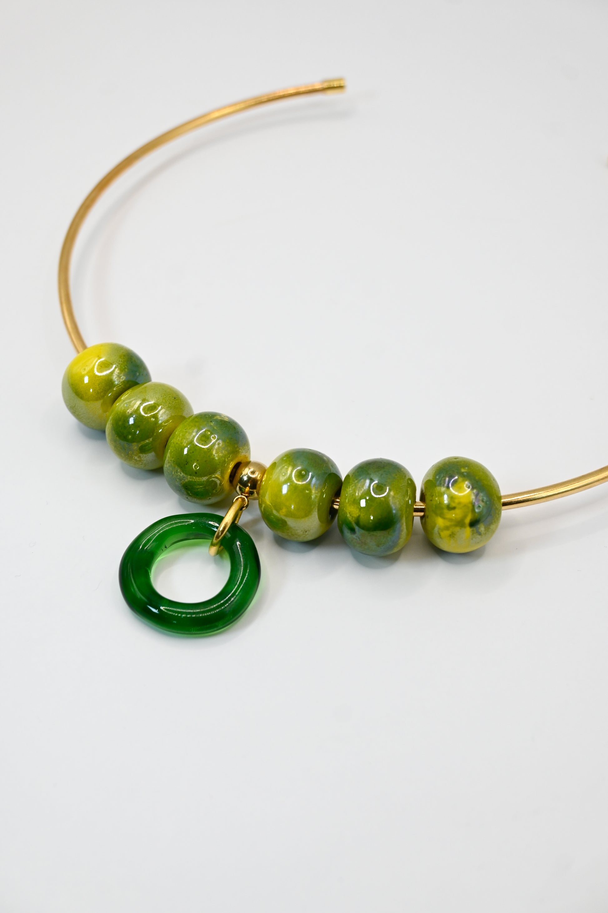 Vidrio borosilicato verde junto entrepiezas de cerámica y una cadena rígida de metal latón bañado en oro de 24k.