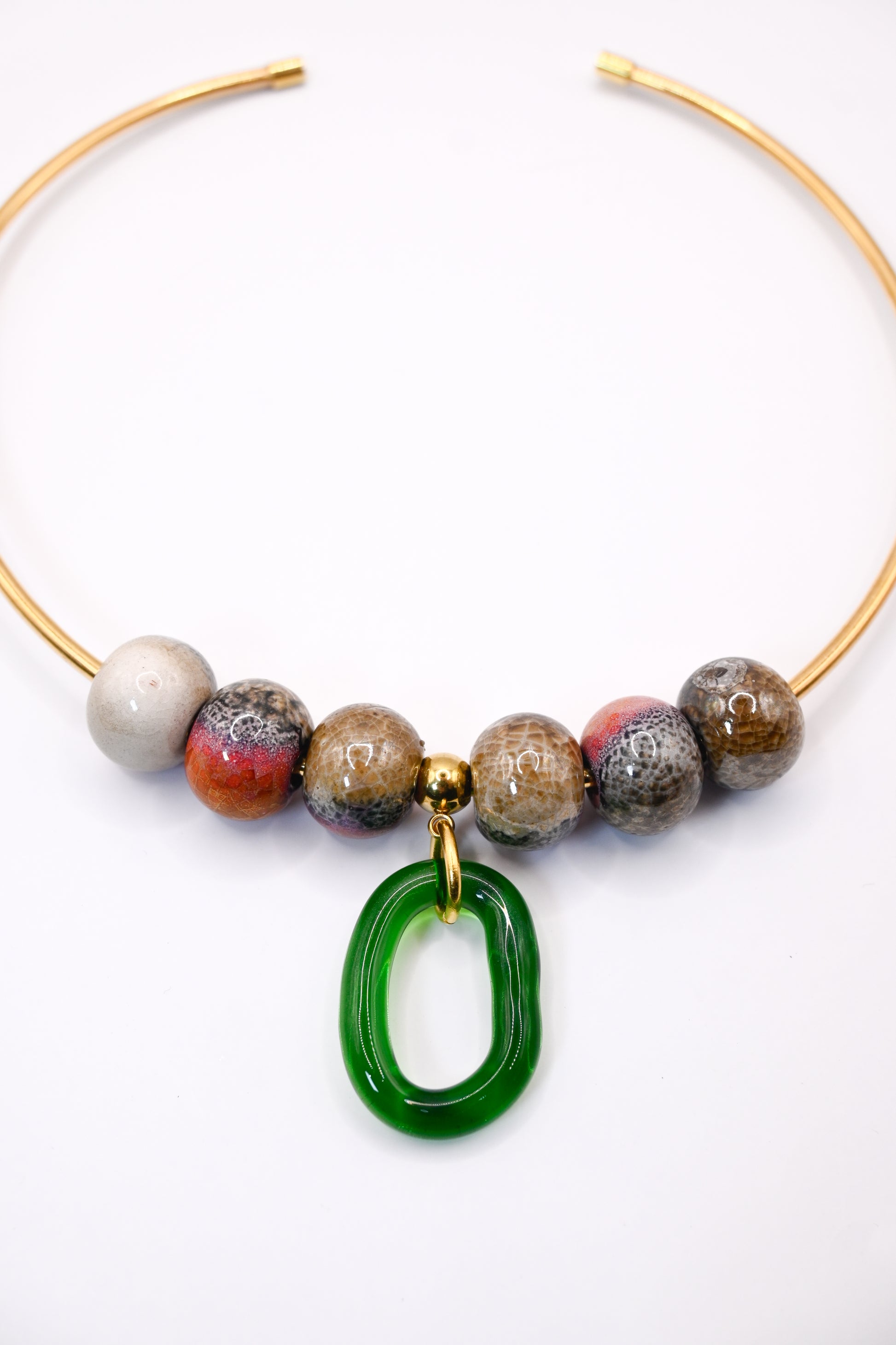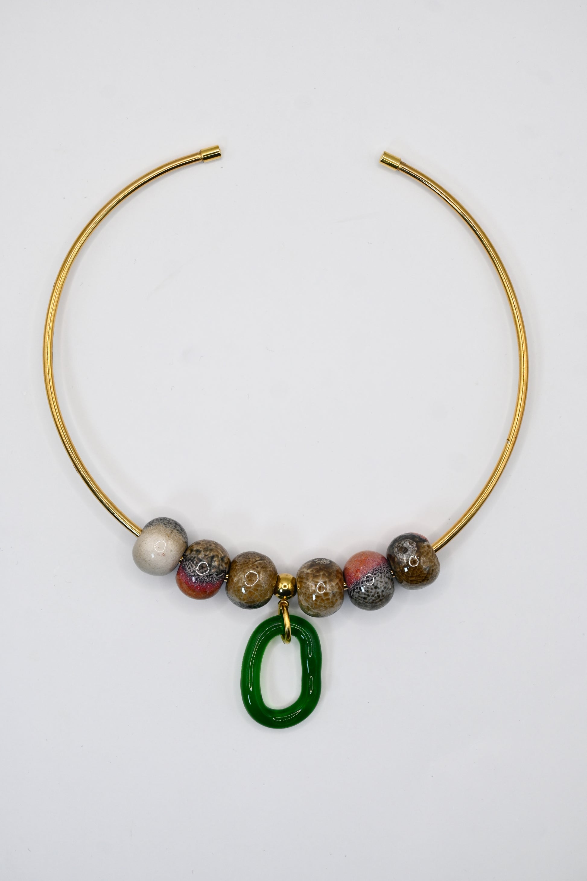 Vidrio borosilicato verde junto entrepiezas de cerámica y una cadena rígida de metal latón bañado en oro de 24k.