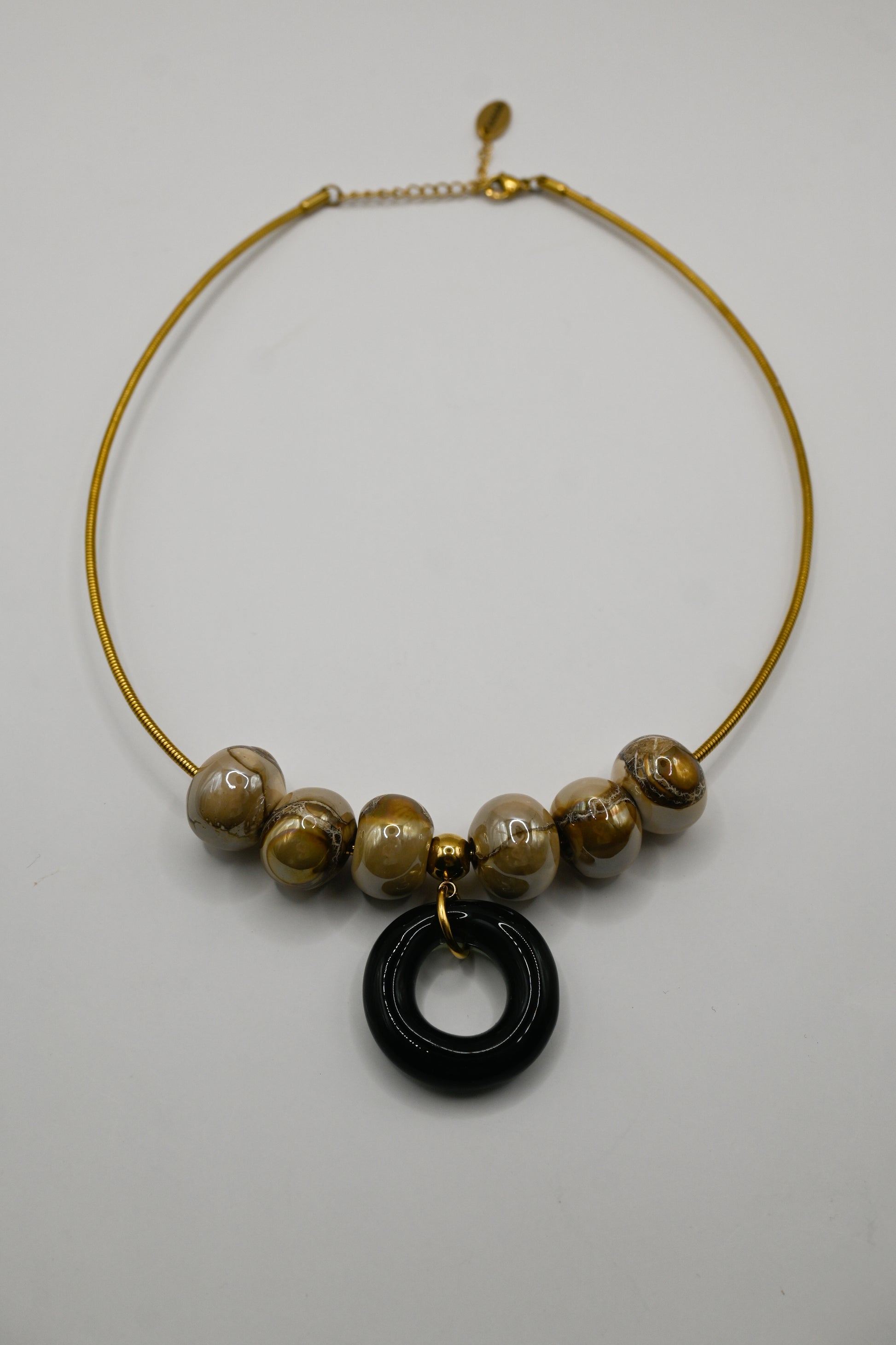 Vidrio borosilicato negro junto con entrepiezas de cerámica (el tinte de la entrepieza puede variar de tonalidad debido a la fabricación manual) y una cadena rígida de acero inoxidable bañada en oro de 24k.