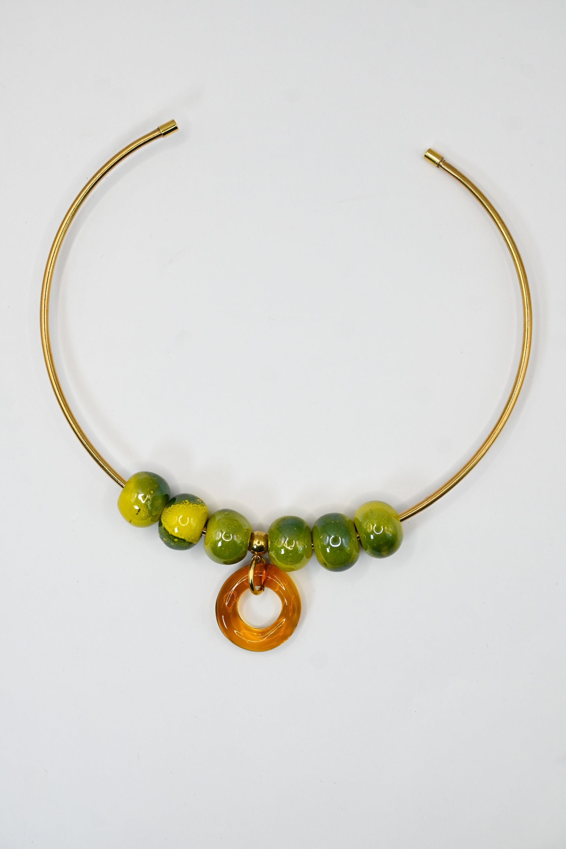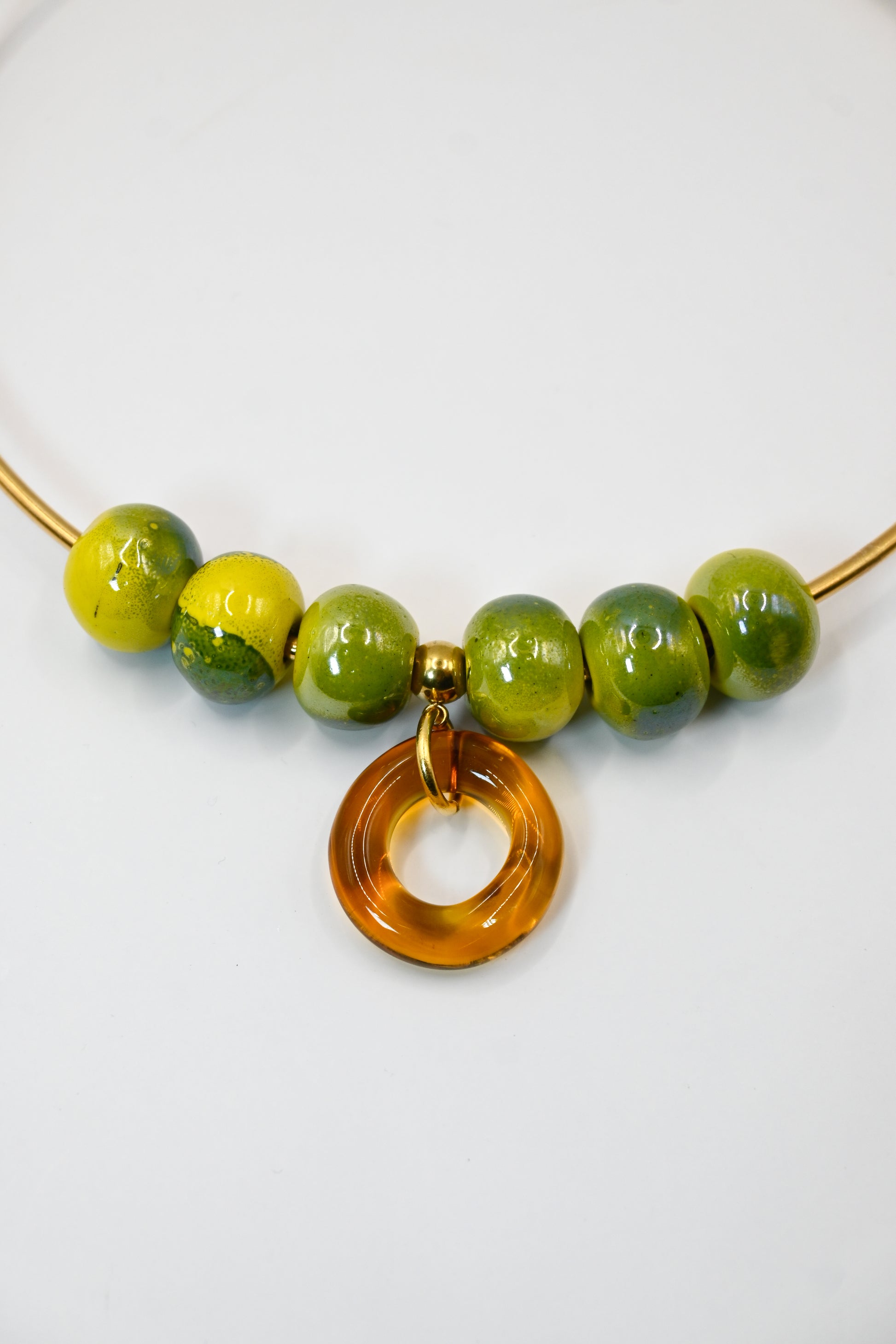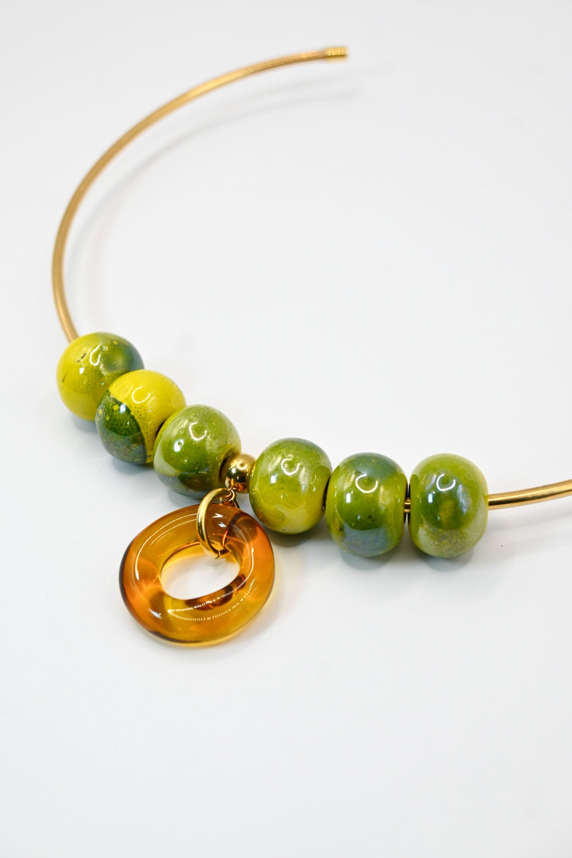 Vidrio borosilicato amarillo junto entrepiezas de cerámica y una cadena rígida de metal latón bañado en oro de 24k.