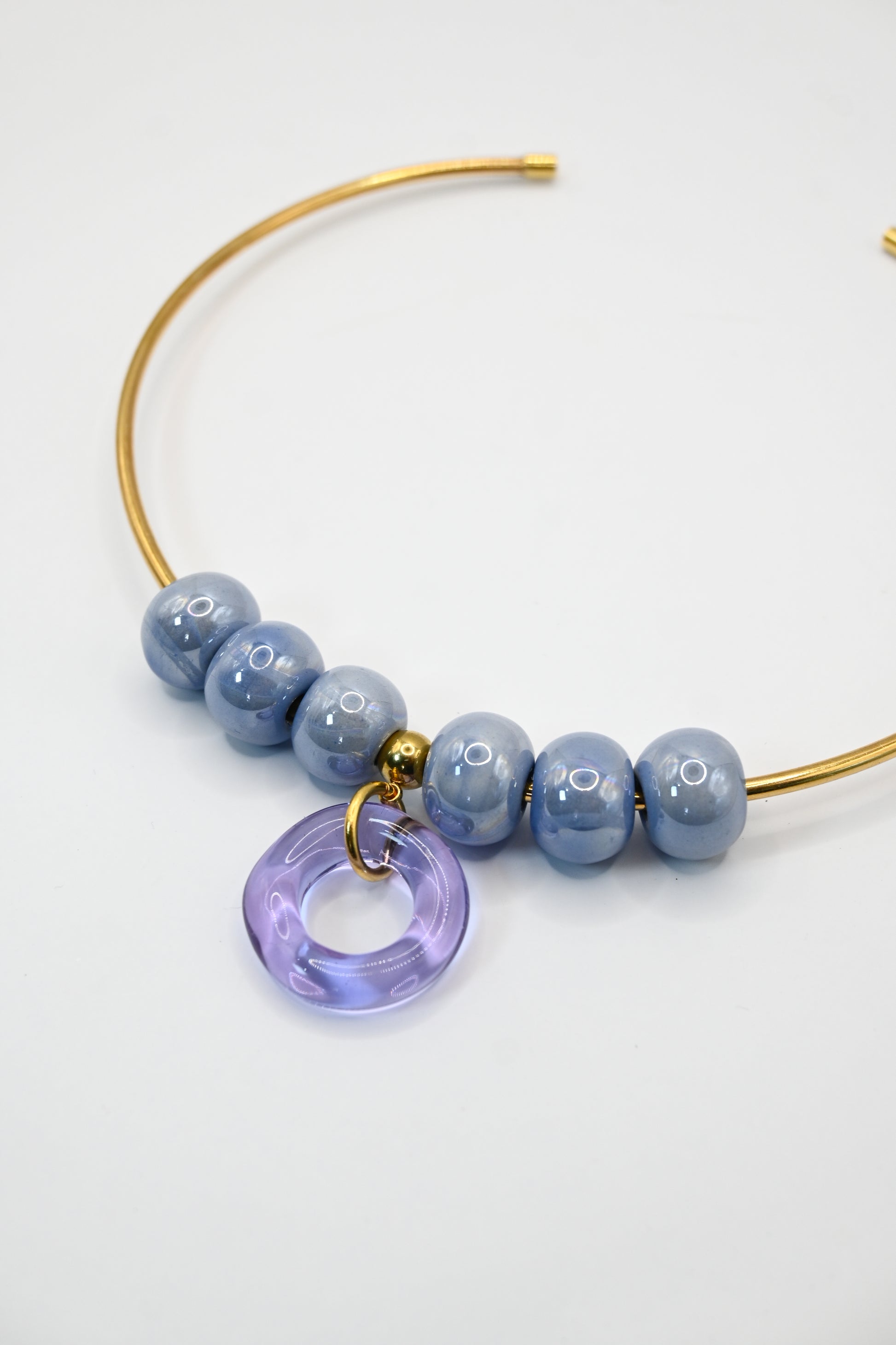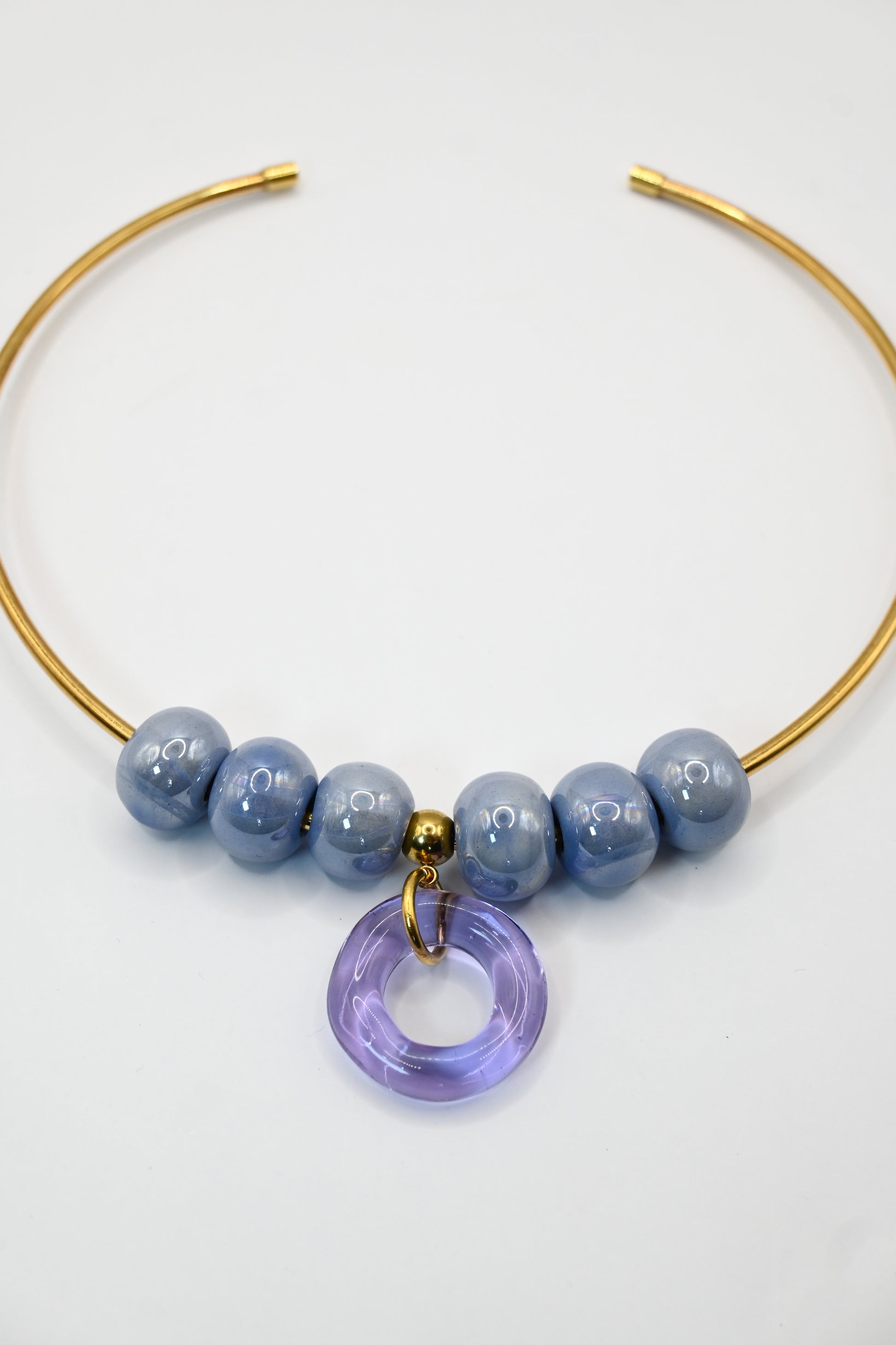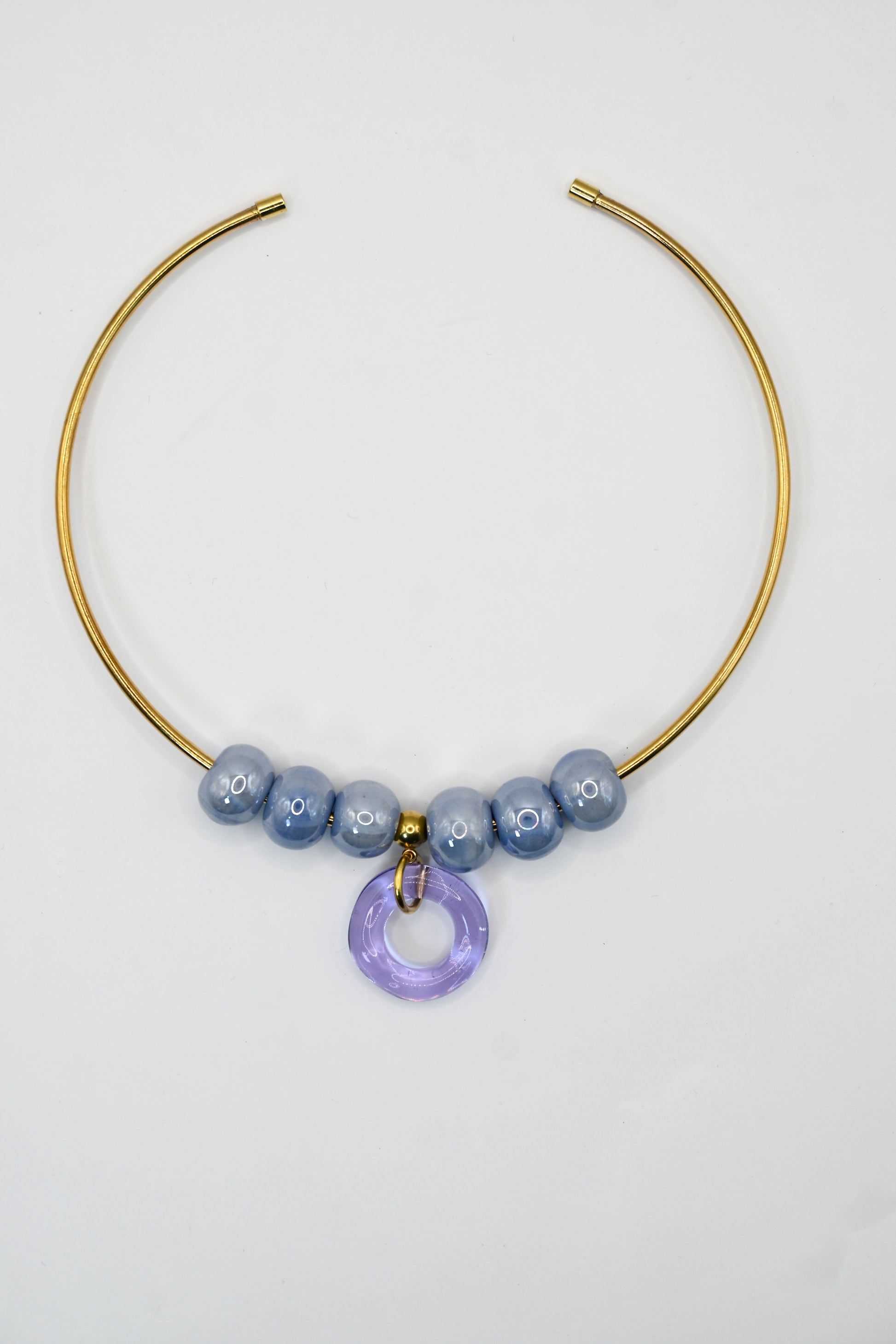 Vidrio borosilicato lila junto con entrepiezas de cerámica (el tinte de la entrepieza puede variar de tonalidad debido a la fabricación manual) y una cadena rígida de metal latón bañado en oro de 24k.
