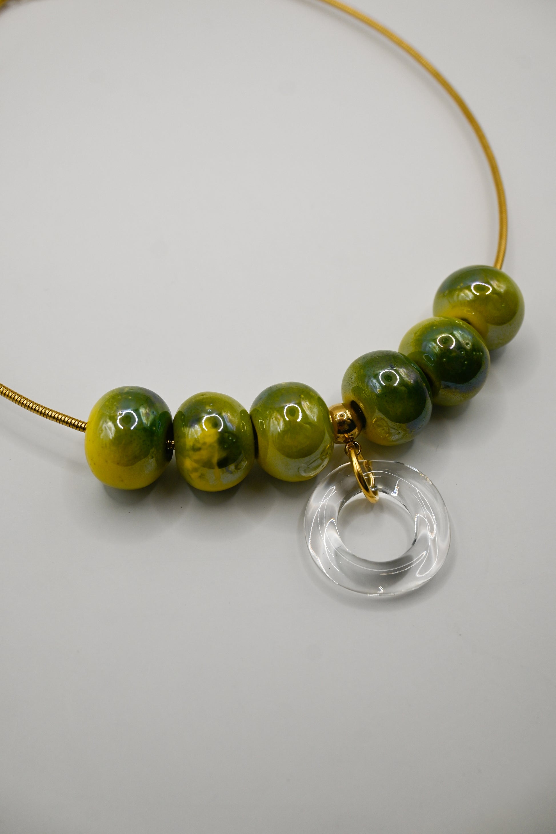 Vidrio borosilicato transparente junto con entrepiezas de cerámica (el tinte de la entrepieza puede variar de tonalidad debido a la fabricación manual) y una cadena rígida de acero inoxidable bañada en oro de 24k.