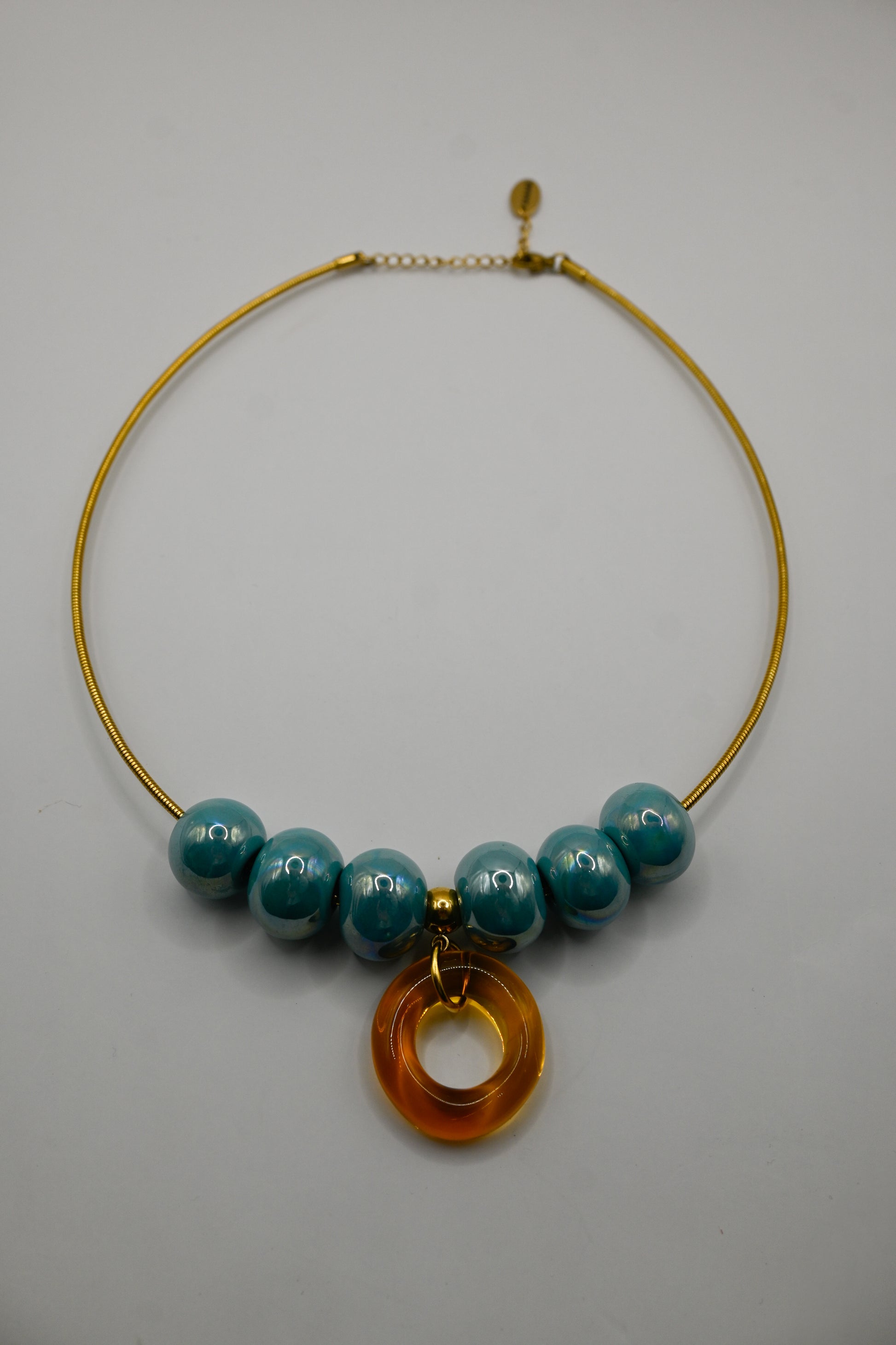 El collar Daiquiri está diseñado para capturar la luminosidad y ligereza de una tarde de verano. Los matices translúcidos del vidrio y el toque de las piezas de cerámica recuerdan al reflejo del sol sobre el agua del atardecer. Su forma orgánica y acabados pulidos aportan una sofisticación perfecta para acompañar un look relajado pero con intención. Ideal para llevar durante un tardeo veraniego: informal, elegante y con carácter.