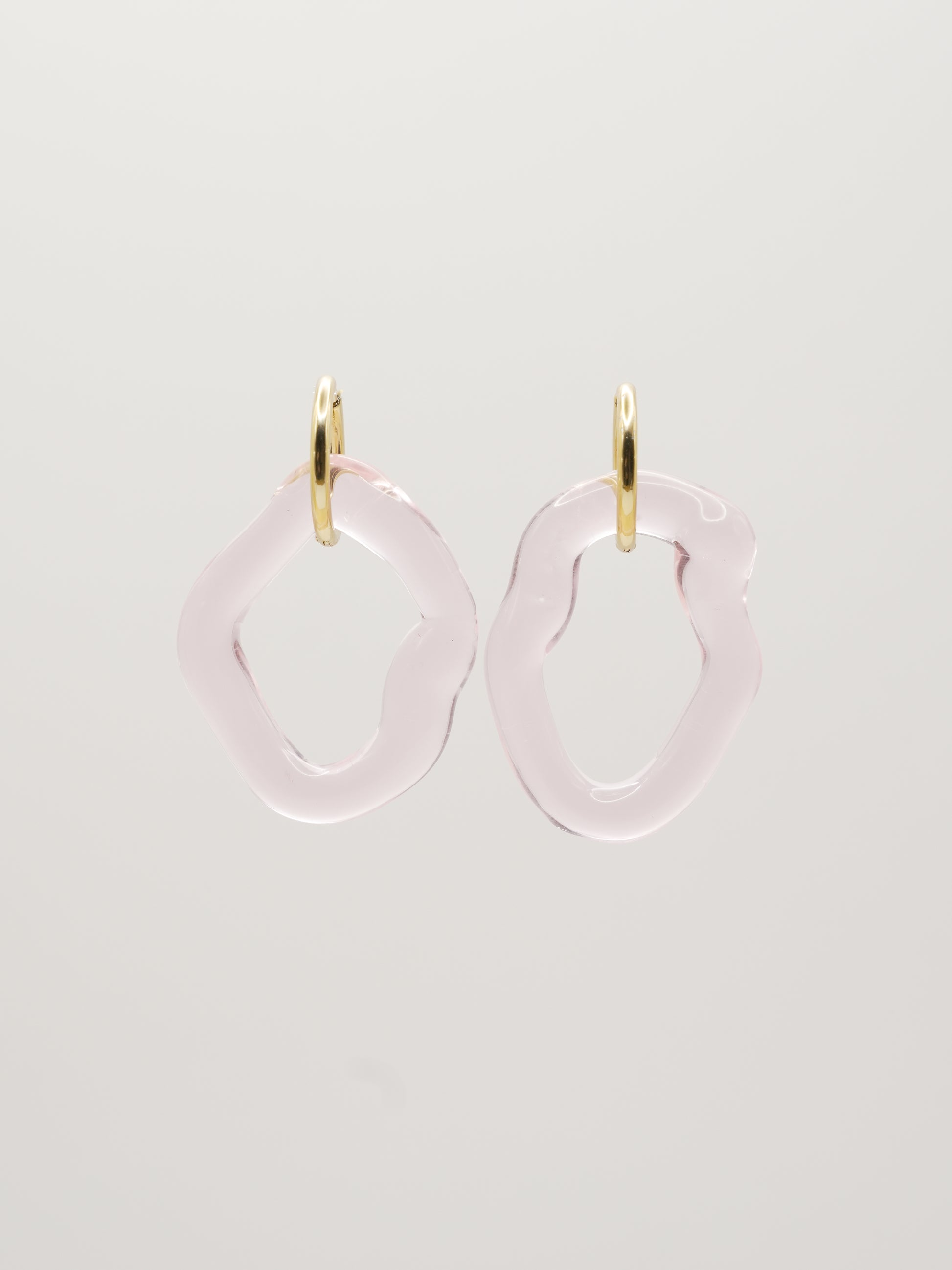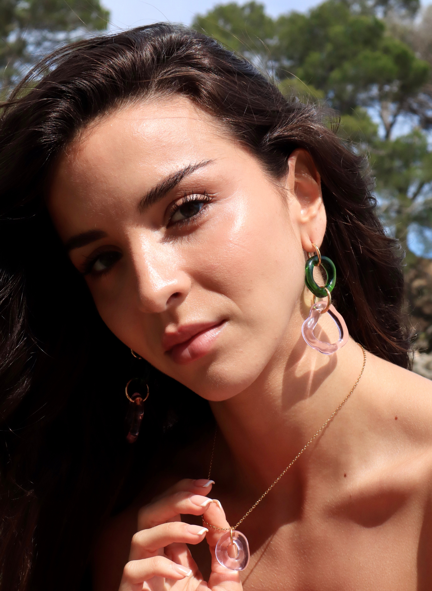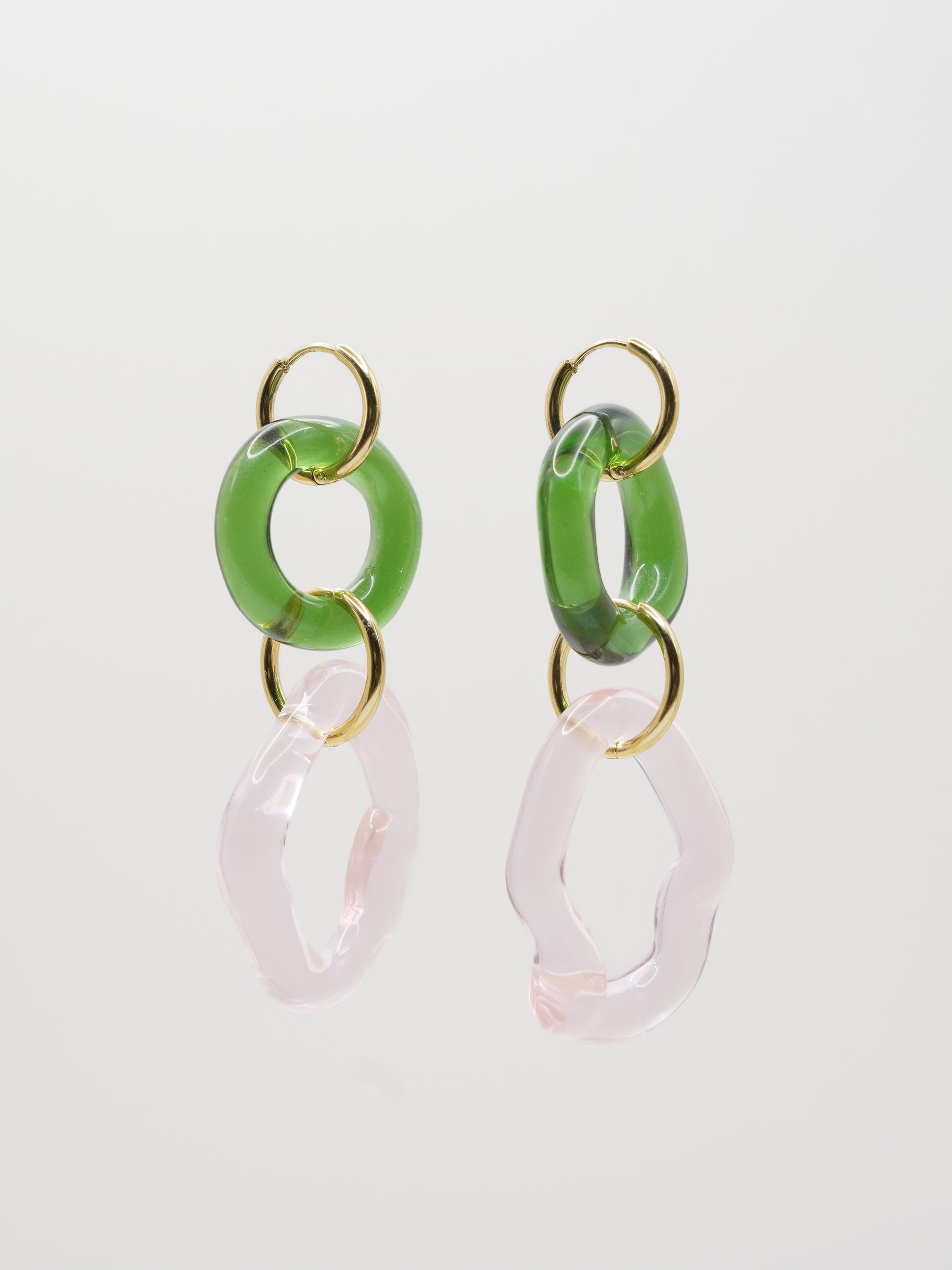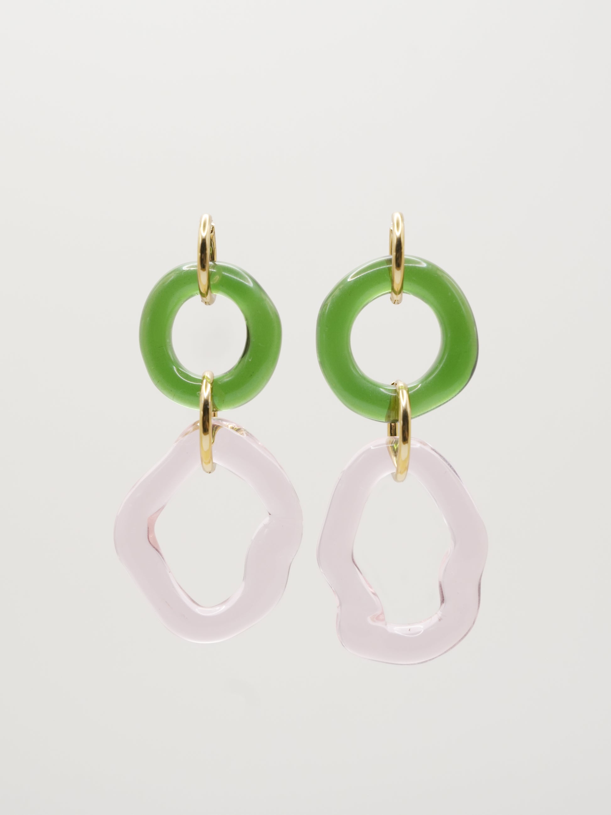 - ORO: Vidrio borosilicato verde y rosa junto con dos aros de acero inoxidable bañados en oro 18k de 12mm y 18mm de diámetro.
