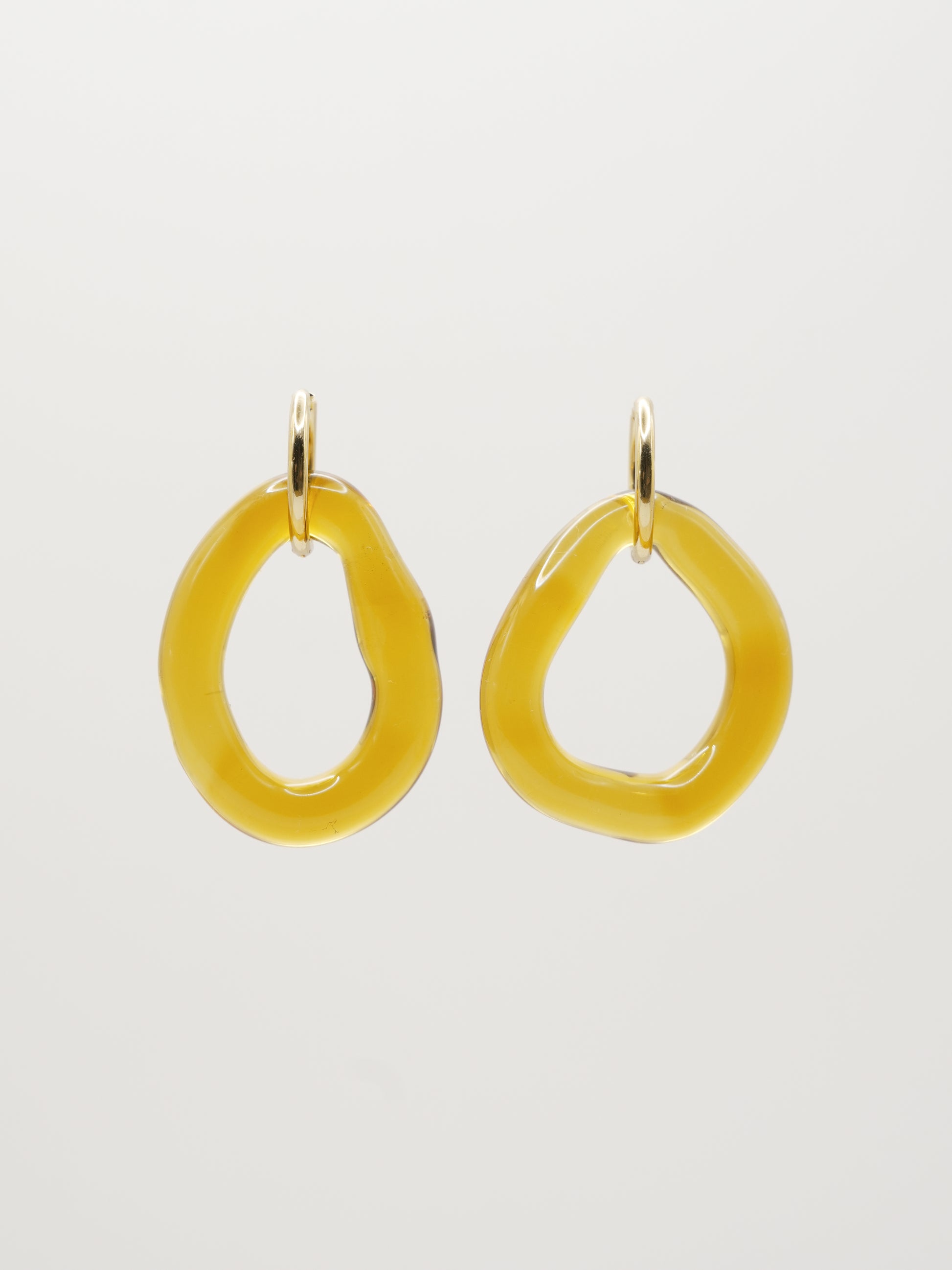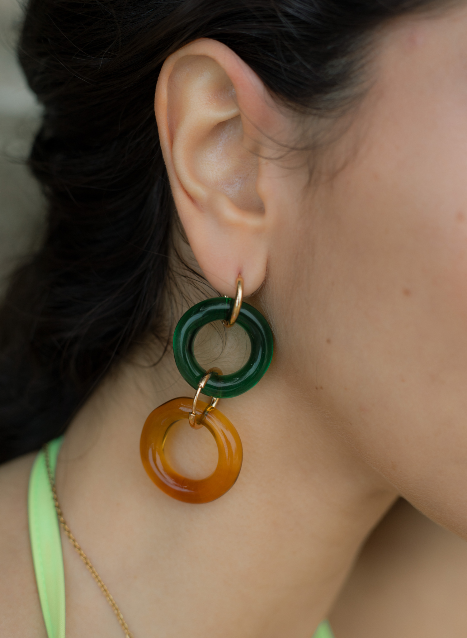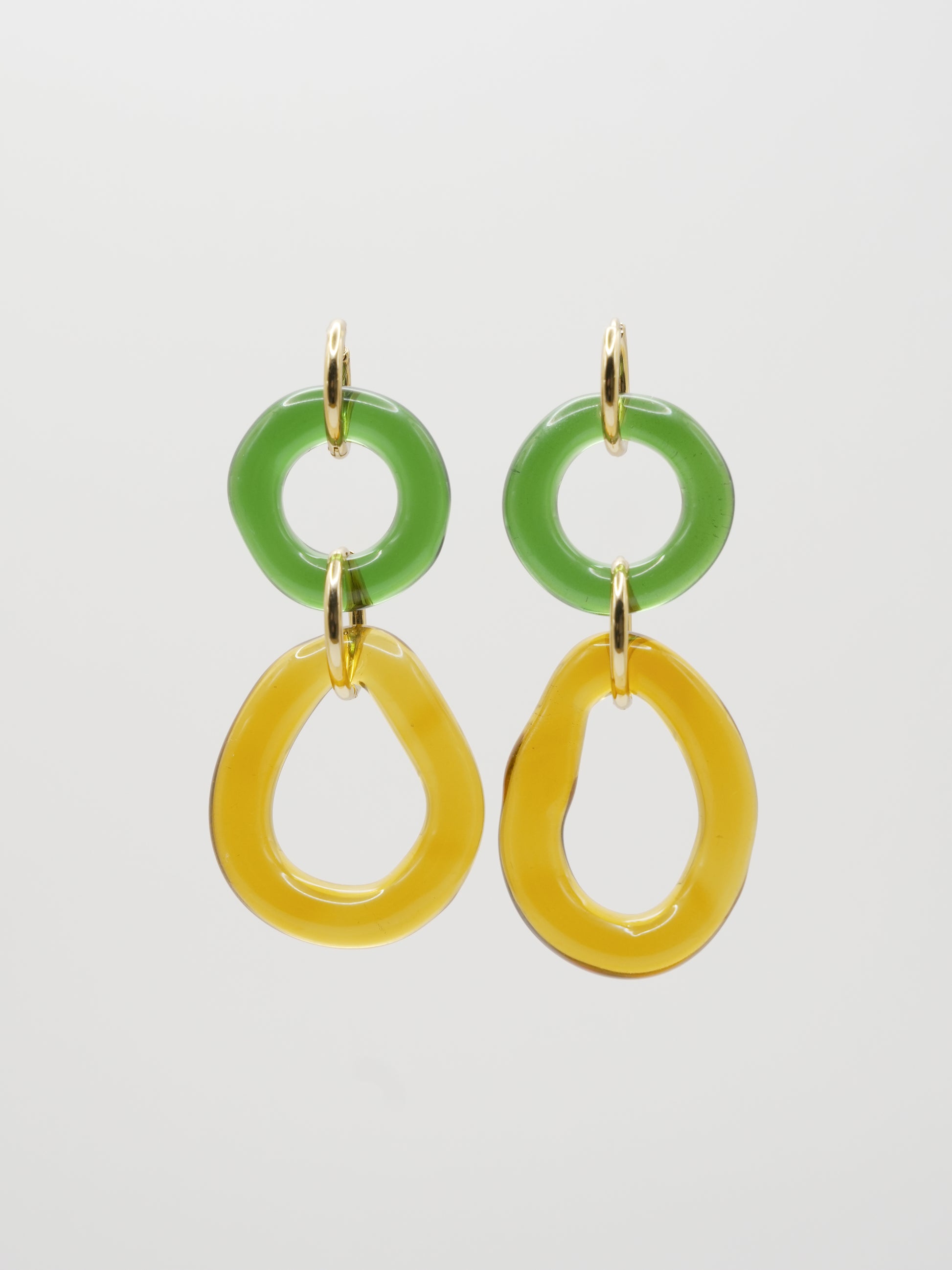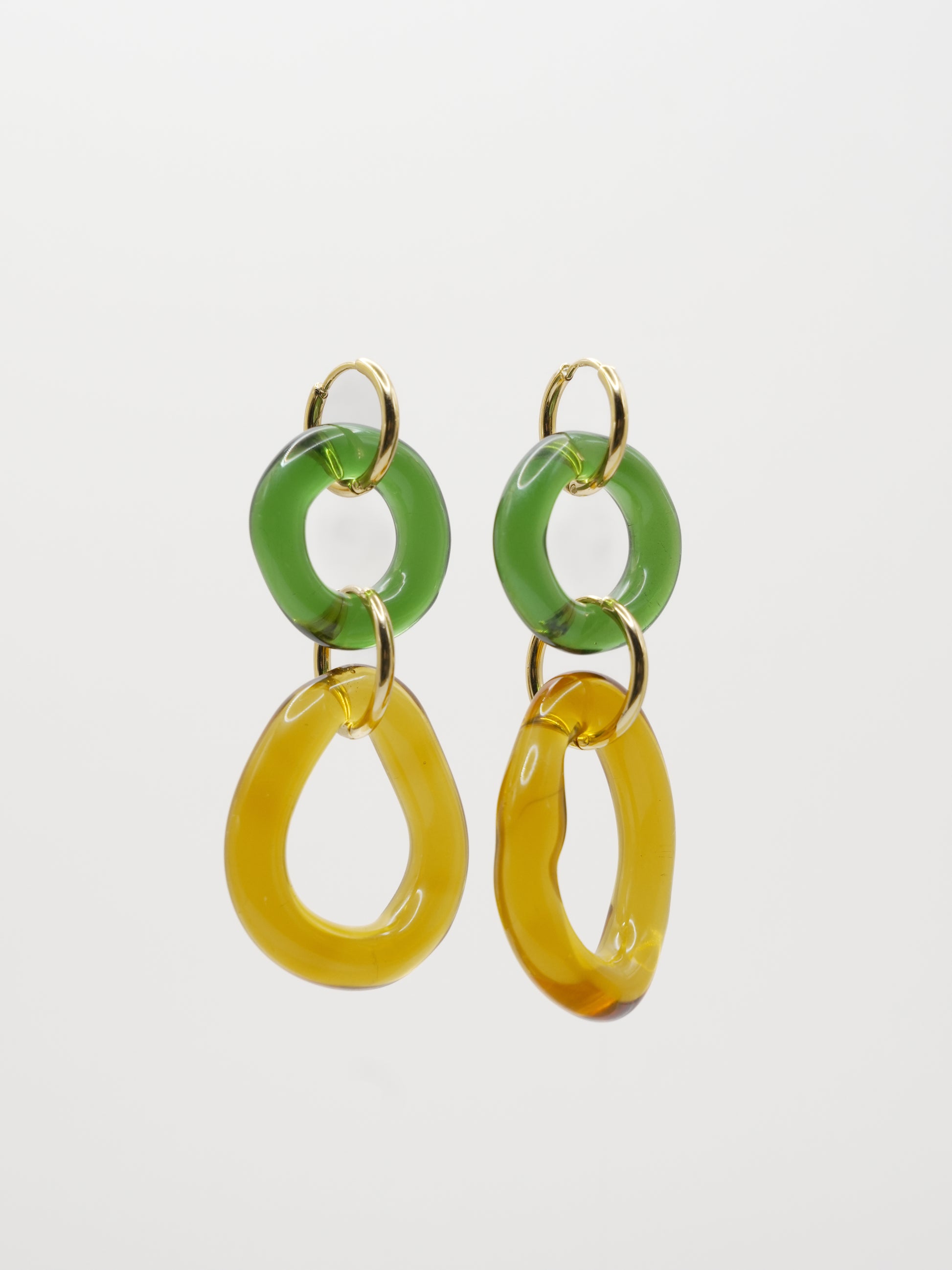 - ORO: Vidrio borosilicato verde y amarillo junto con dos aros de acero inoxidable bañados en oro 18k de 12mm y 18mm de diámetro.