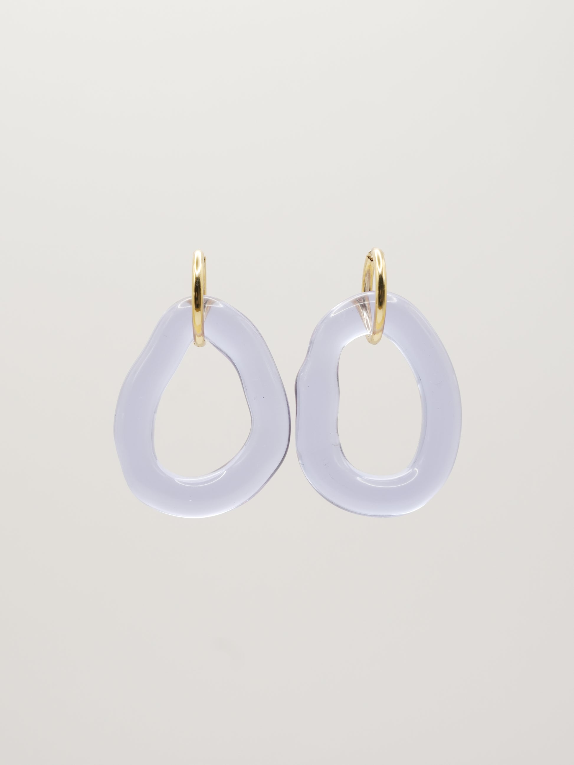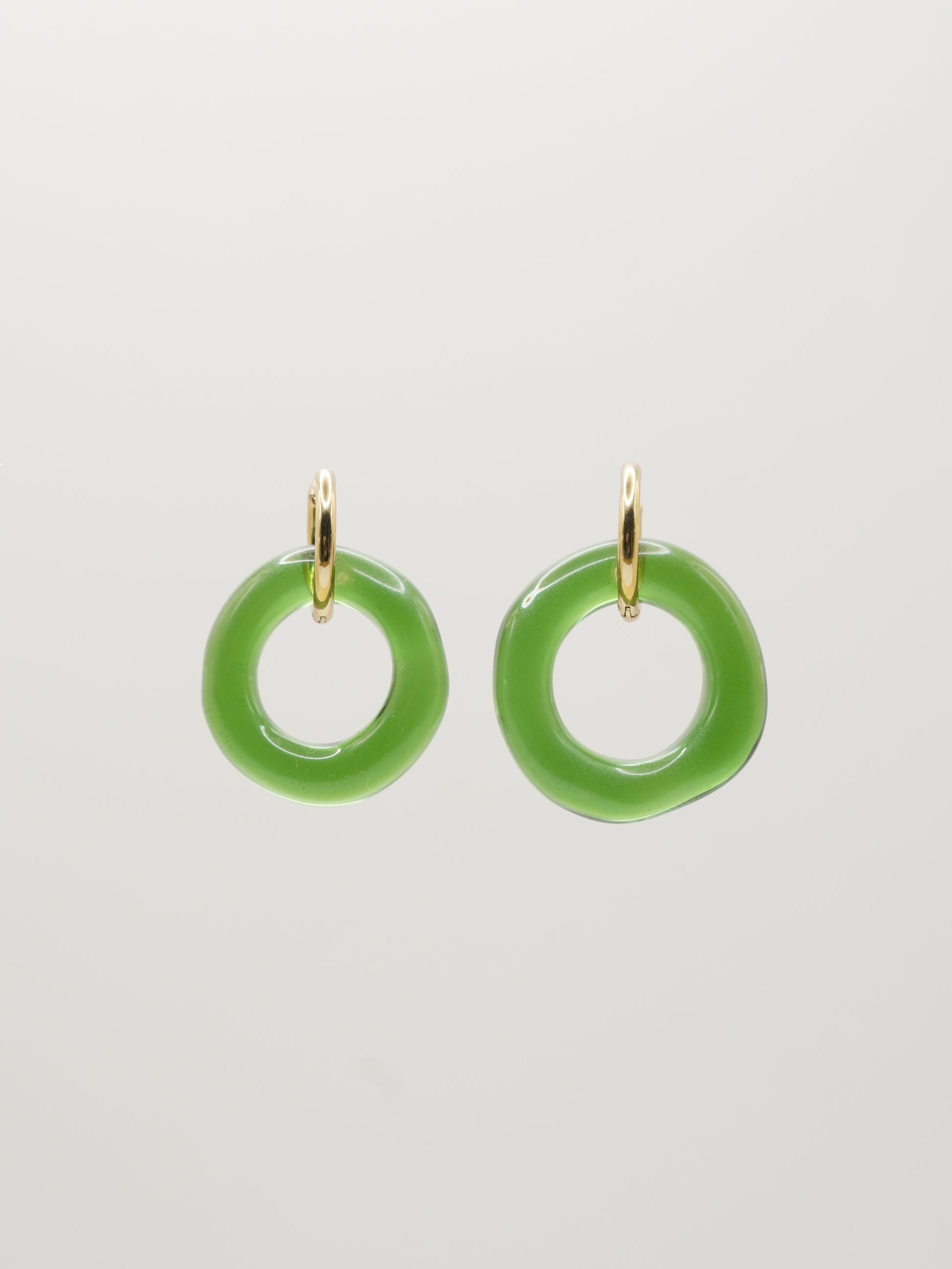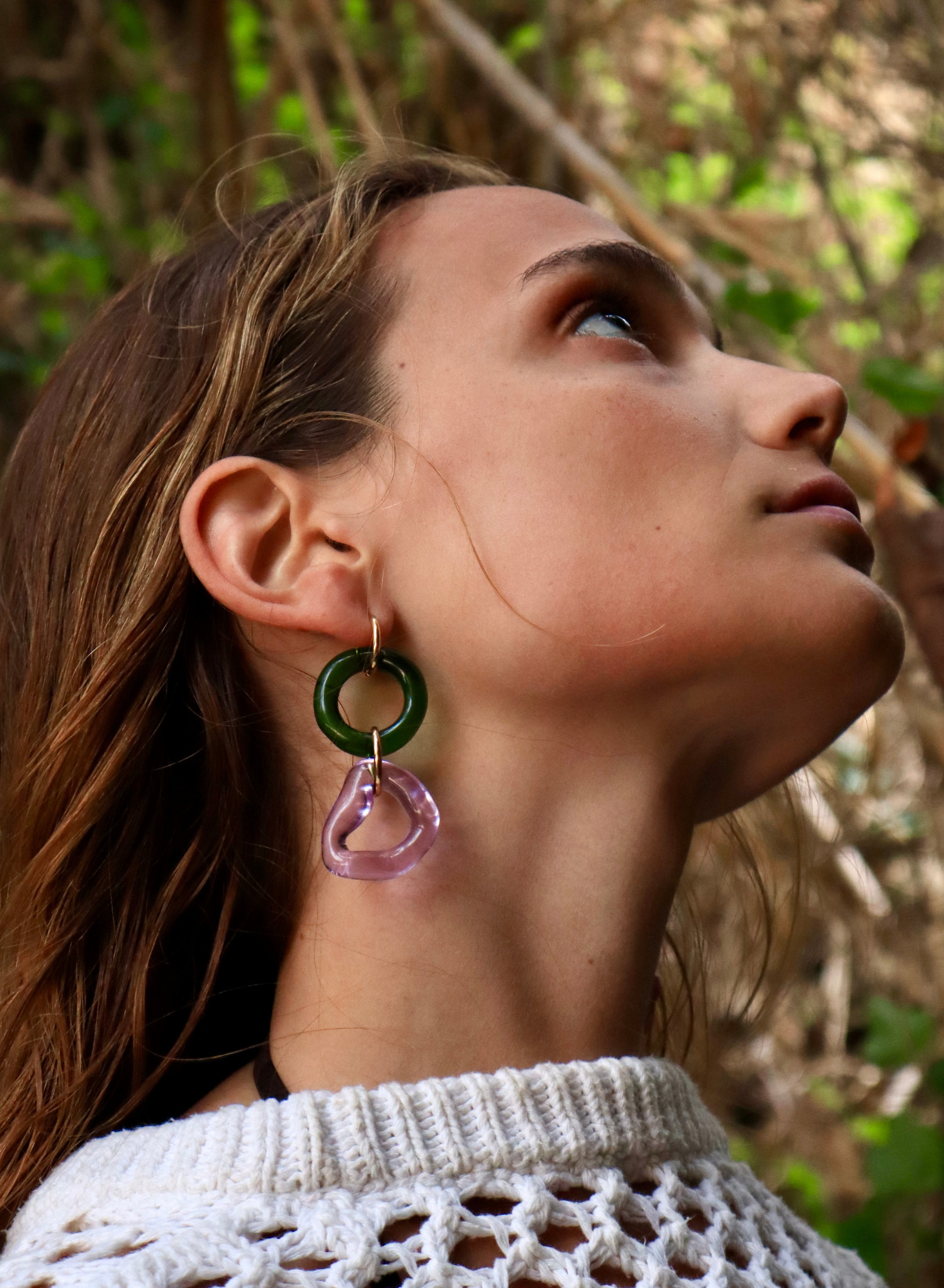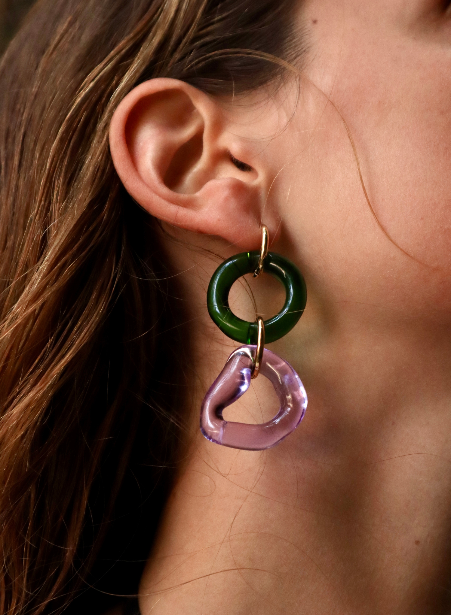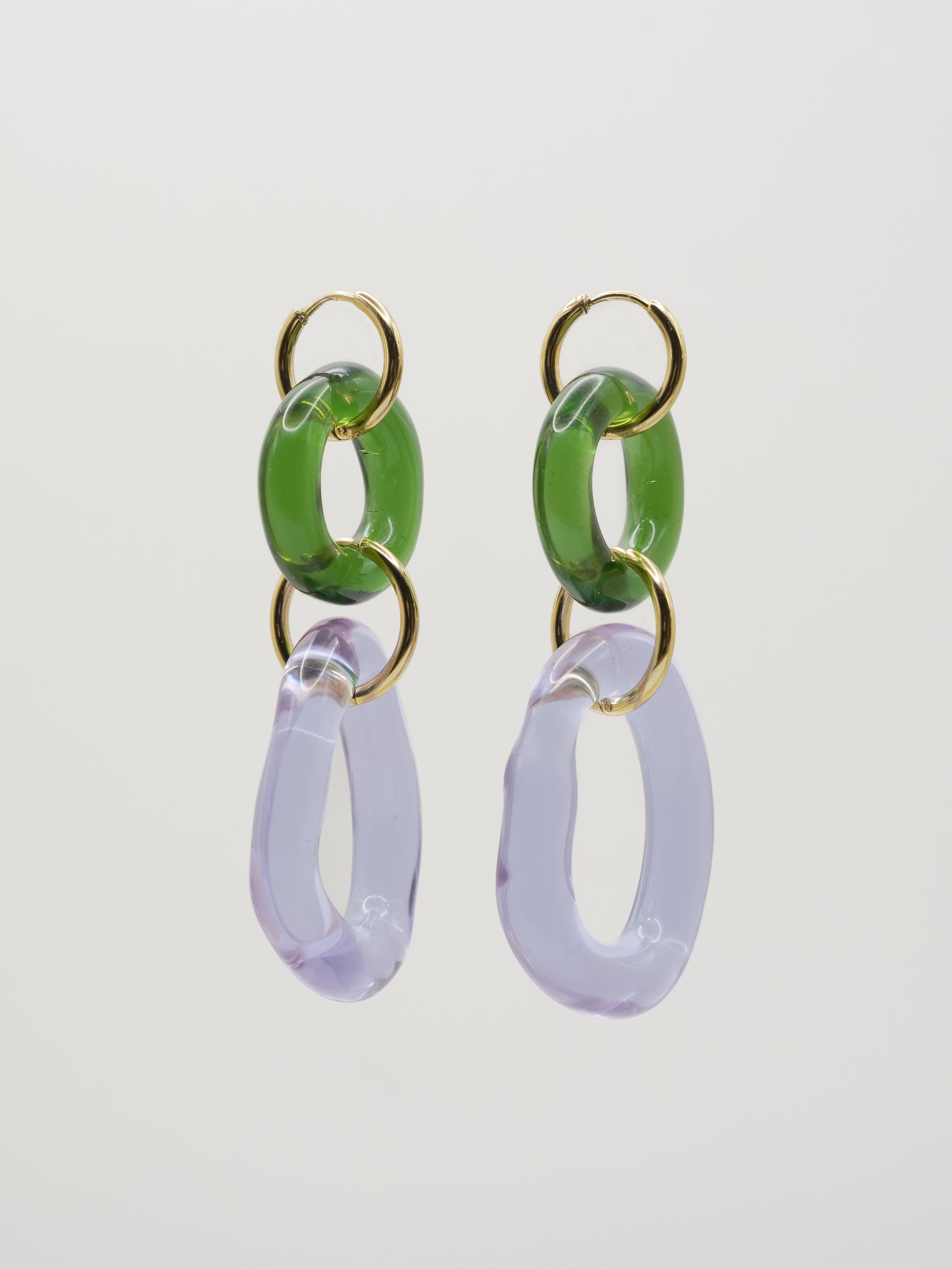 - ORO: Vidrio borosilicato verde y lila junto con dos aros de acero inoxidable bañados en oro 18k de 12mm y 18mm de diámetro.