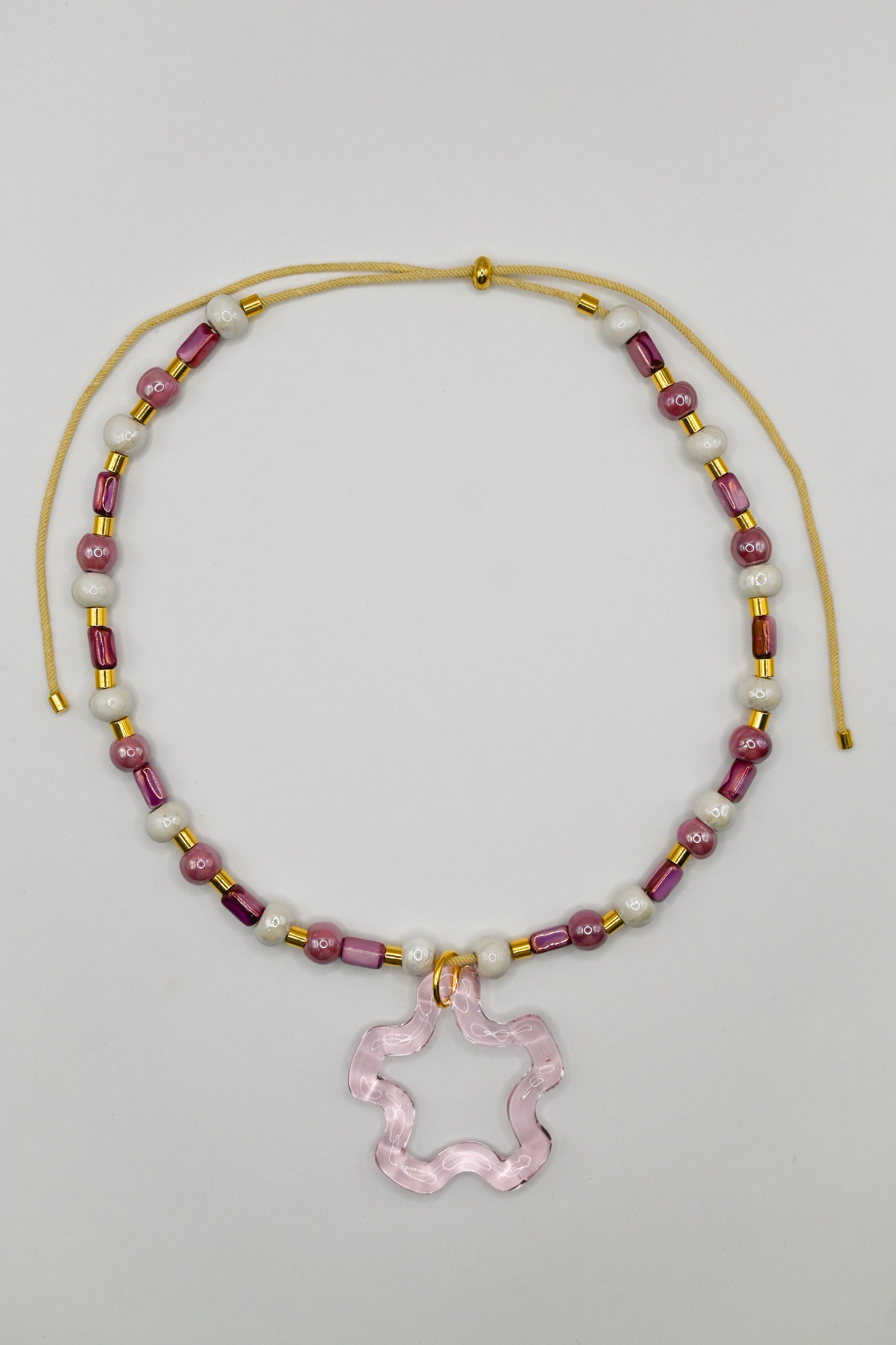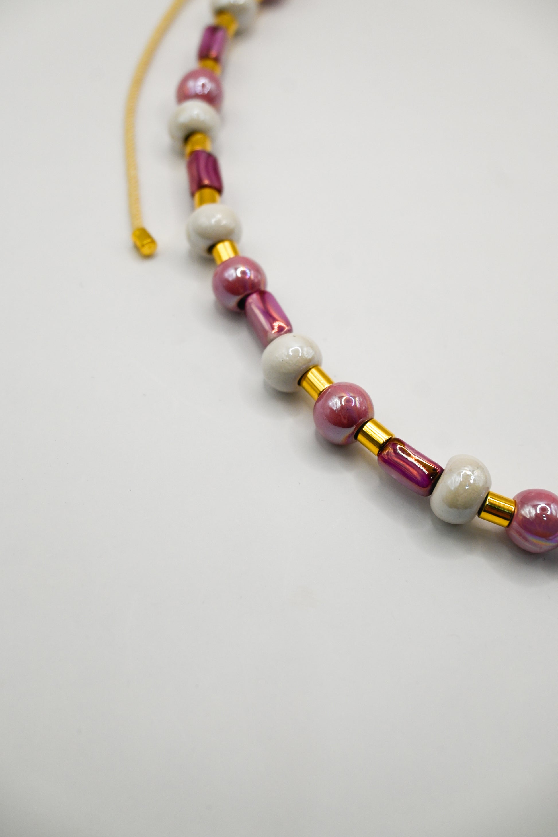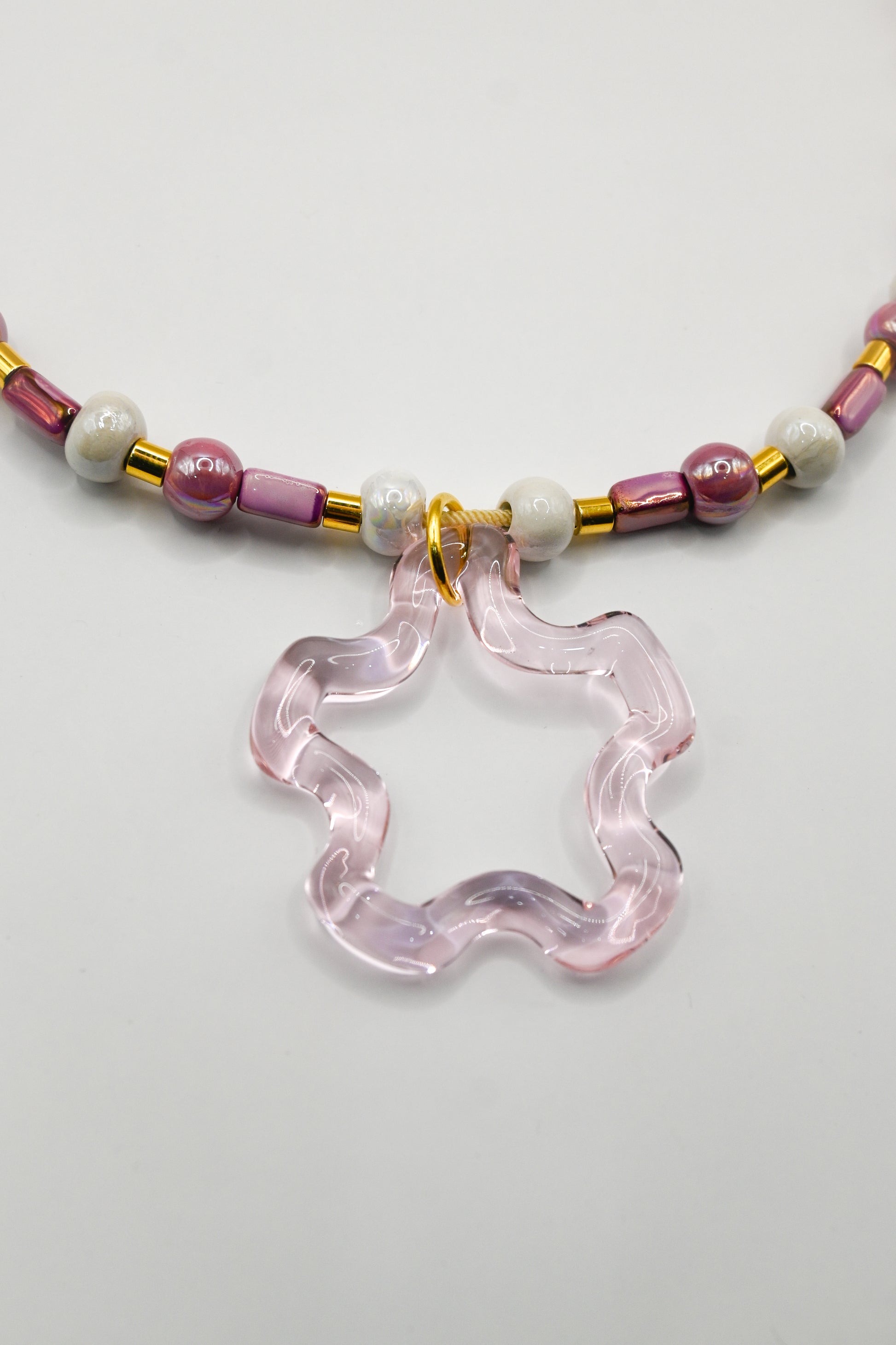 Este collar hecho a mano con vidrio y entrepiezas de cerámica presenta una estética artesanal y natural. La pieza central de forma irregular rosa representando el cielo de las noches de verano, moldeada a mano con detalles únicos y texturas fascinantes. Esta combinación crea una pieza de joyería que destaca por su luz, pero al mismo tiempo, por su singularidad y belleza artesanal.