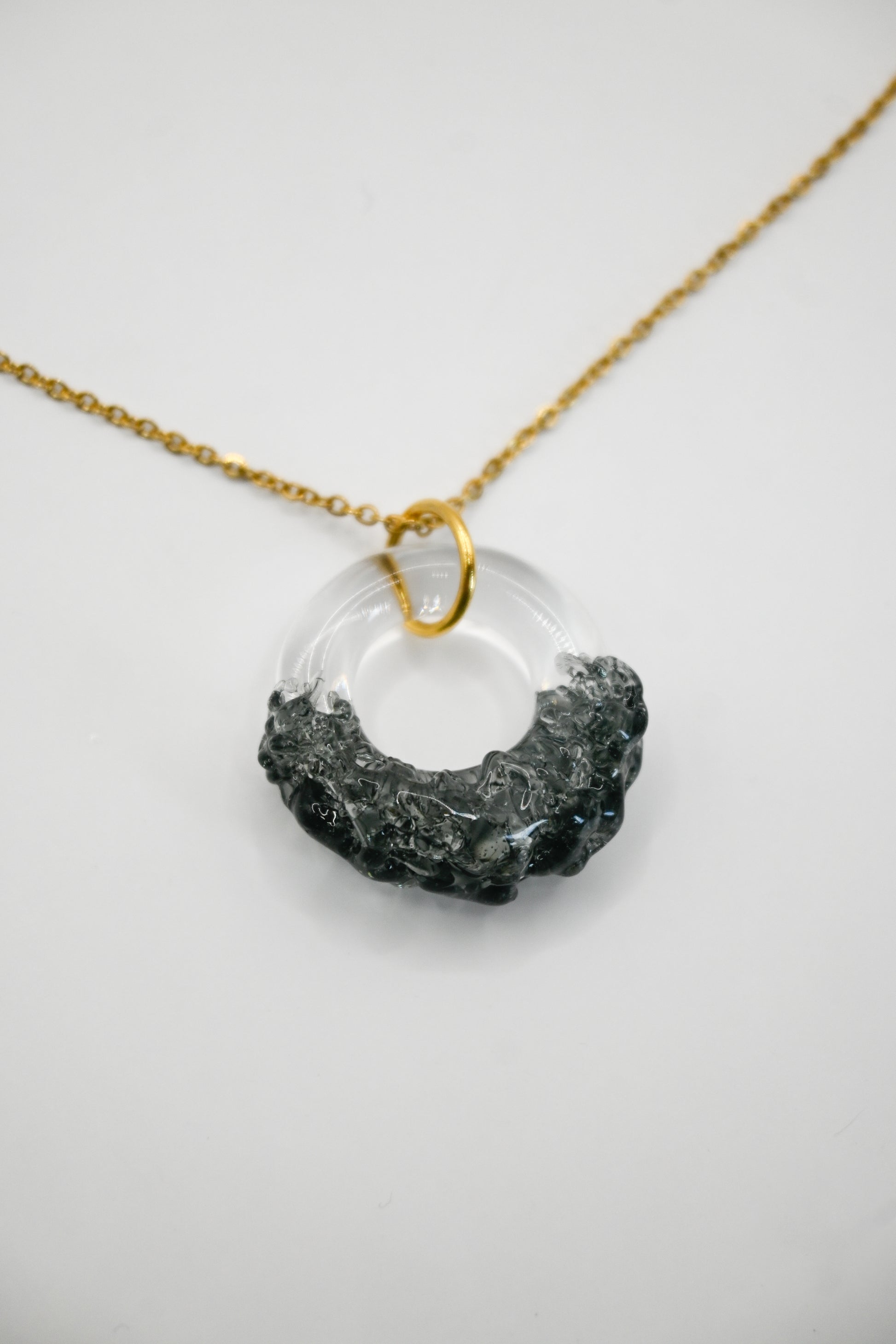 - Oro: Vidrio borosilicato transparente y negro y cadena de acero inoxidable bañado en oro de 18k de 45cm.
