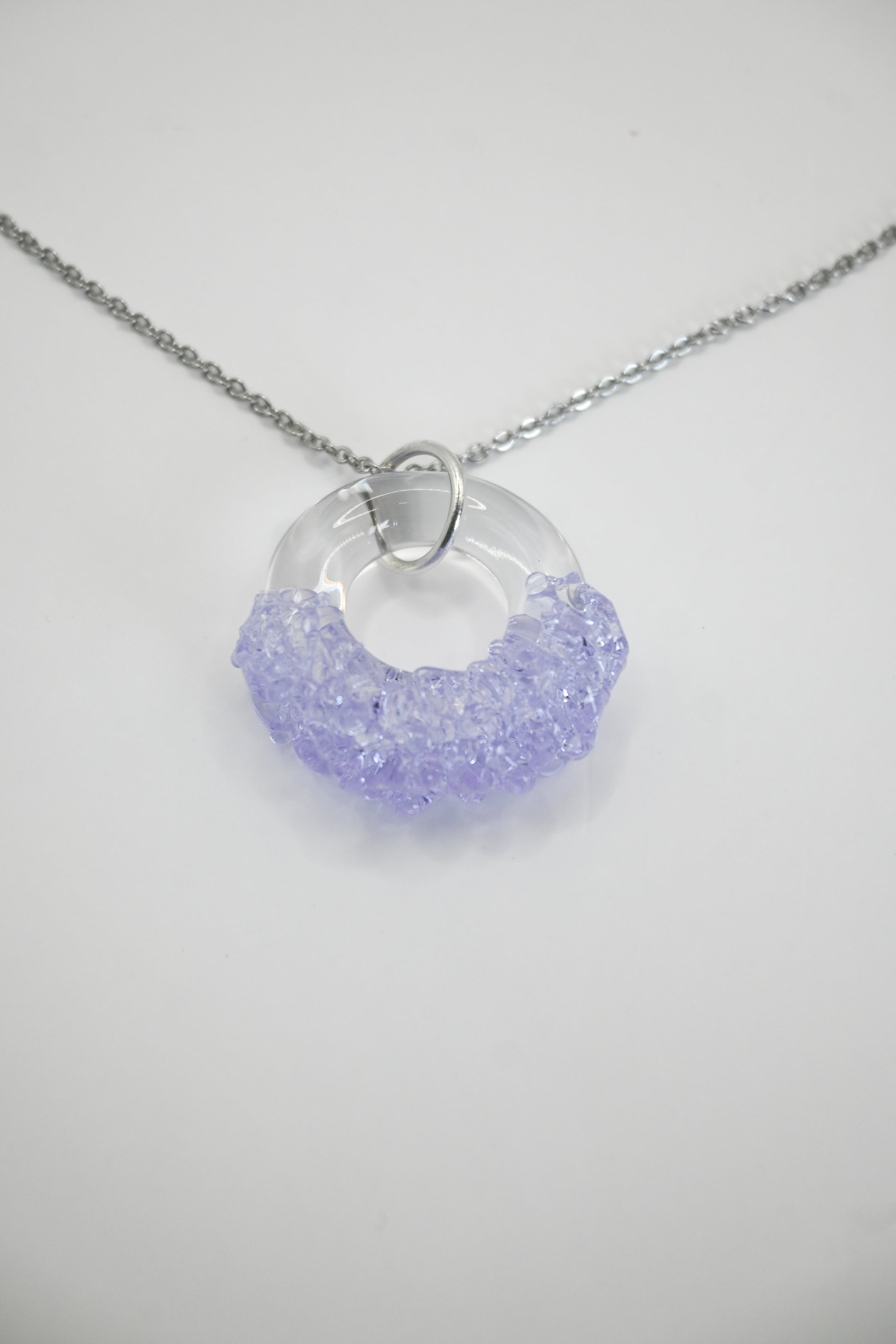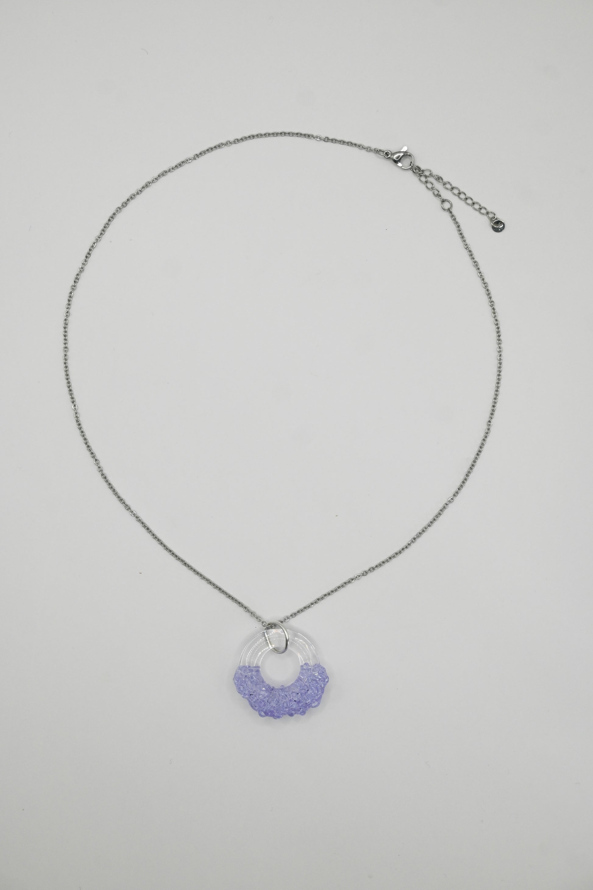 - Plata: Vidrio borosilicato transparente y lila y cadena de acero inoxidable de 45cm.