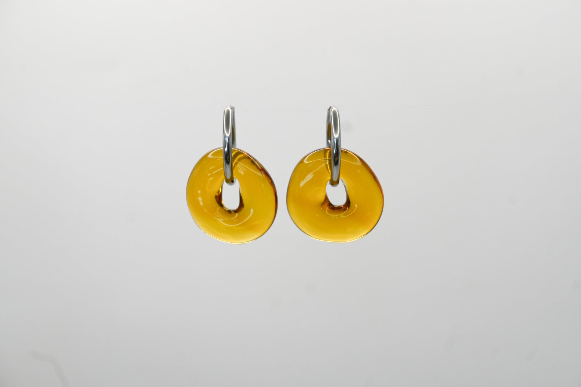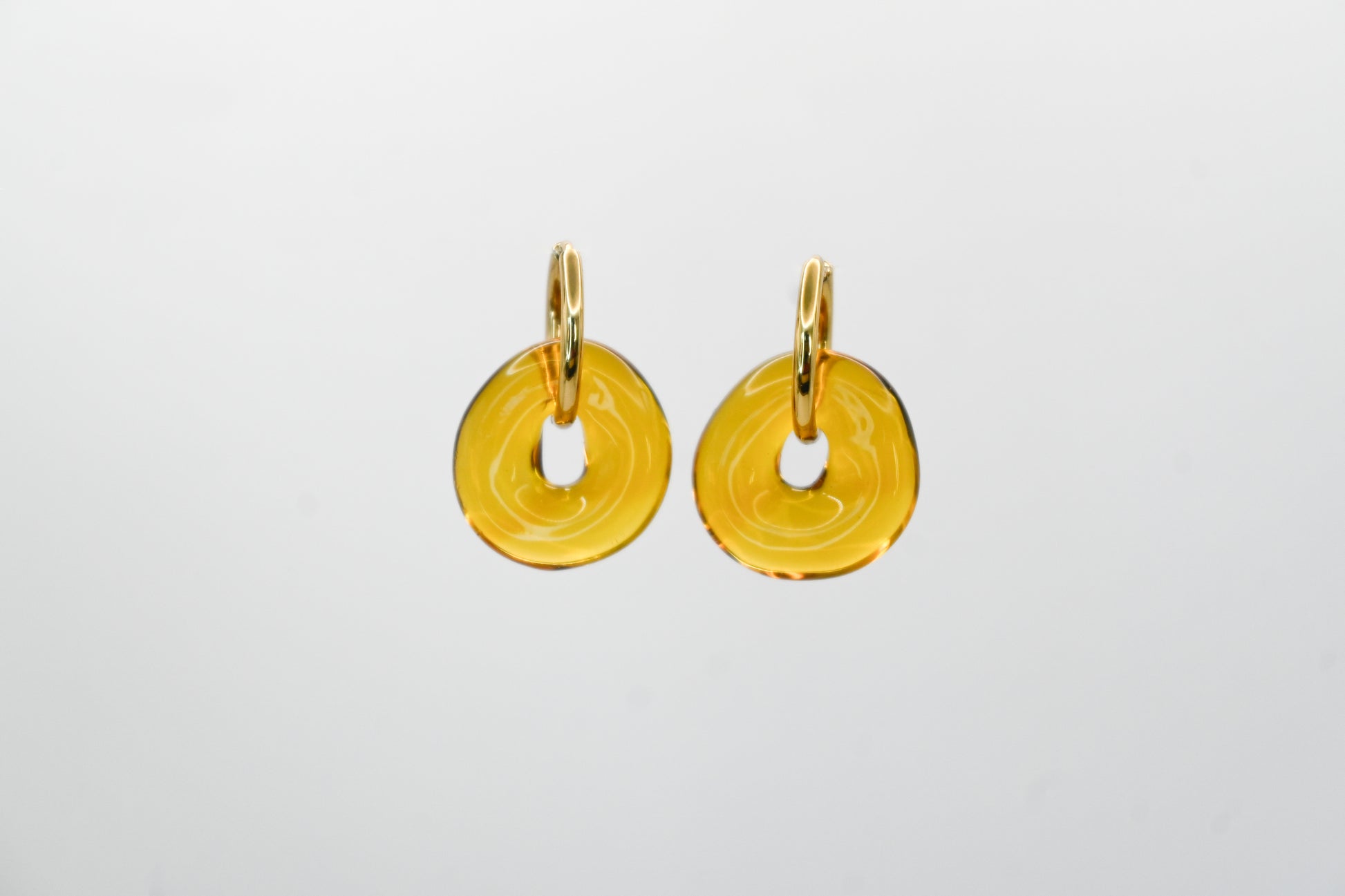 Los pendientes Jarabacoa consisten en una especie de redonda de vidrio borosilicato amarillo hecha a mano con aros. Las redondas de vidrio proporcionan un soporte elegante, creando un contraste atractivo entre los materiales. Este diseño simple pero refinado puede adaptarse a una variedad de estilos y ocasiones.