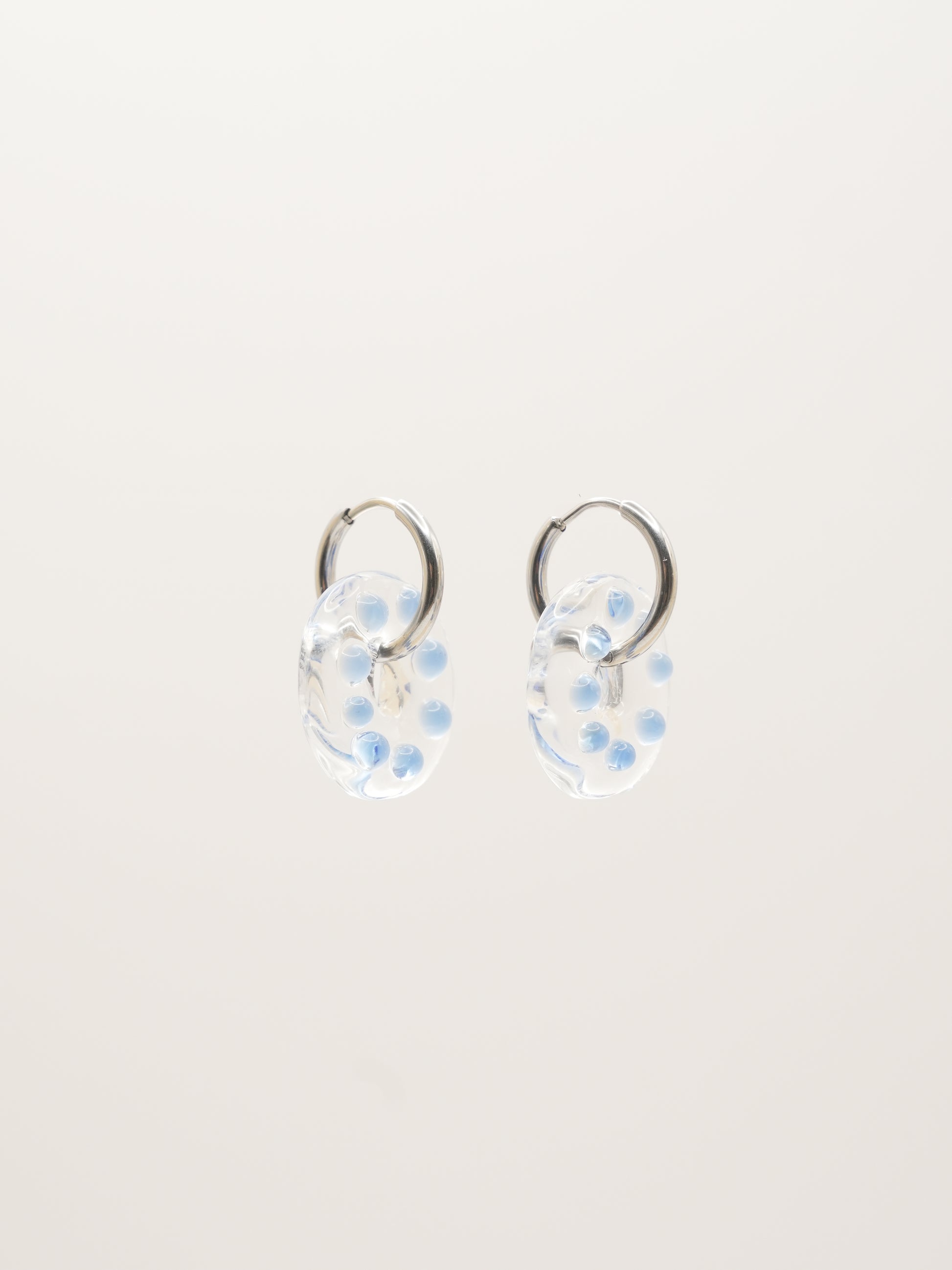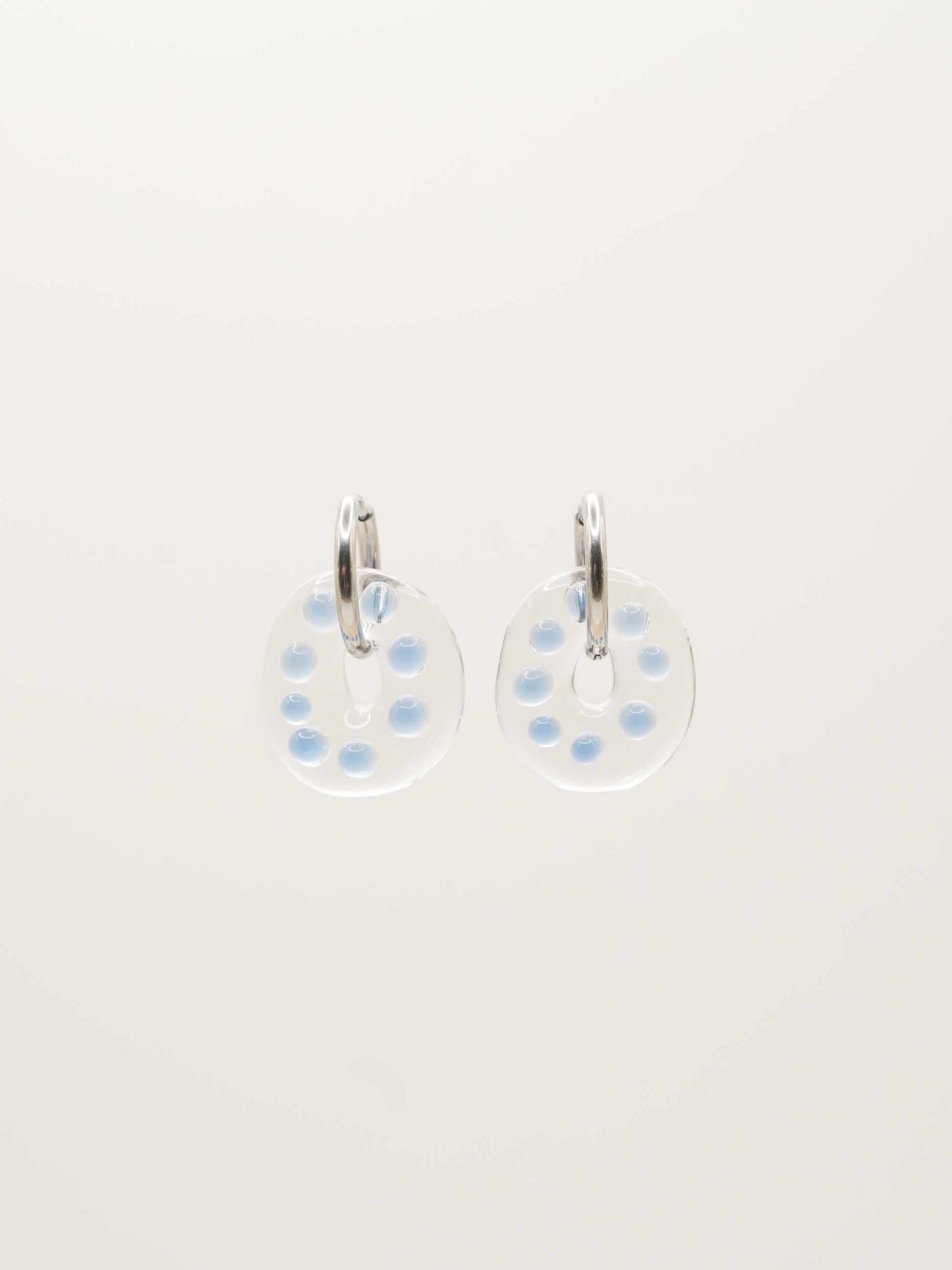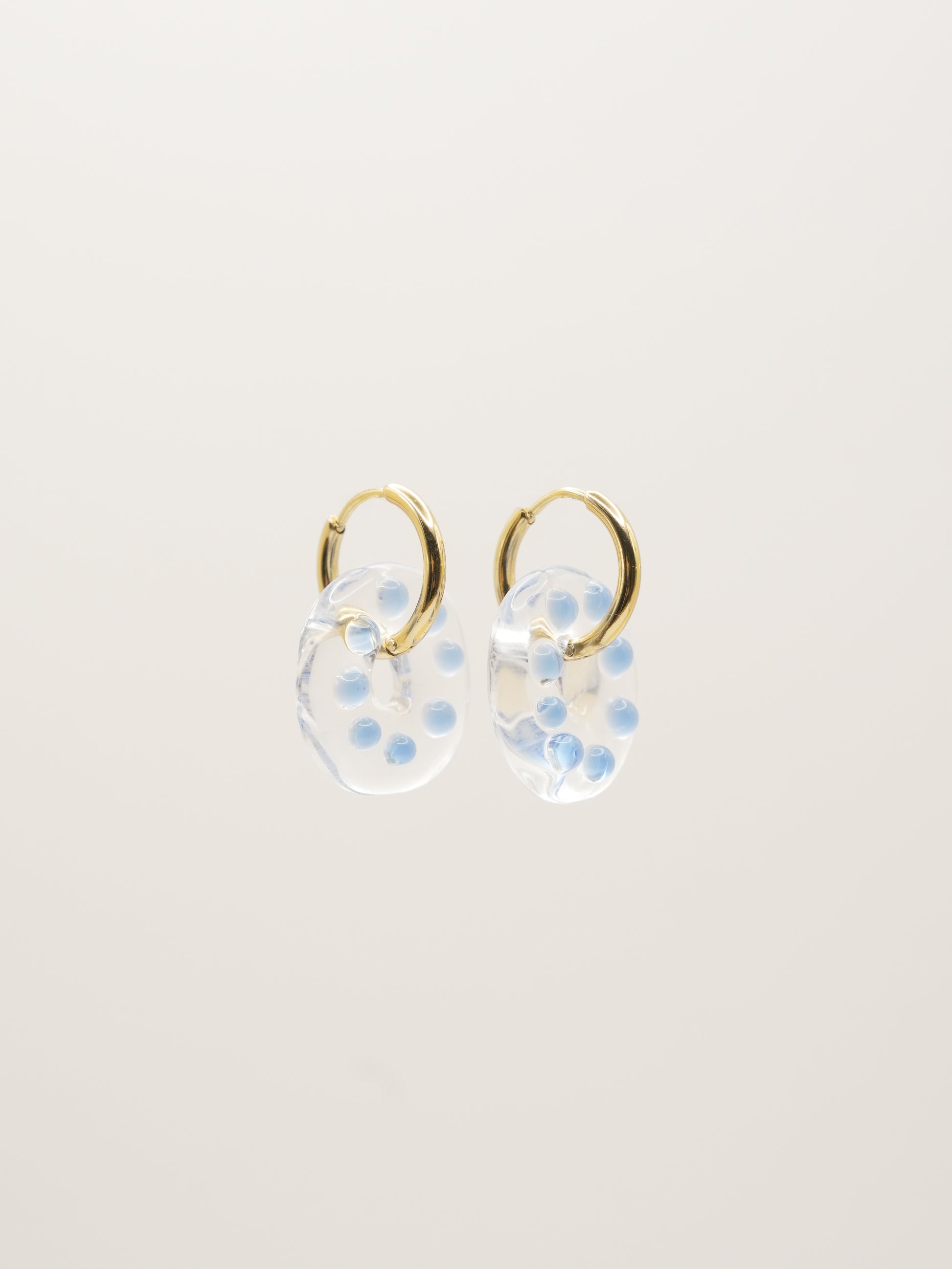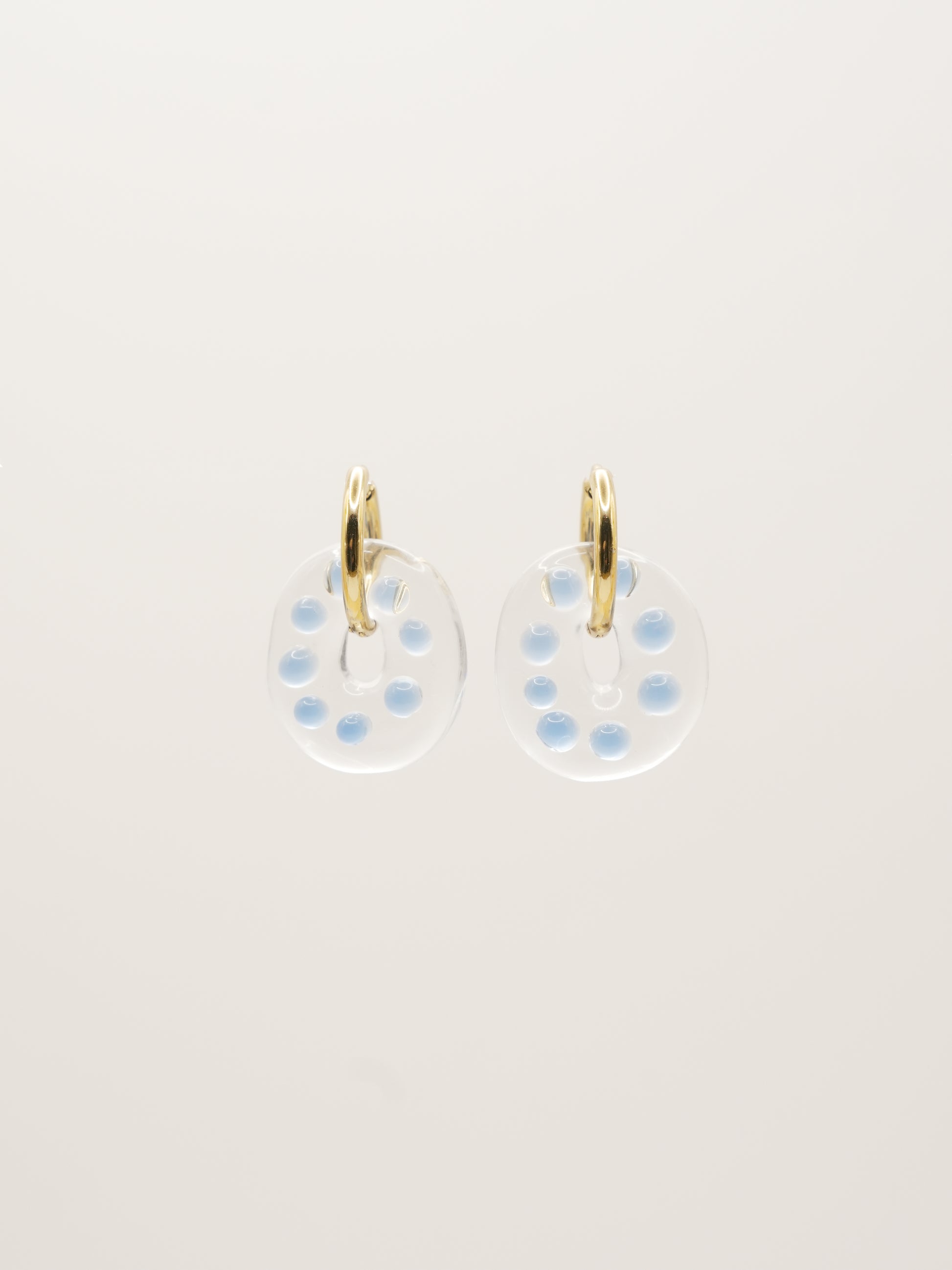 Los pendientes Jarabacoa consisten en una especie de redonda de vidrio borosilicato transparente con puntos azules hecha a mano con aros. Las redondas de vidrio proporcionan un soporte elegante, creando un contraste atractivo entre los materiales. Este diseño simple pero refinado puede adaptarse a una variedad de estilos y ocasiones.