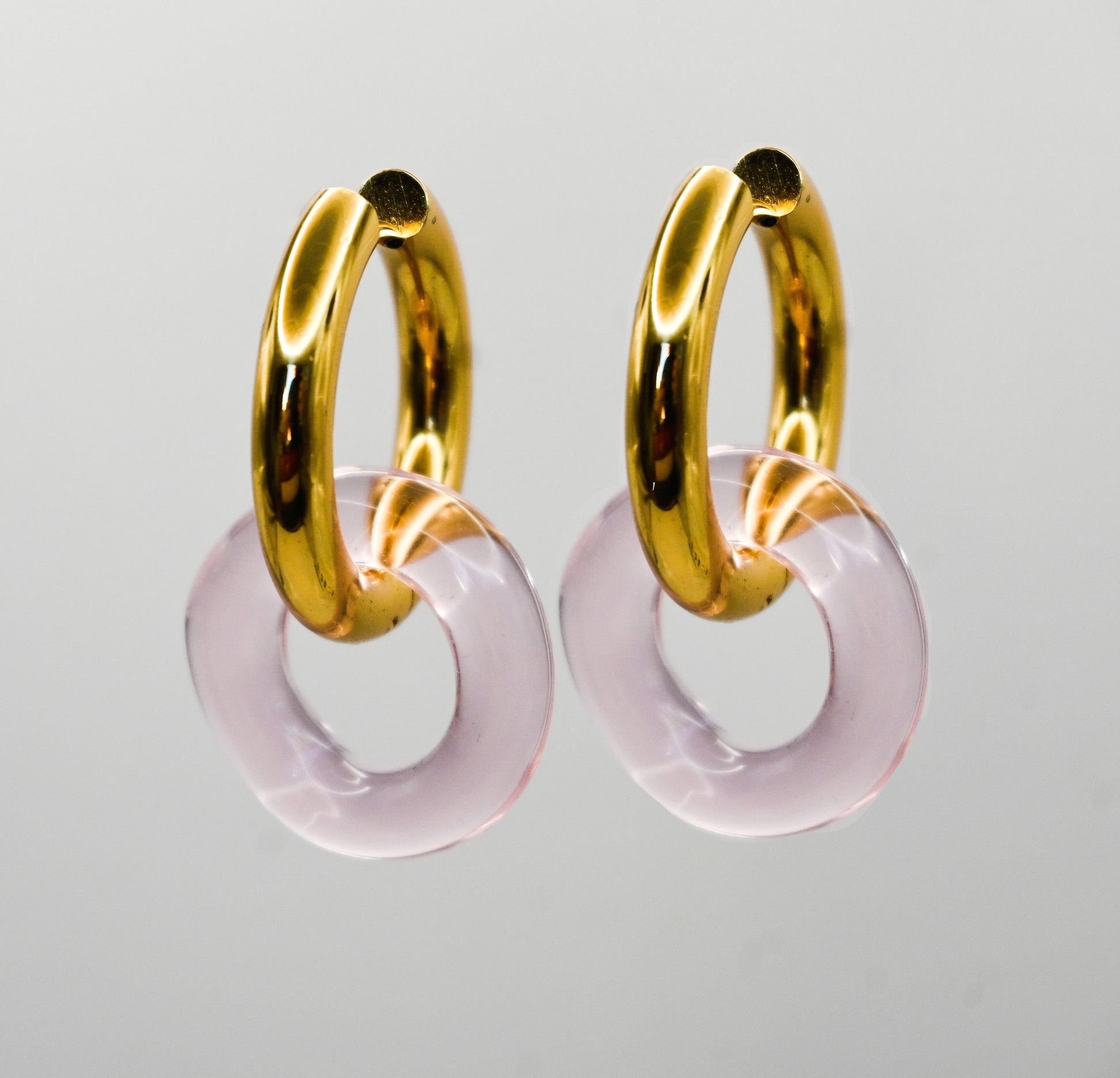 - ORO: Vidrio borosilicato rosa y aro de acero inoxidable bañado en oro de 18k de 30mm de diámetro y 5mm de ancho.