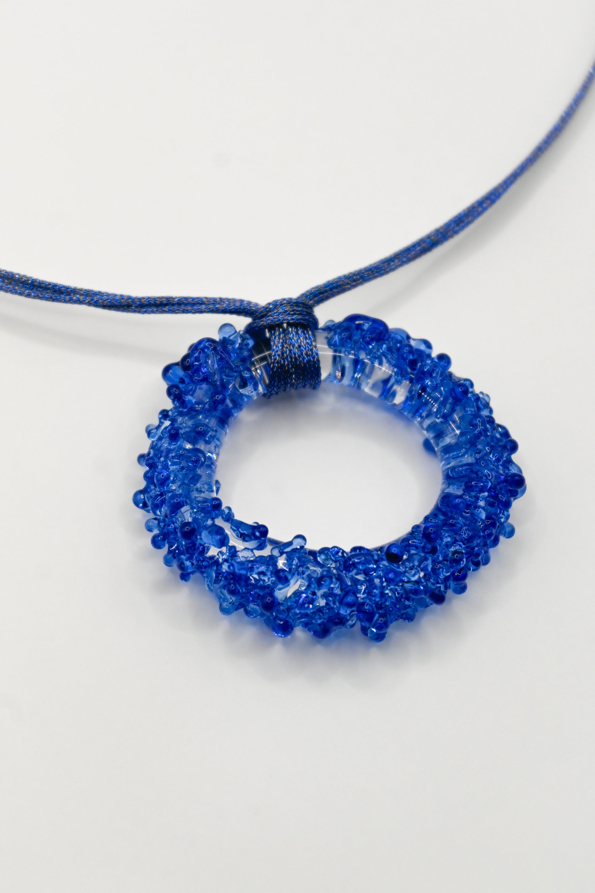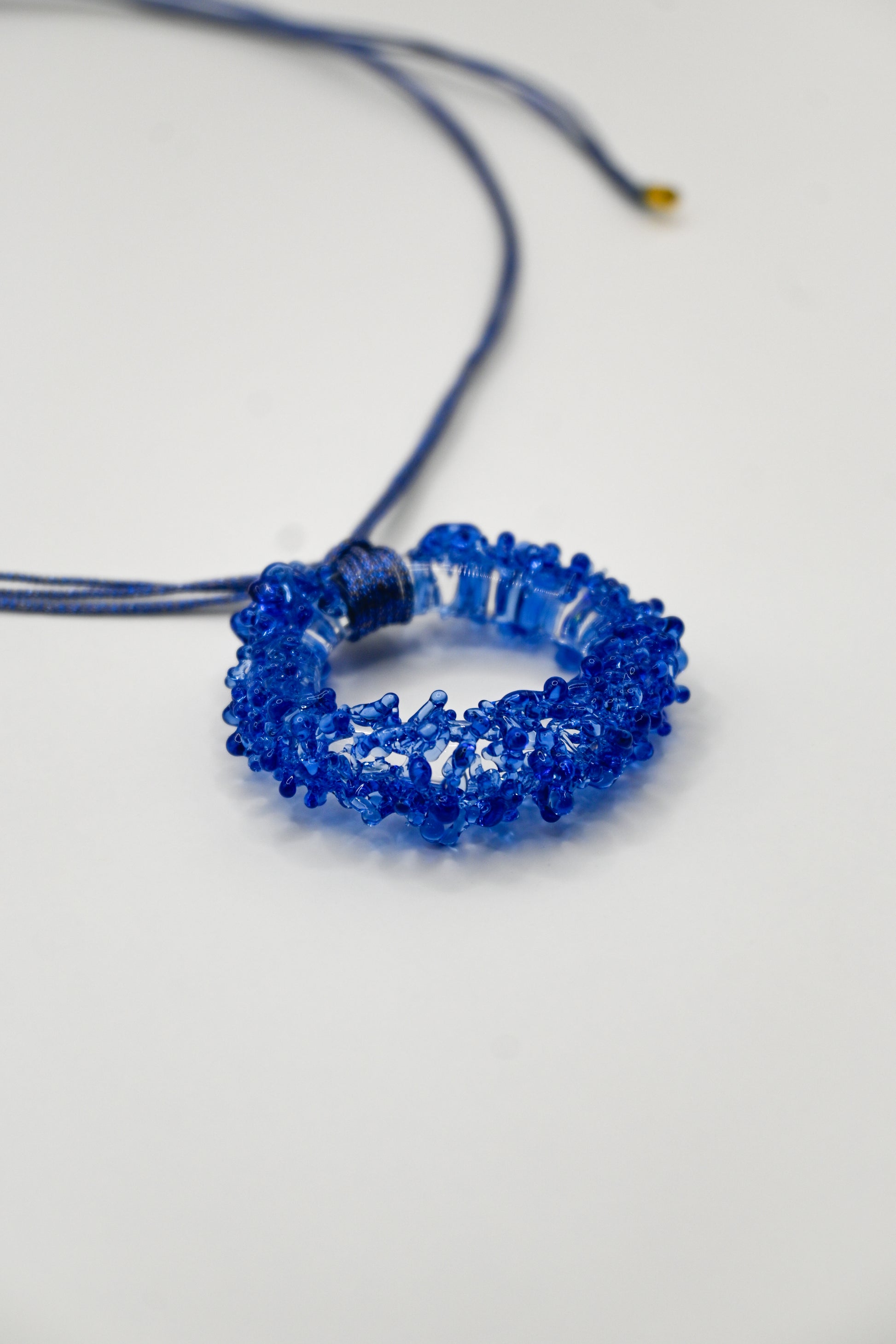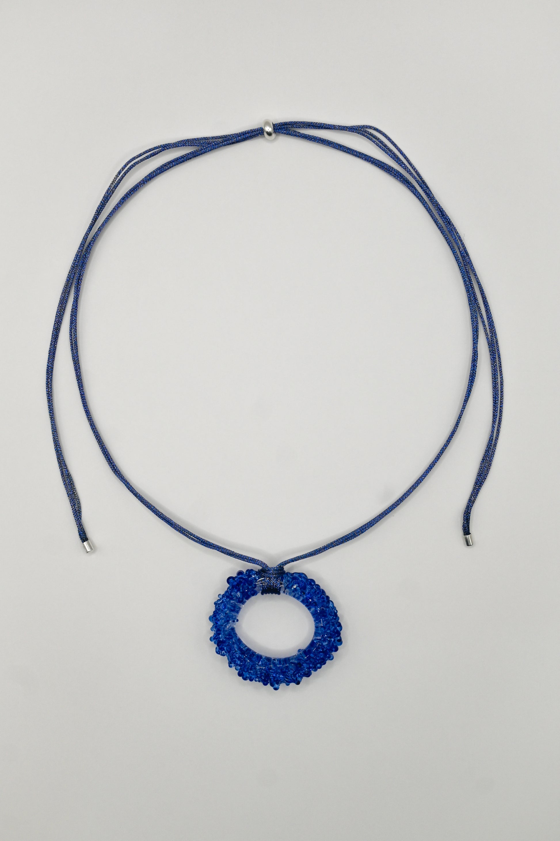 transparente y azul , cierre graduable de metal latón y cordón poliestérico metalizado azul de 45cm de largo.