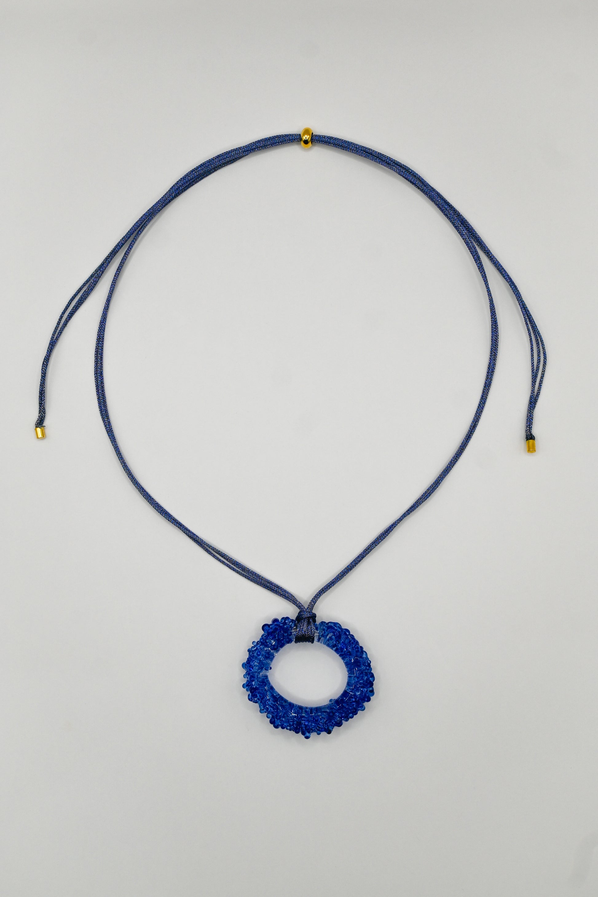 transparente y azul , cierre graduable de metal latón bañado en oro de 24k y cordón poliestérico metalizado azul de 45cm de largo.