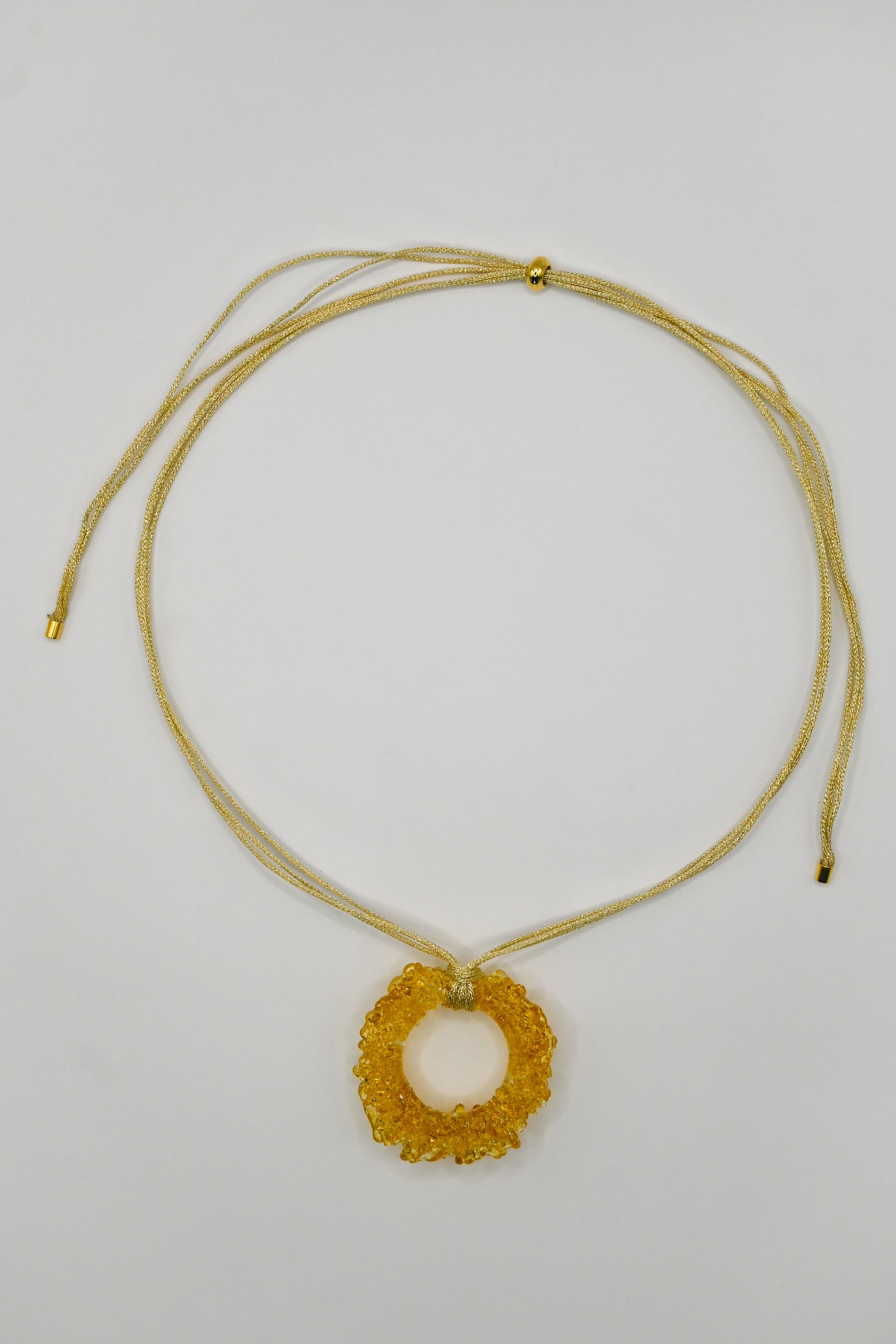 - Oro: Vidrio borosilicato transparente y amarillo , cierre graduable de metal latón bañado en oro de 24k y cordón poliestérico metalizado oro de 45cm de largo.