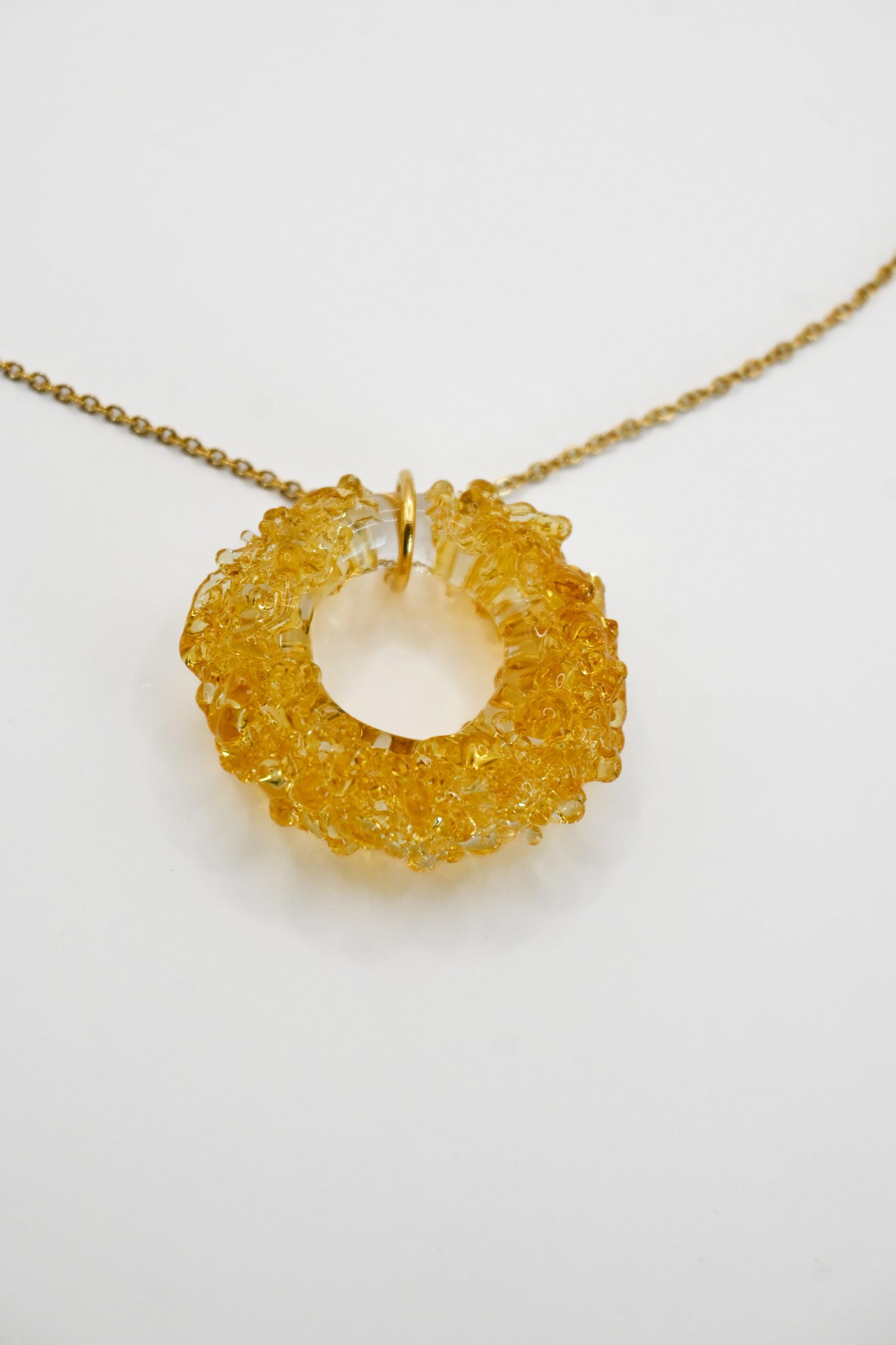 - Oro: Vidrio borosilicato transparente y amarillo y cadena de acero inoxidable bañado en oro de 18k de 45cm.