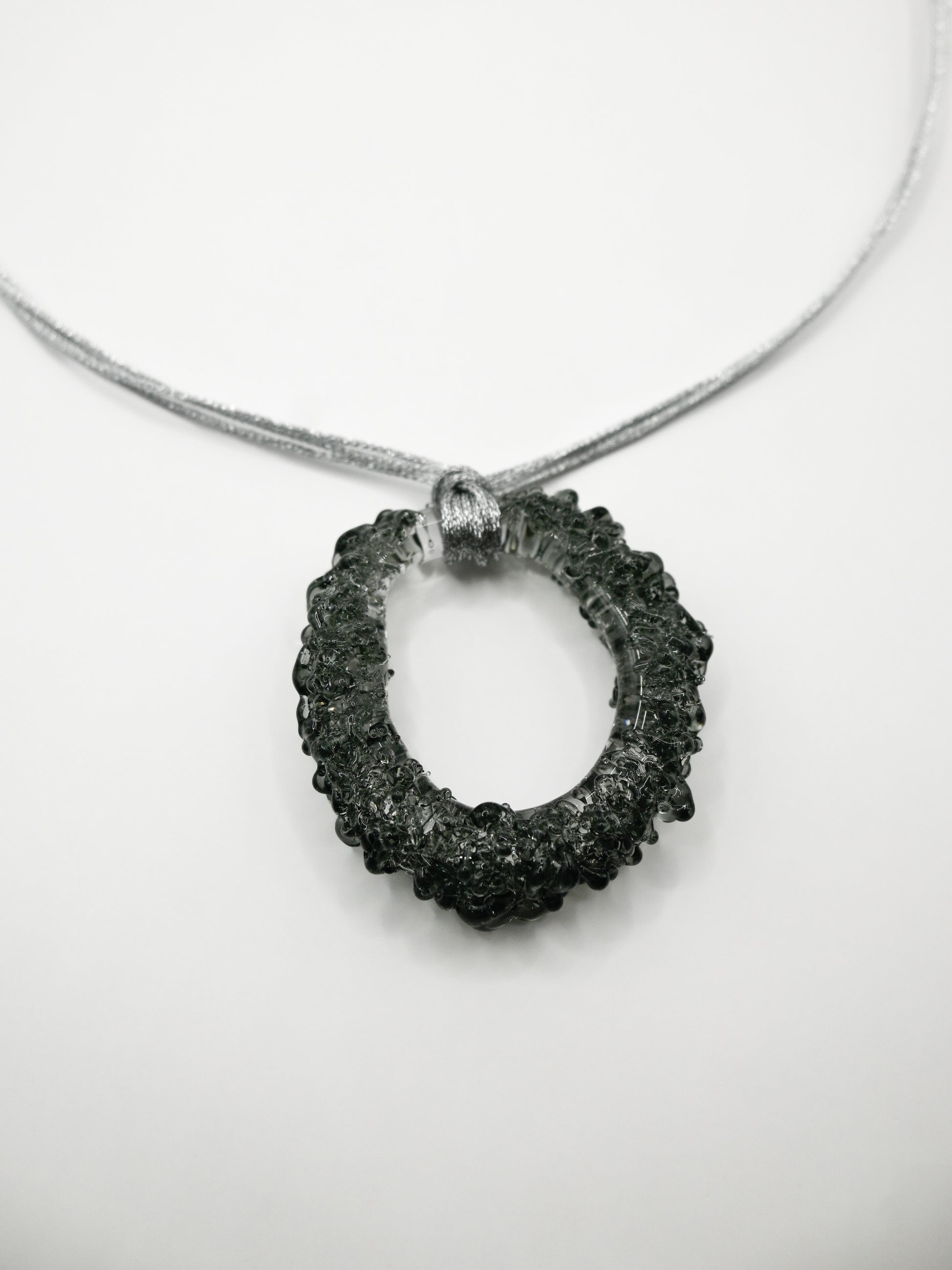 - Plata: Vidrio borosilicato transparente y negro , cierre graduable de metal latón y cordón poliestérico metalizado plata de 45cm de largo.