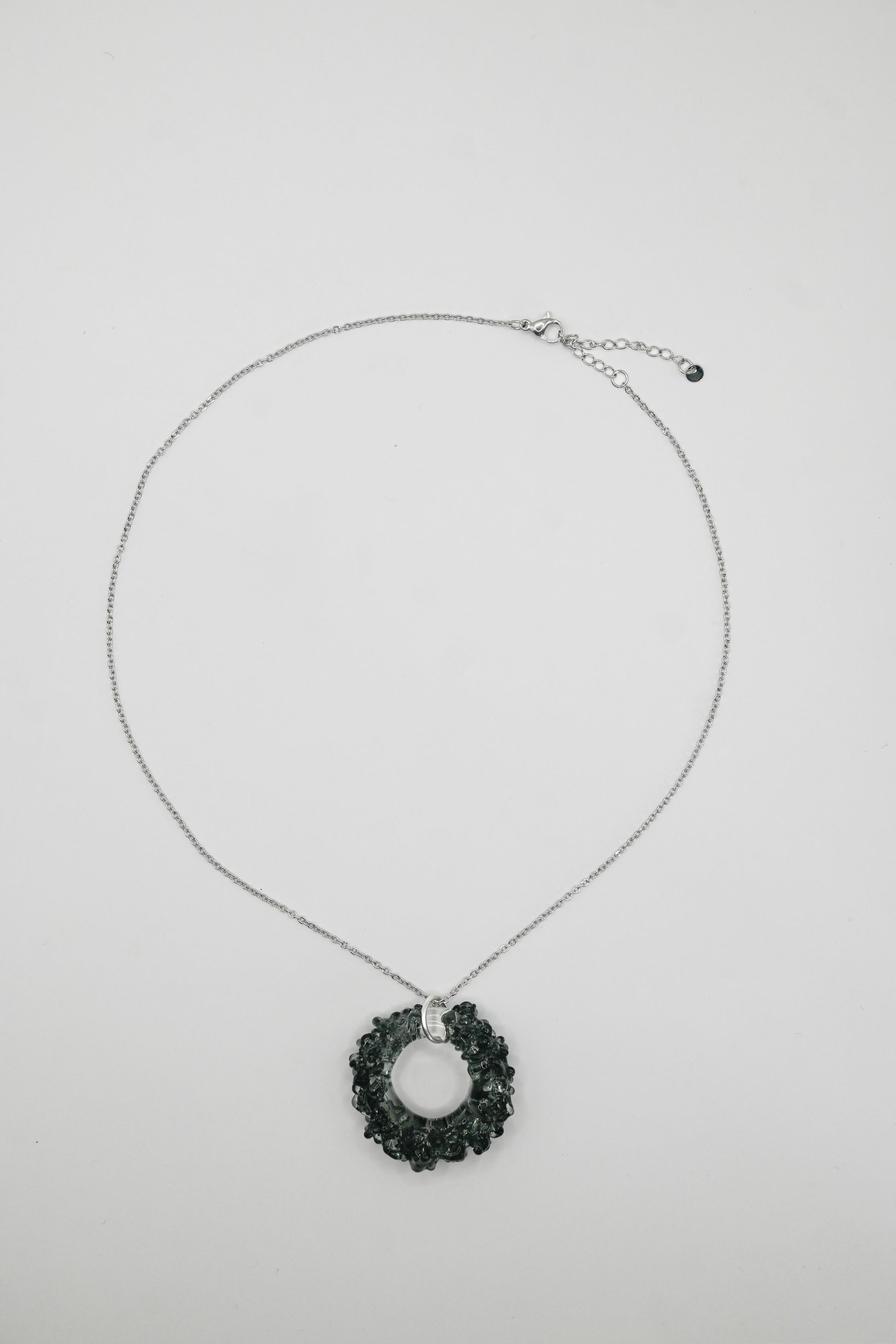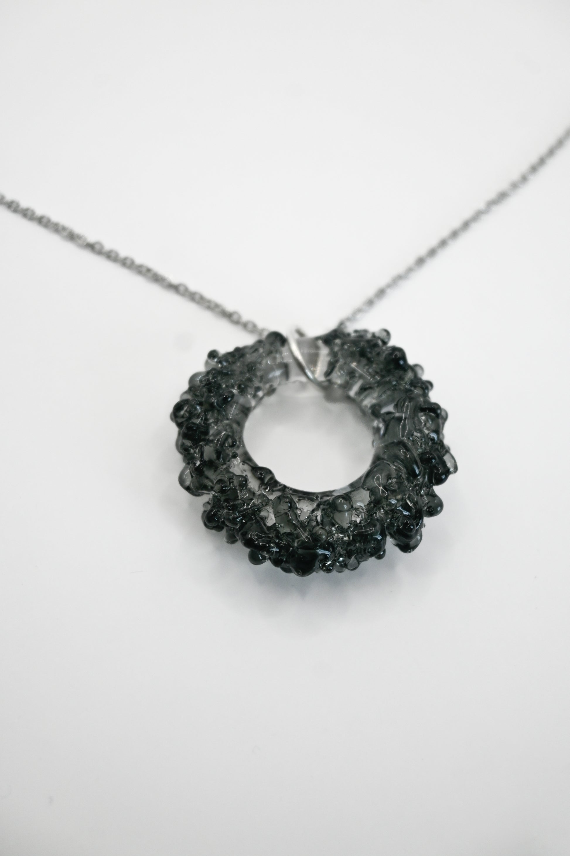 - Plata: Vidrio borosilicato transparente y negro y cadena de acero inoxidable de 45cm.