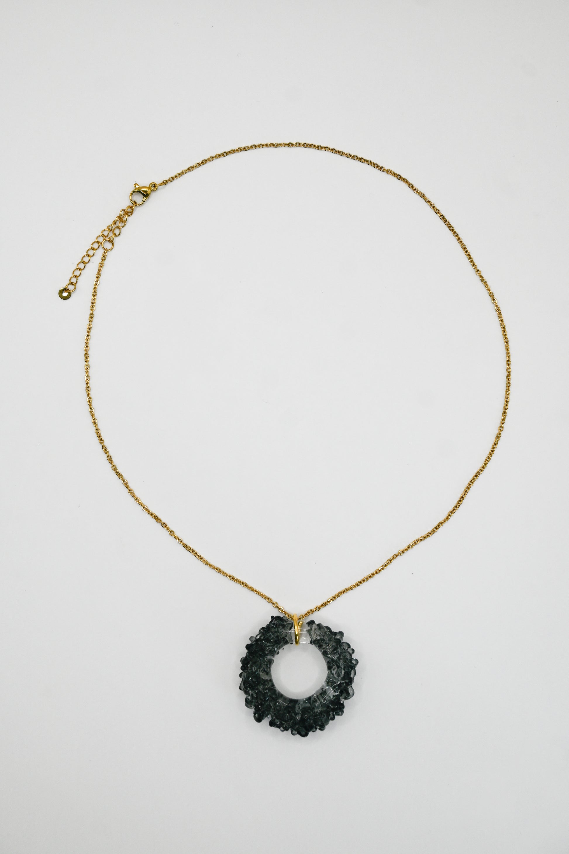 - Oro: Vidrio borosilicato transparente y negro y cadena de acero inoxidable bañado en oro de 18k de 45cm.