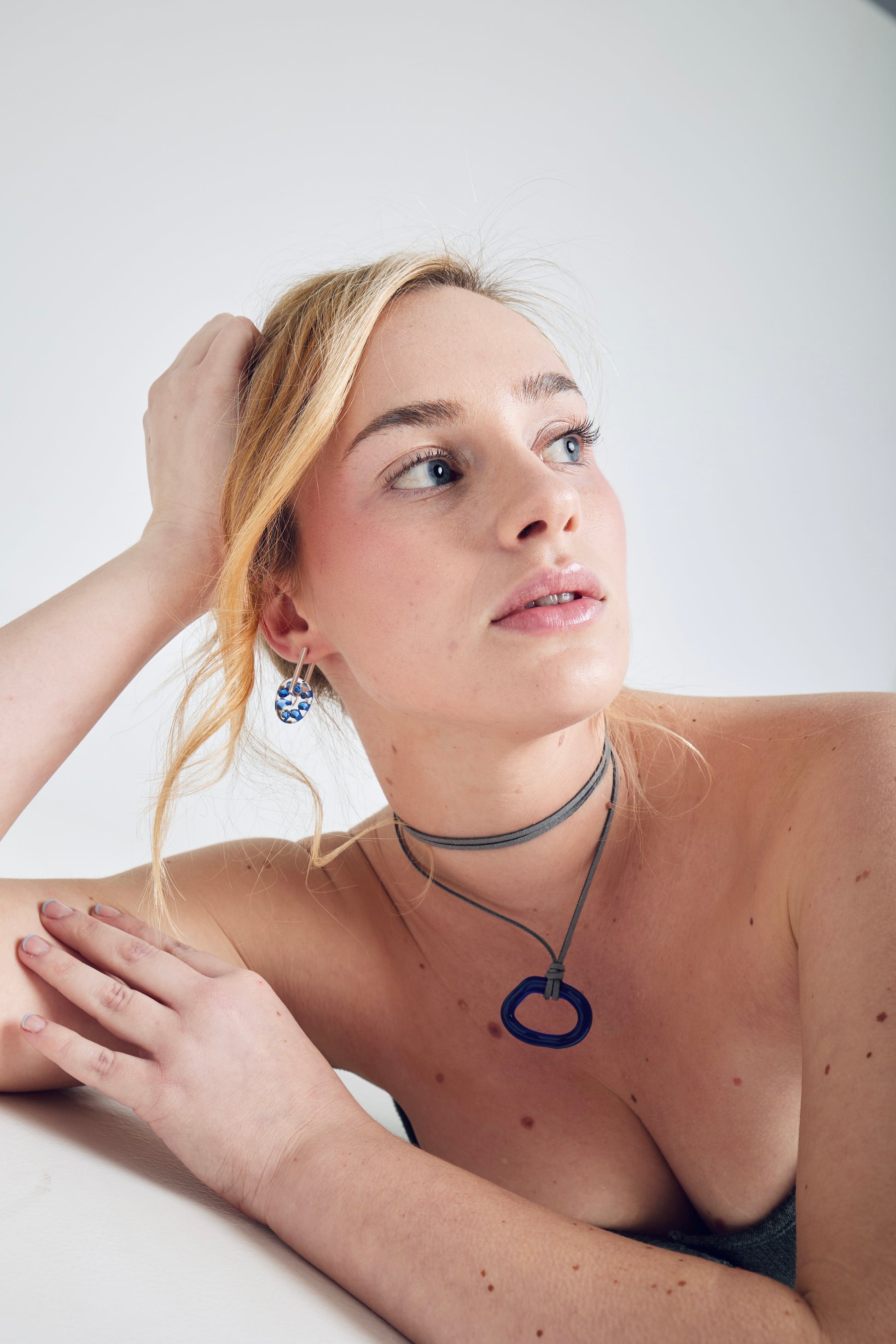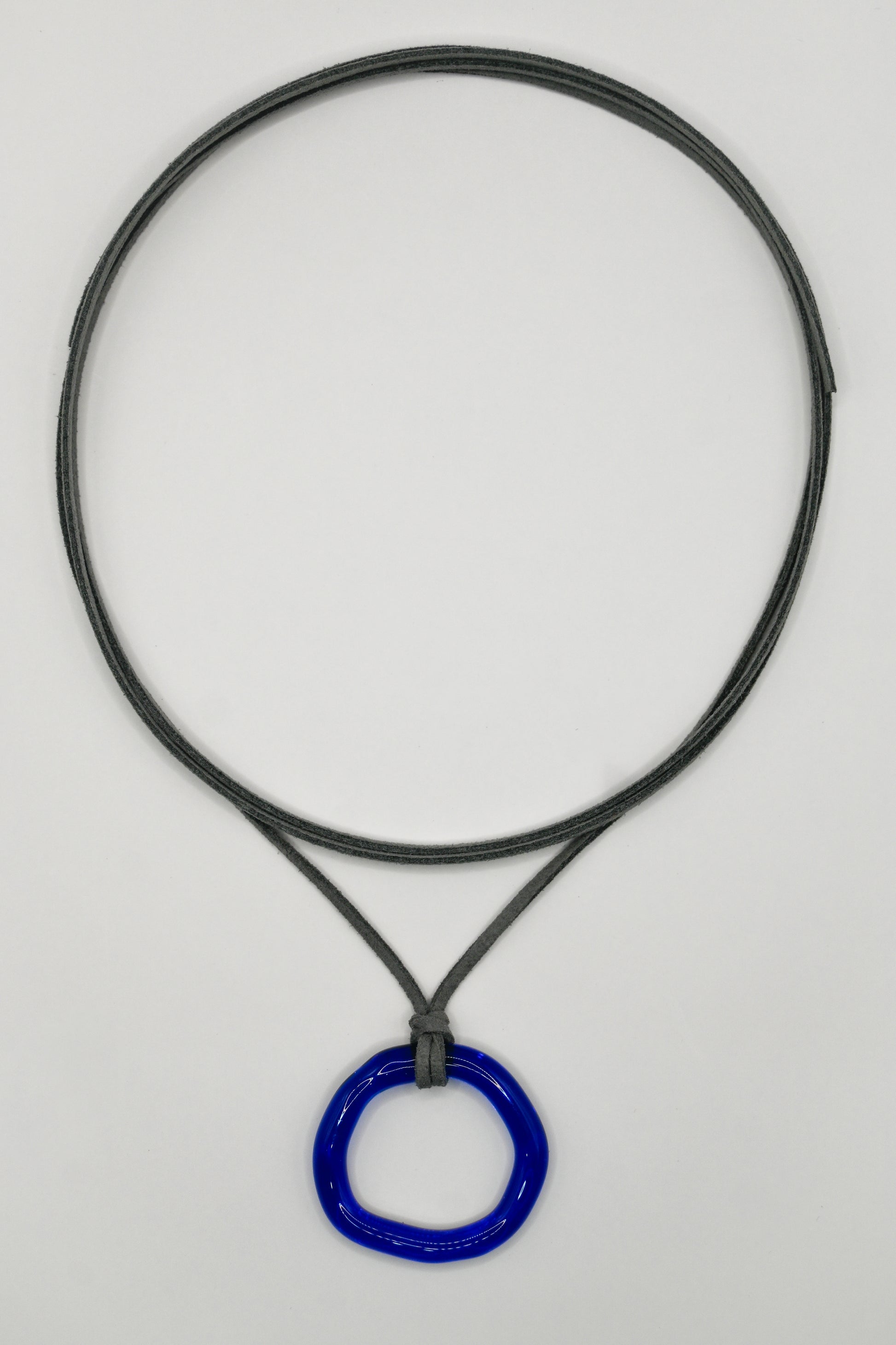 Un collar hecho a mano con vidrio y cordón de antelina plano de color gris presenta una estética artesanal y natural. La pieza central es una redonda de vidrio borosilicato azul, moldeada a mano con detalles únicos y texturas fascinantes. El cordón de antelina plano complementa el estilo rústico y orgánico del collar, ofreciendo un contraste suave y elegante alrededor del cuello. Esta combinación crea una pieza de joyería que destaca por su simplicidad, pero al mismo tiempo, por su singularidad y belleza artesanal.