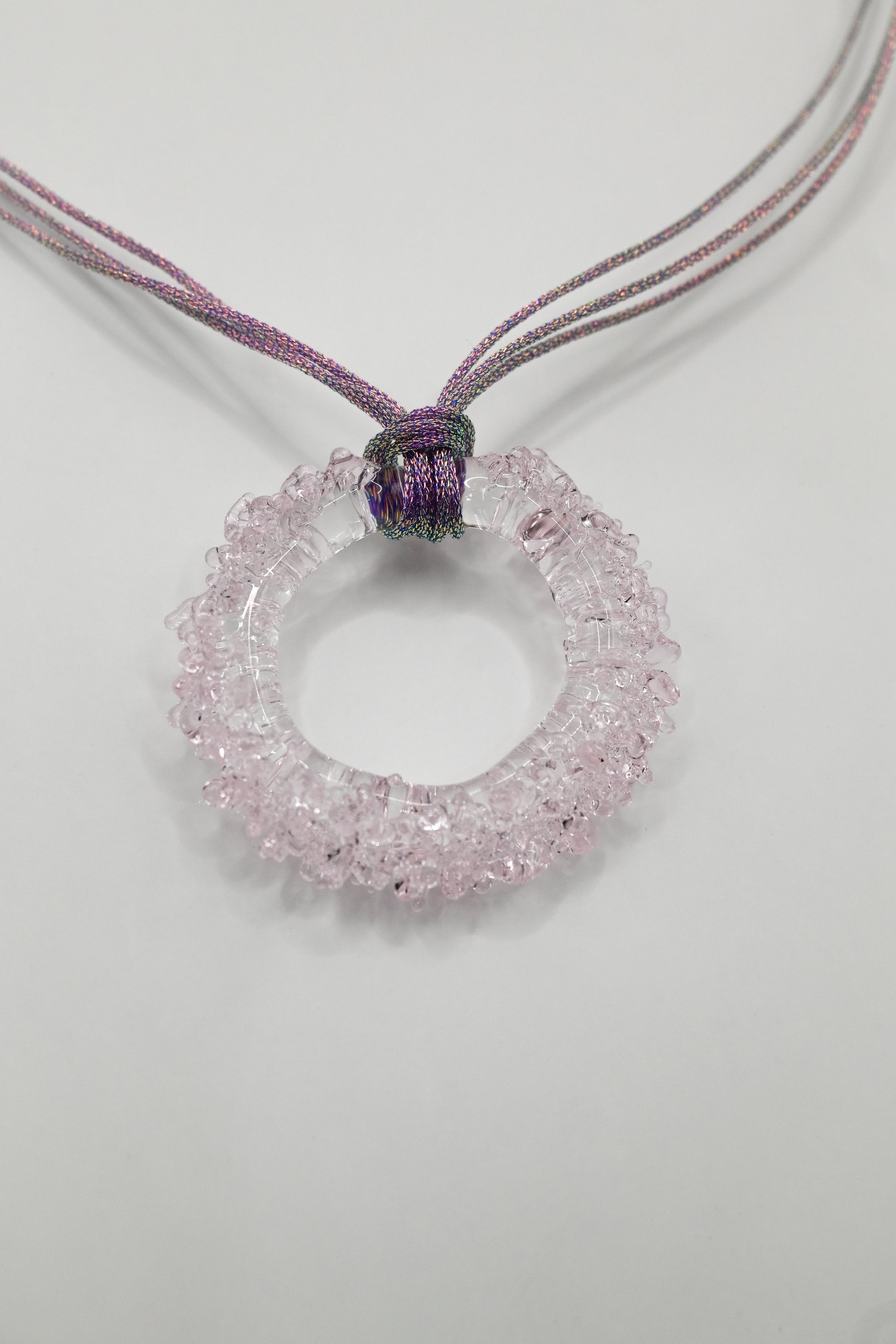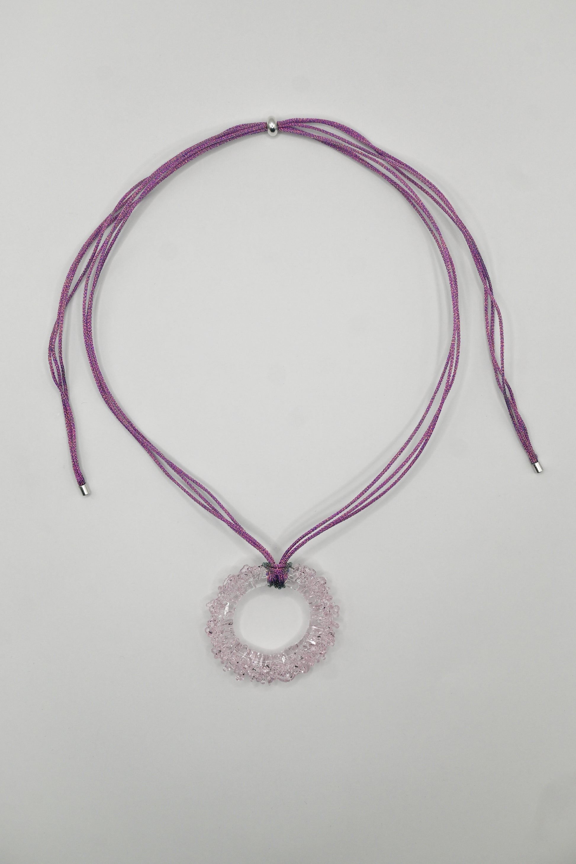 - Plata: Vidrio borosilicato transparente y rosa, cierre graduable de metal latón y cordón poliestérico metalizado rosa de 45cm de largo.
