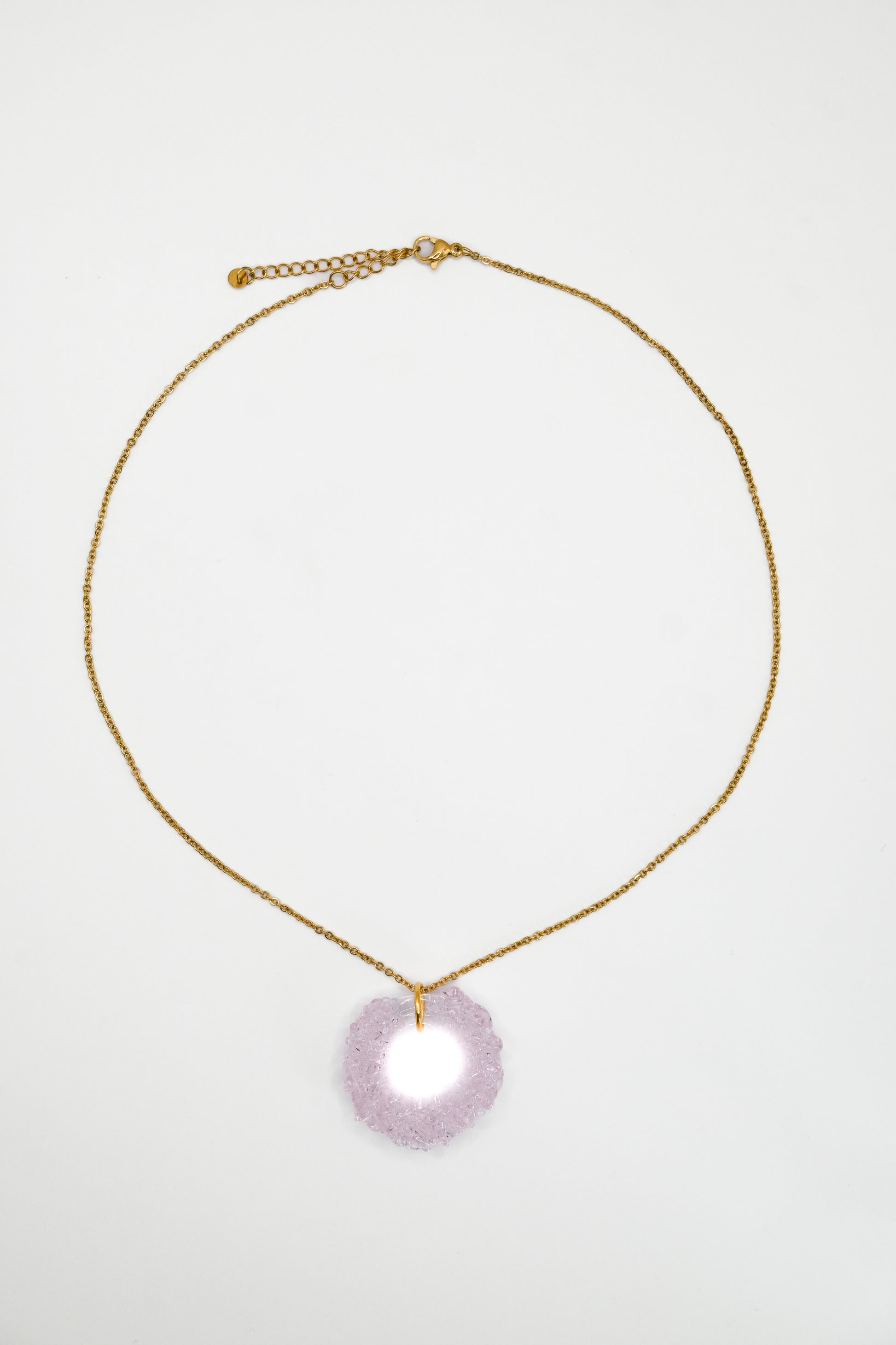 - Oro: Vidrio borosilicato transparente y rosa y cadena de acero inoxidable bañado en oro de 18k de 45cm.