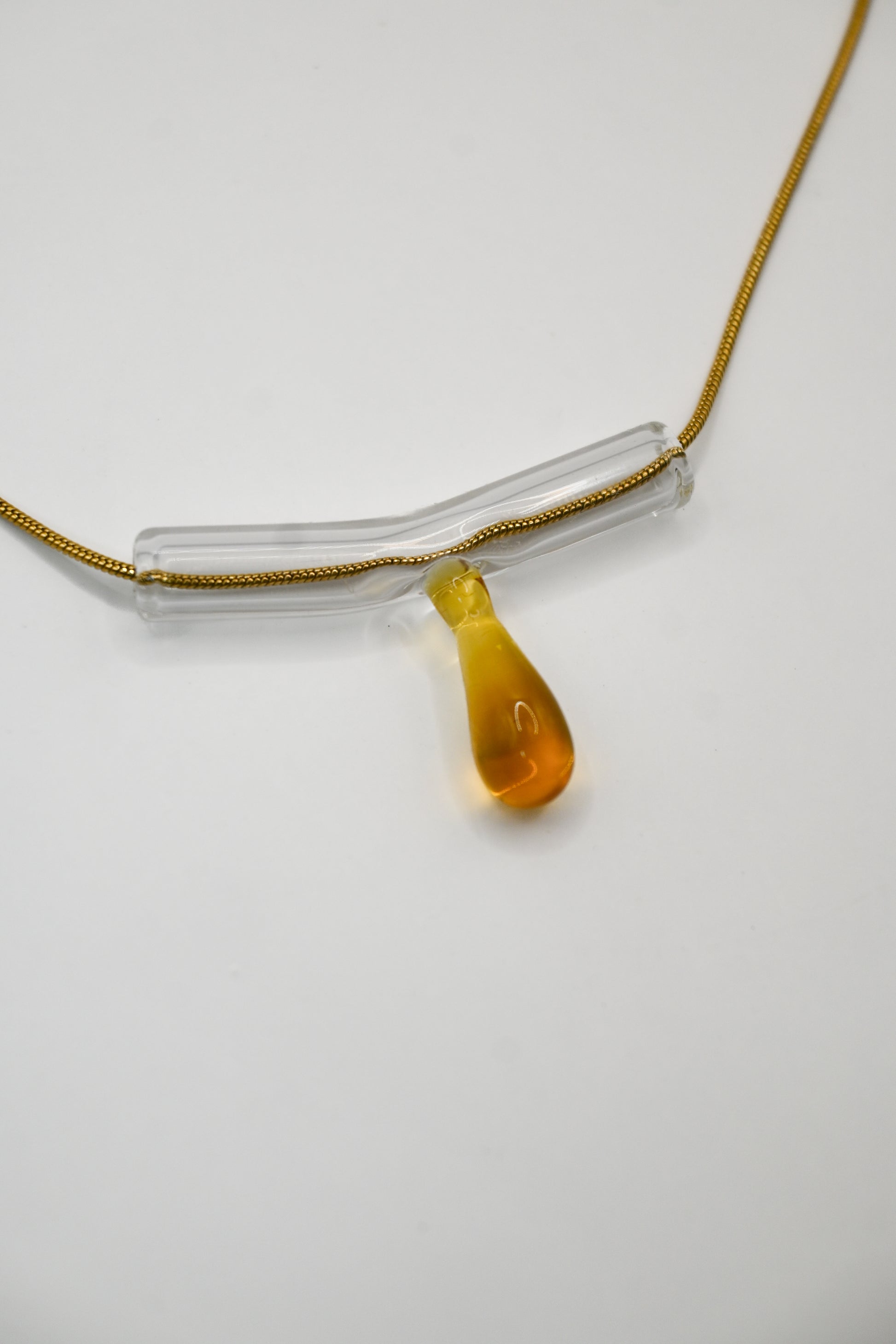Vidrio borosilicato transparente y amarillo junto con una cadena de acero inoxidable bañado en oro de 18k y un cierre graduable de acero inoxidable bañado en oro de 24k.