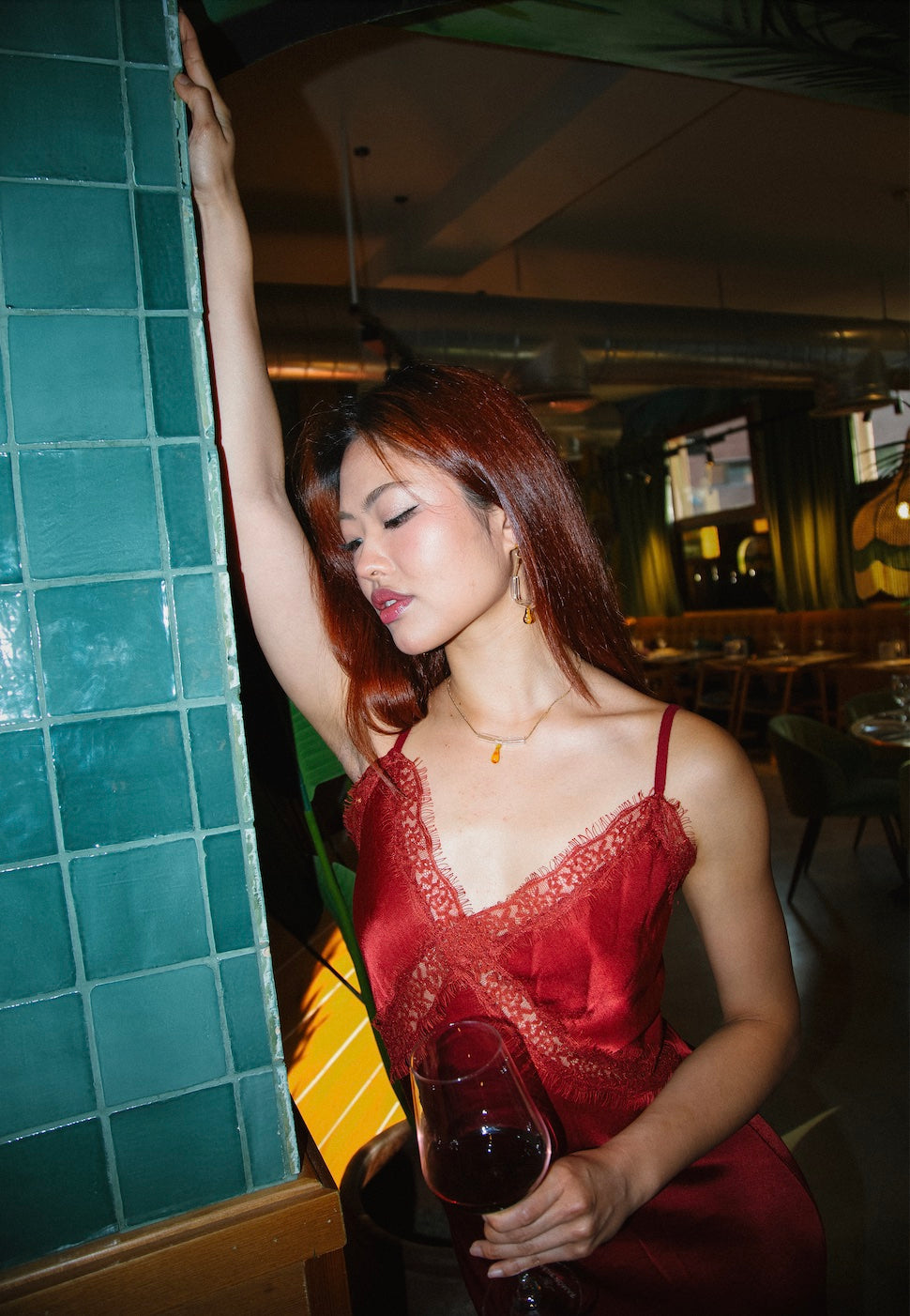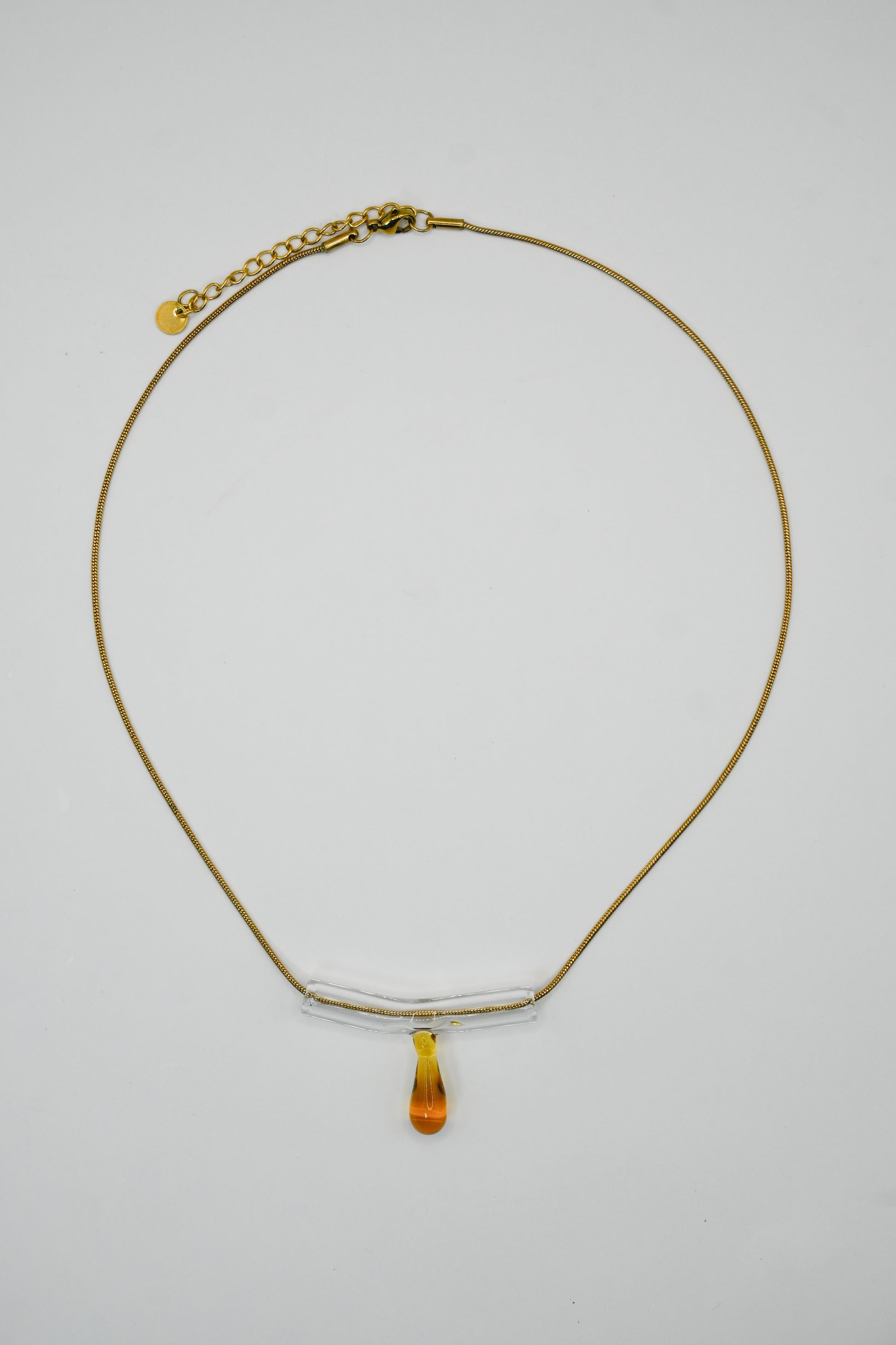 Delicadamente hecho a mano, el collar Vela combina la pureza del vidrio transparente con una sutil gota de color ámbar. Es una pieza elegante y ligera, diseñada para acompañarte en esas noches de verano donde todo fluye con naturalidad y estilo. Su brillo tenue evoca el encanto de una cena elegante: el sonido de las copas, la conversación pausada y el aire cálido que envuelve. Esta joya artesanal busca llamar la atención, realzar la belleza de lo simple, lo auténtico, lo que permanece.