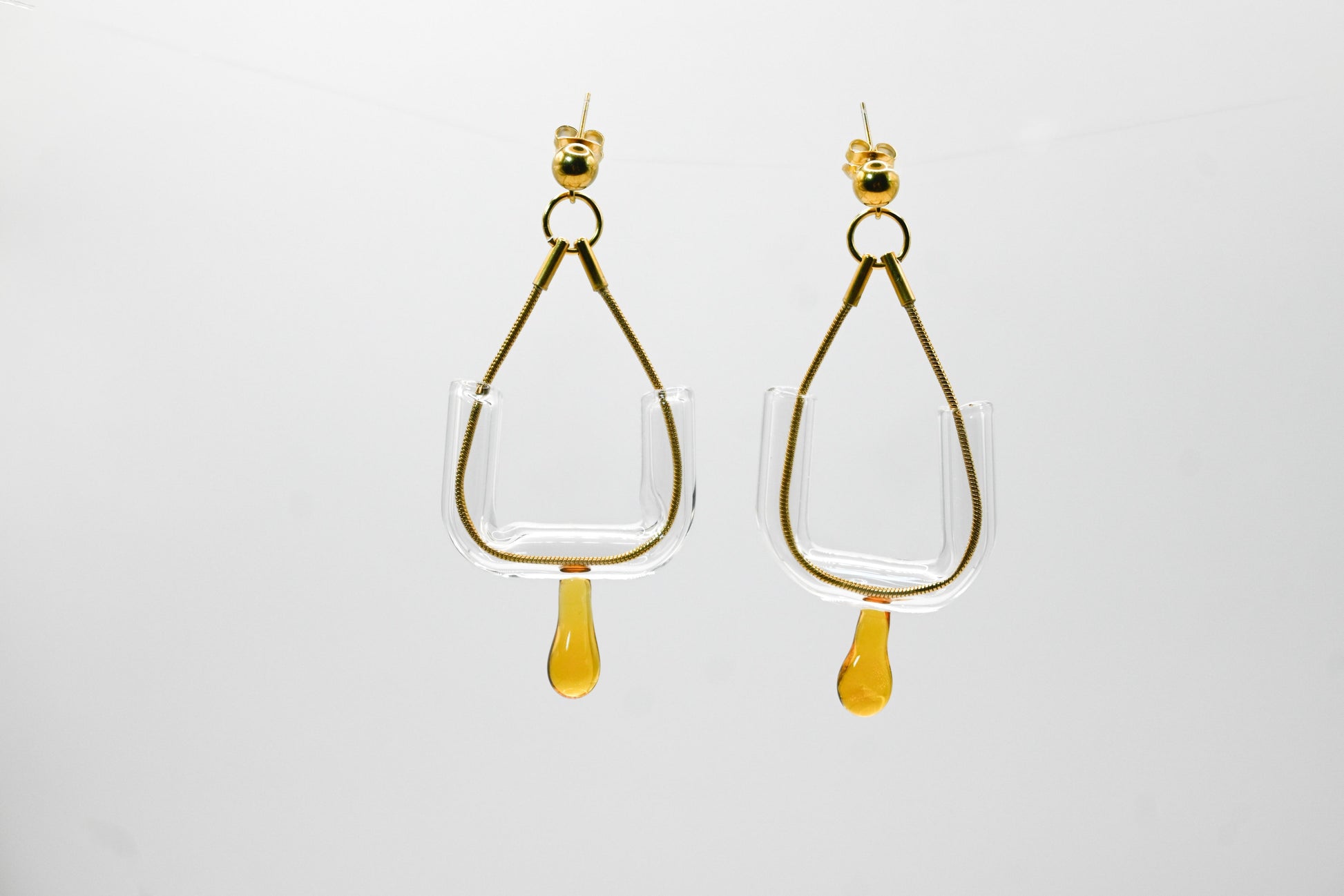 Delicadamente hecho a mano, los pendientes Vela combinan la pureza del vidrio transparente con una sutil gota de color ámbar. Es una pieza elegante y ligera, diseñada para acompañarte en esas noches de verano donde todo fluye con naturalidad y estilo. Su brillo tenue evoca el encanto de una cena elegante: el sonido de las copas, la conversación pausada y el aire cálido que envuelve. Esta joya artesanal busca llamar la atención, realzar la belleza de lo simple, lo auténtico, lo que permanece.