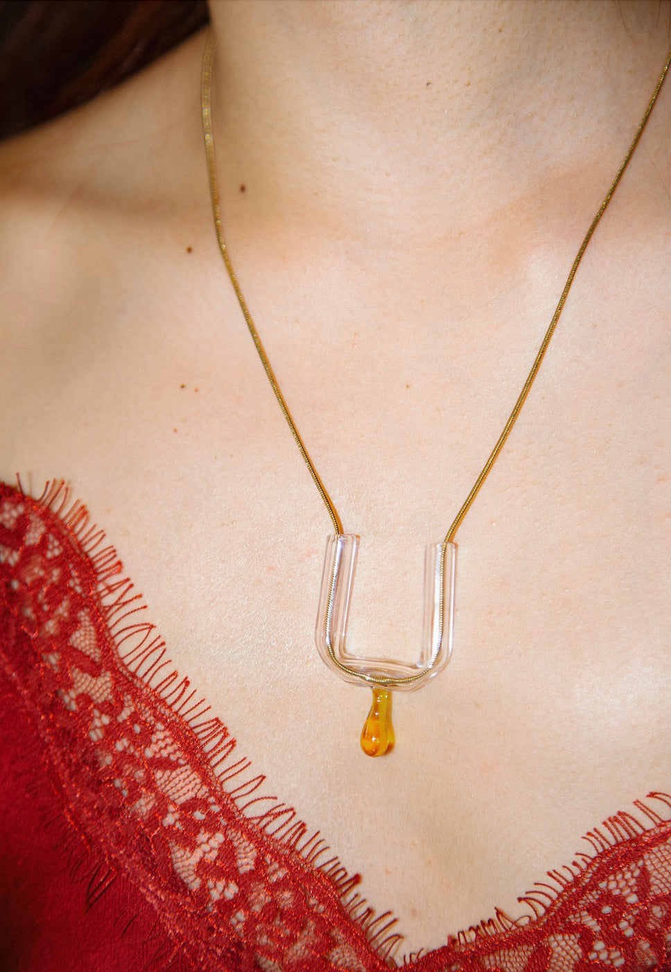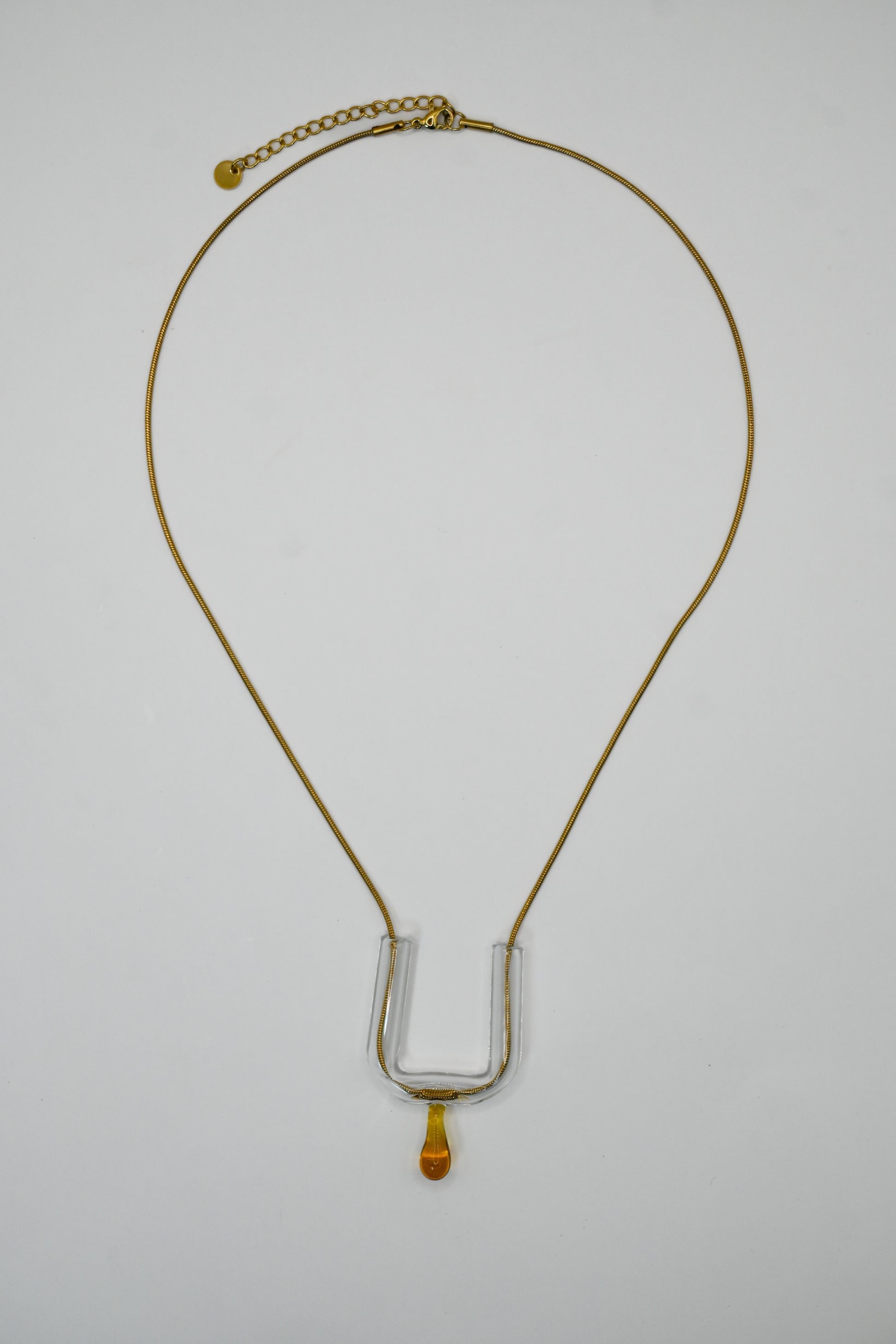 Delicadamente hecho a mano, el collar Vela .1 combina la pureza del vidrio transparente con una sutil gota de color ámbar. Es una pieza elegante y ligera, diseñada para acompañarte en esas noches de verano donde todo fluye con naturalidad y estilo. Su brillo tenue evoca el encanto de una cena elegante: el sonido de las copas, la conversación pausada y el aire cálido que envuelve. Esta joya artesanal busca llamar la atención, realzar la belleza de lo simple, lo auténtico, lo que permanece.