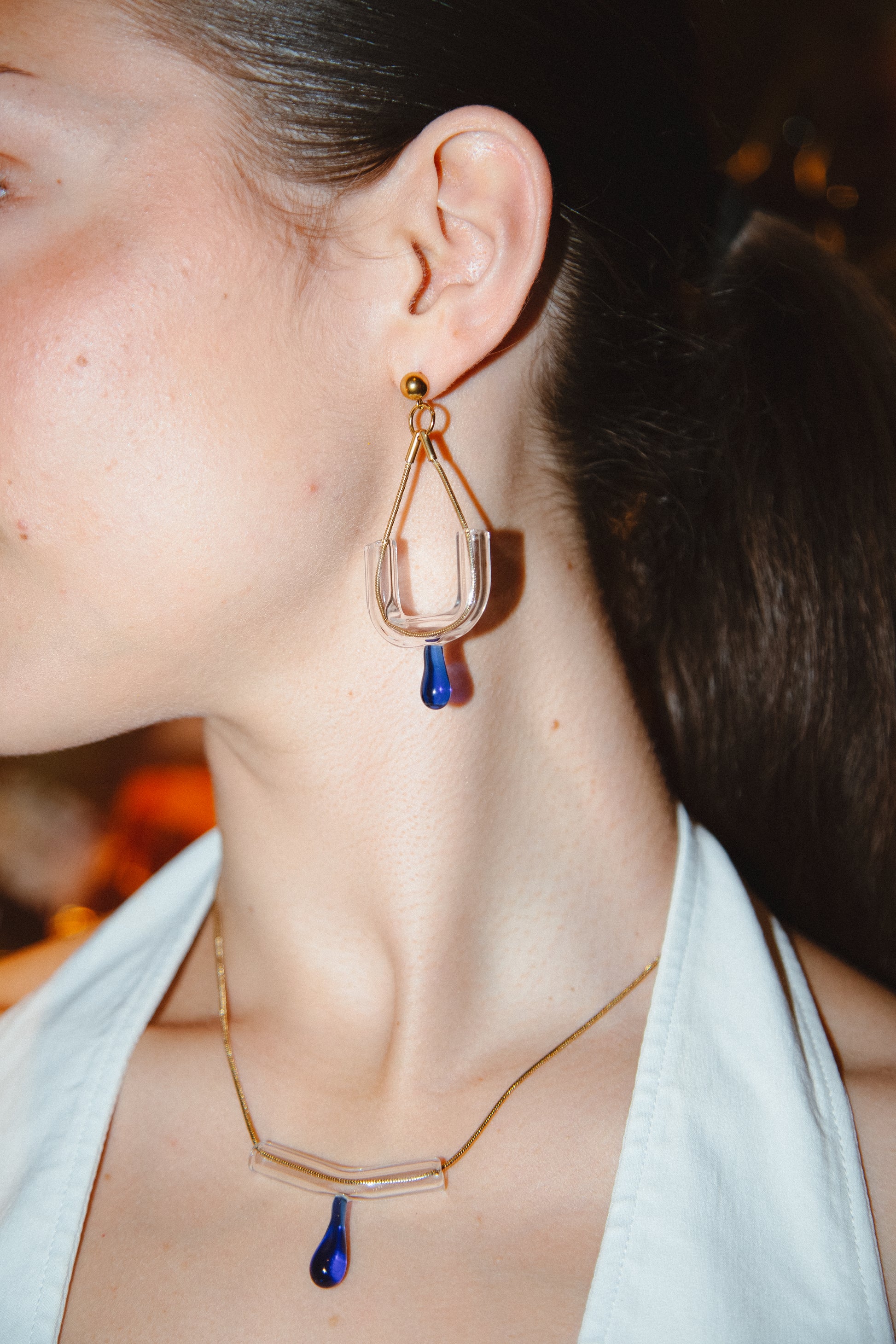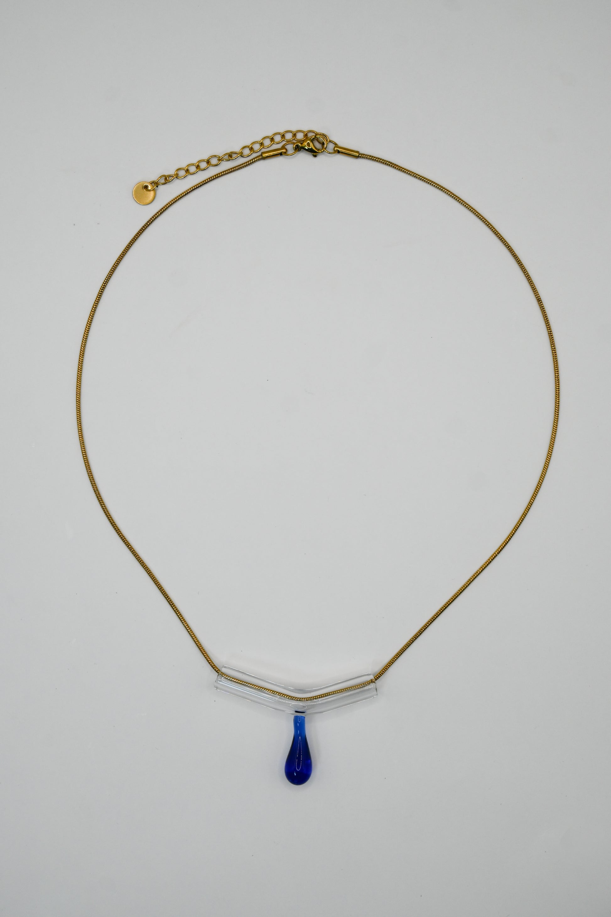 Delicadamente hecho a mano, el collar Vela combina la pureza del vidrio transparente con una sutil gota de color azul. Es una pieza elegante y ligera, diseñada para acompañarte en esas noches de verano donde todo fluye con naturalidad y estilo. Su brillo tenue evoca el encanto de una cena elegante: el sonido de las copas, la conversación pausada y el aire cálido que envuelve. Esta joya artesanal busca llamar la atención, realzar la belleza de lo simple, lo auténtico, lo que permanece.