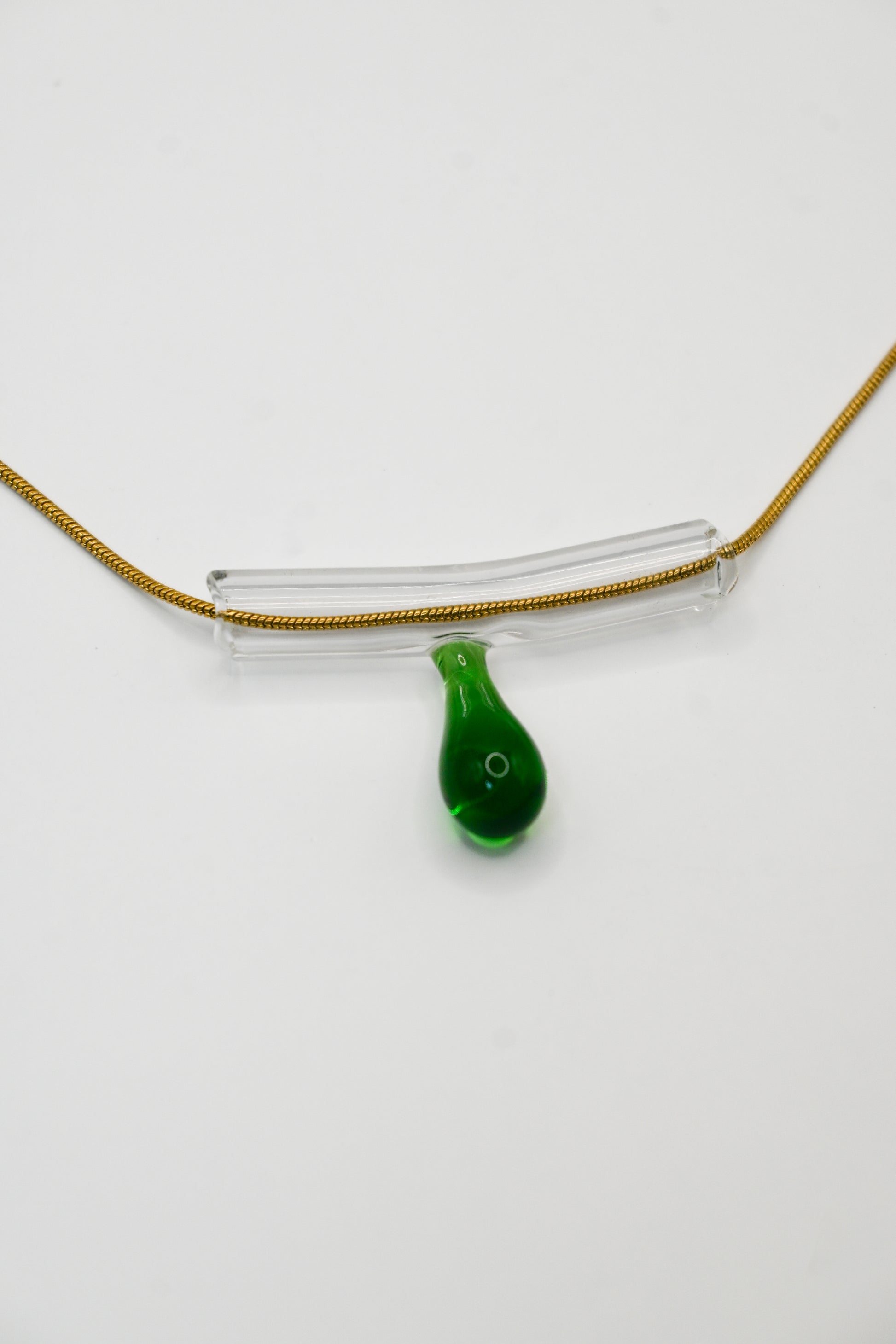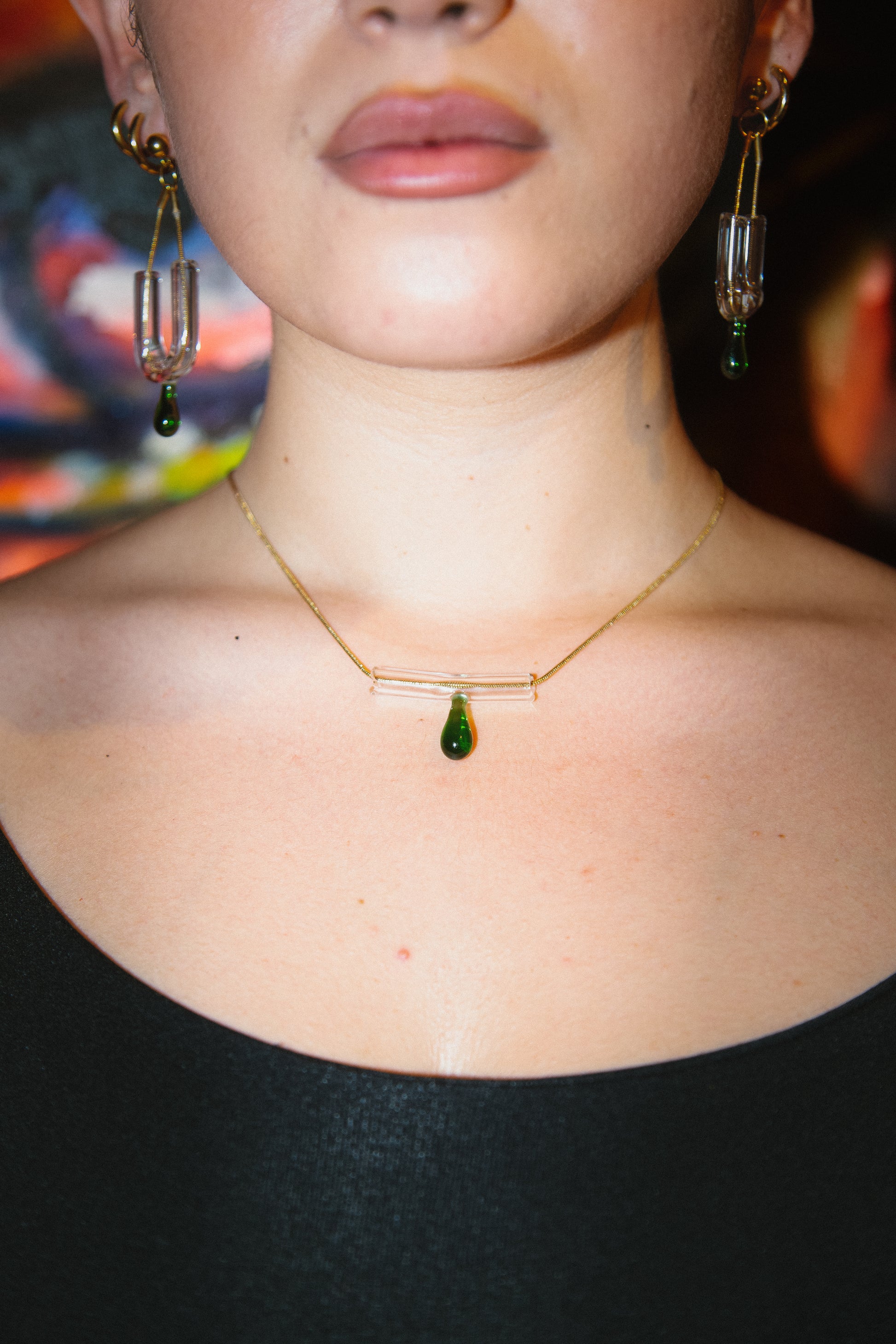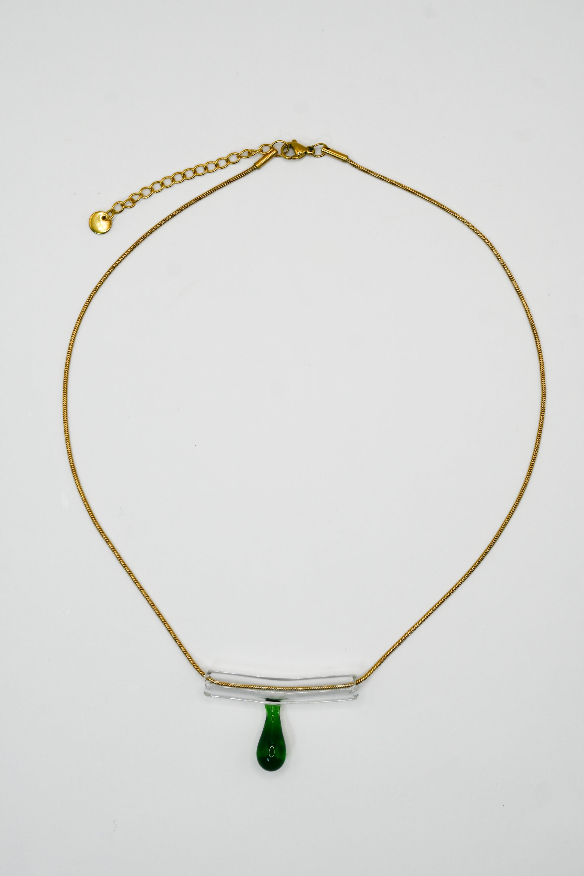 Delicadamente hecho a mano, el collar Vela combina la pureza del vidrio transparente con una sutil gota de color verde. Es una pieza elegante y ligera, diseñada para acompañarte en esas noches de verano donde todo fluye con naturalidad y estilo. Su brillo tenue evoca el encanto de una cena elegante: el sonido de las copas, la conversación pausada y el aire cálido que envuelve. Esta joya artesanal busca llamar la atención, realzar la belleza de lo simple, lo auténtico, lo que permanece.