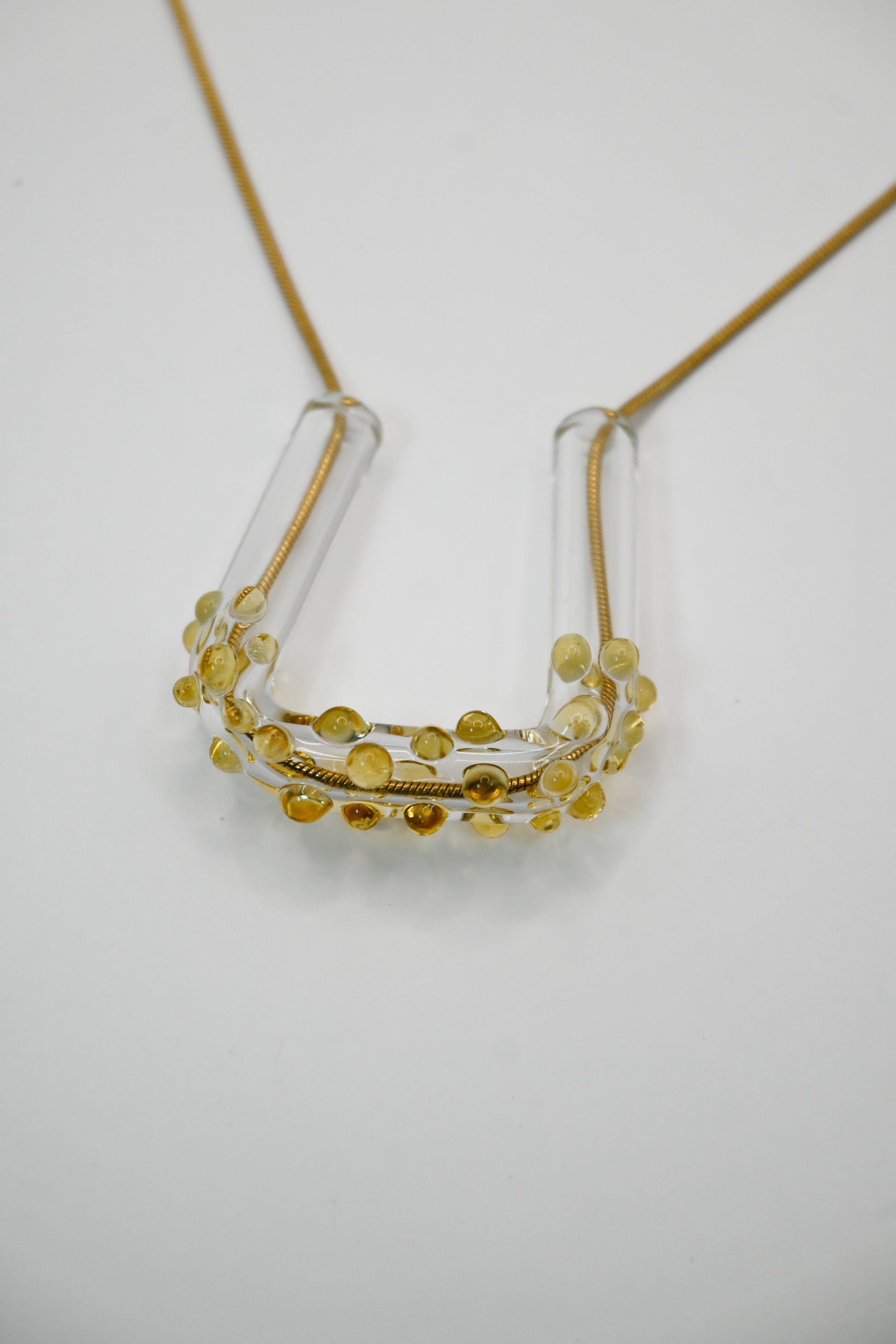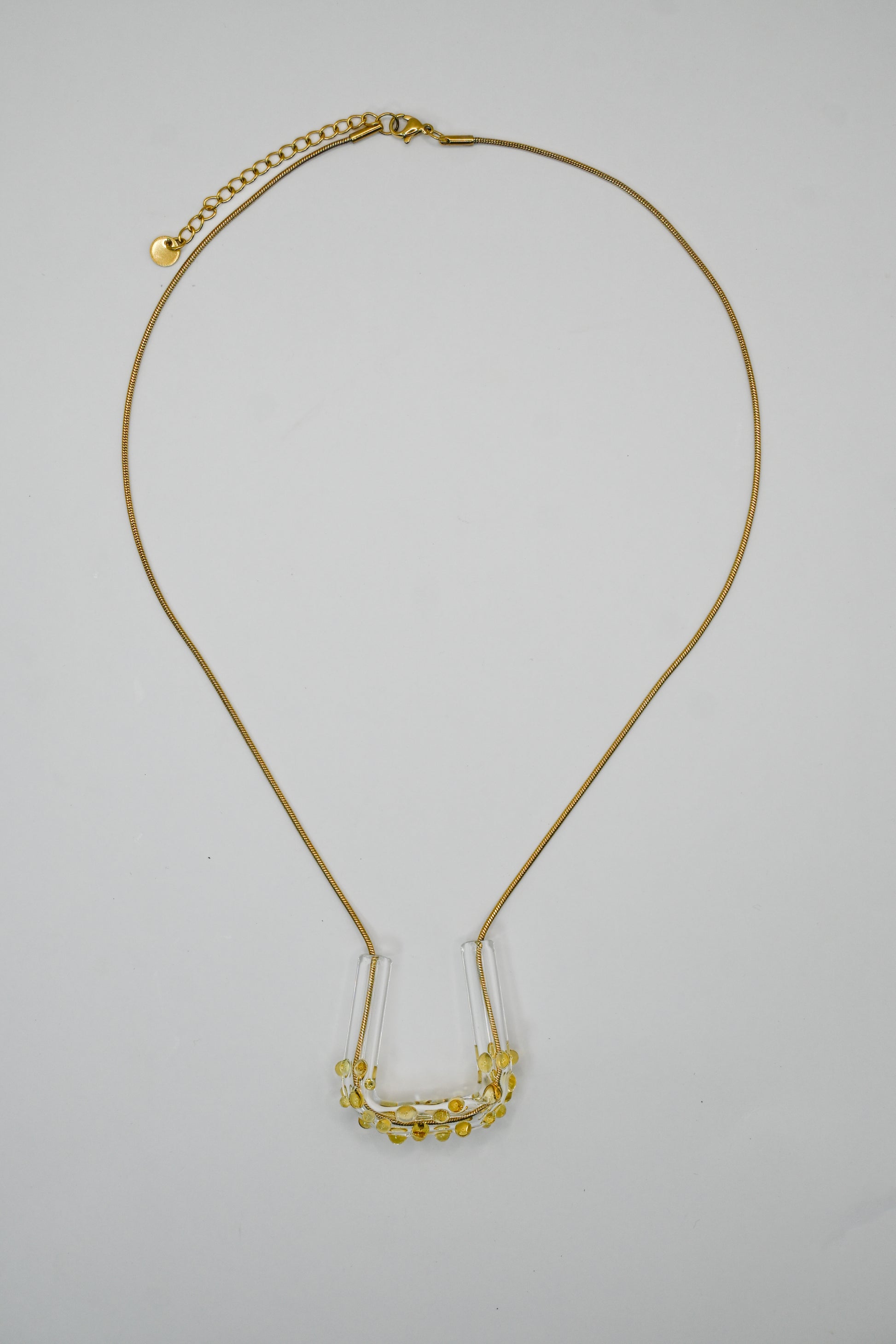 Vidrio borosilicato transparente y amarillo junto con una cadena de acero inoxidable bañado en oro de 18k y un cierre graduable de acero inoxidable bañado en oro de 24k.