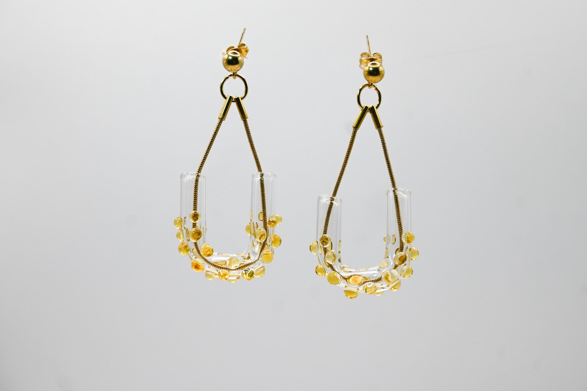 Delicadamente hecho a mano, los pendientes Velada combinan la pureza del vidrio transparente con sutiles putos de color ámbar. Es una pieza elegante y ligera, diseñada para acompañarte en esas noches de verano donde todo fluye con naturalidad y estilo. Su brillo tenue evoca el encanto de una cena elegante: el sonido de las copas, la conversación pausada y el aire cálido que envuelve. Esta joya artesanal busca llamar la atención, realzar la belleza de lo simple, lo auténtico, lo que permanece.