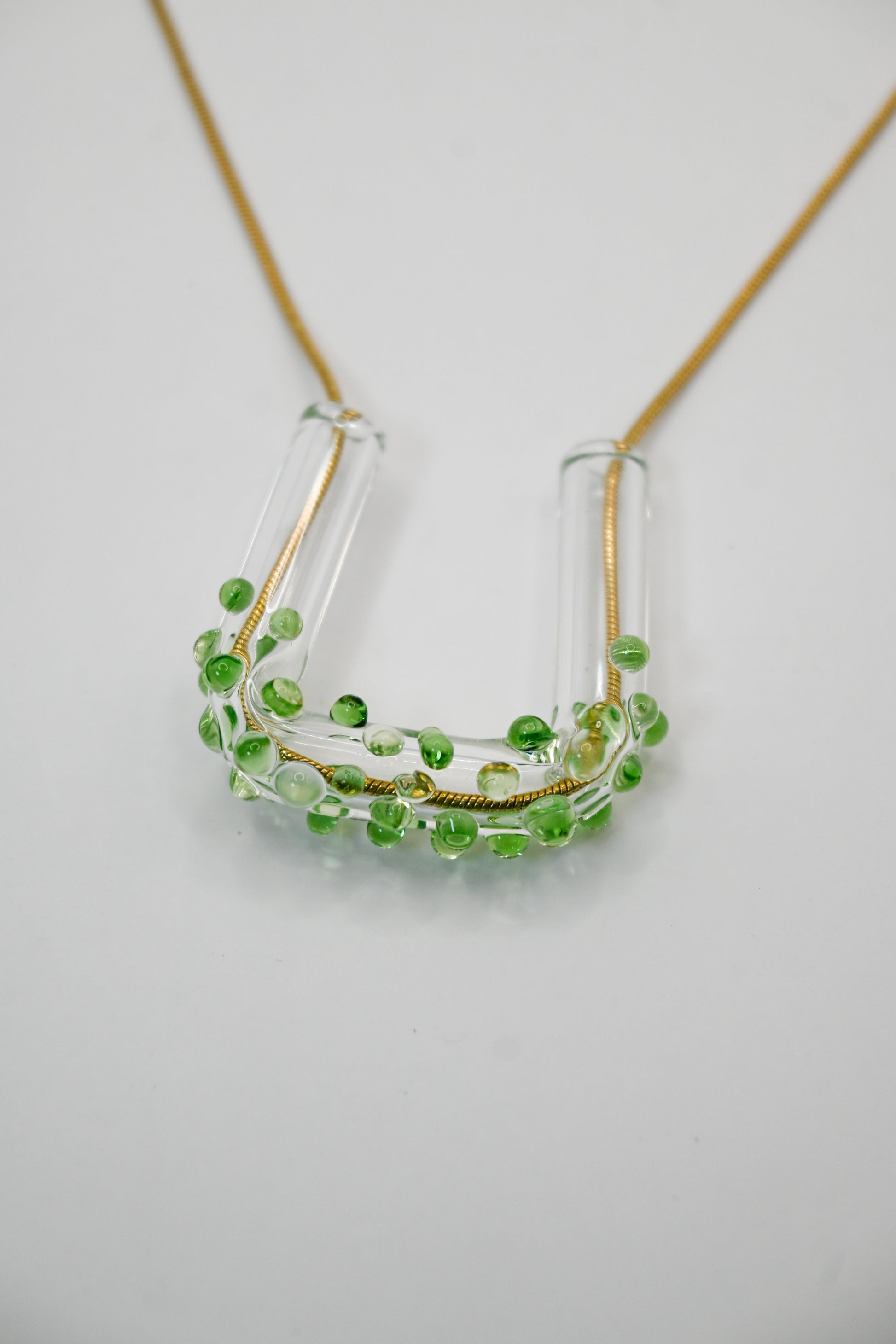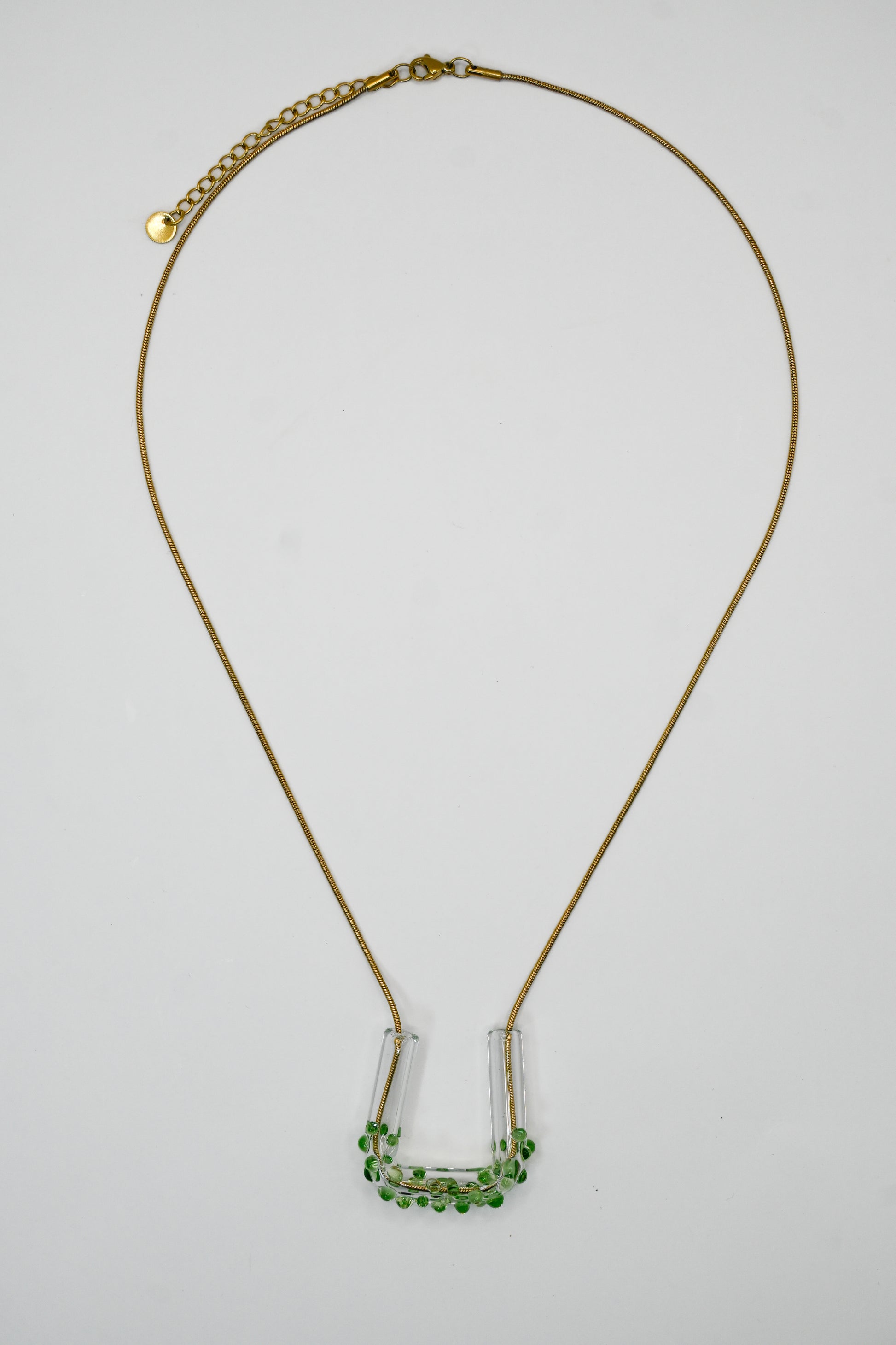 Vidrio borosilicato transparente y verde junto con una cadena de acero inoxidable bañado en oro de 18k y un cierre graduable de acero inoxidable bañado en oro de 24k.