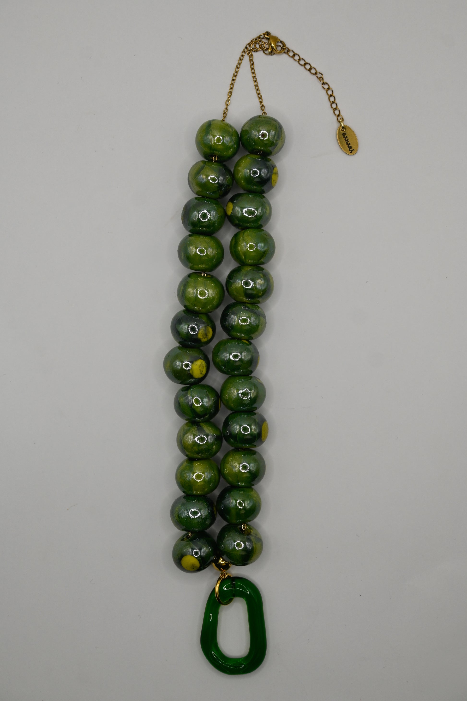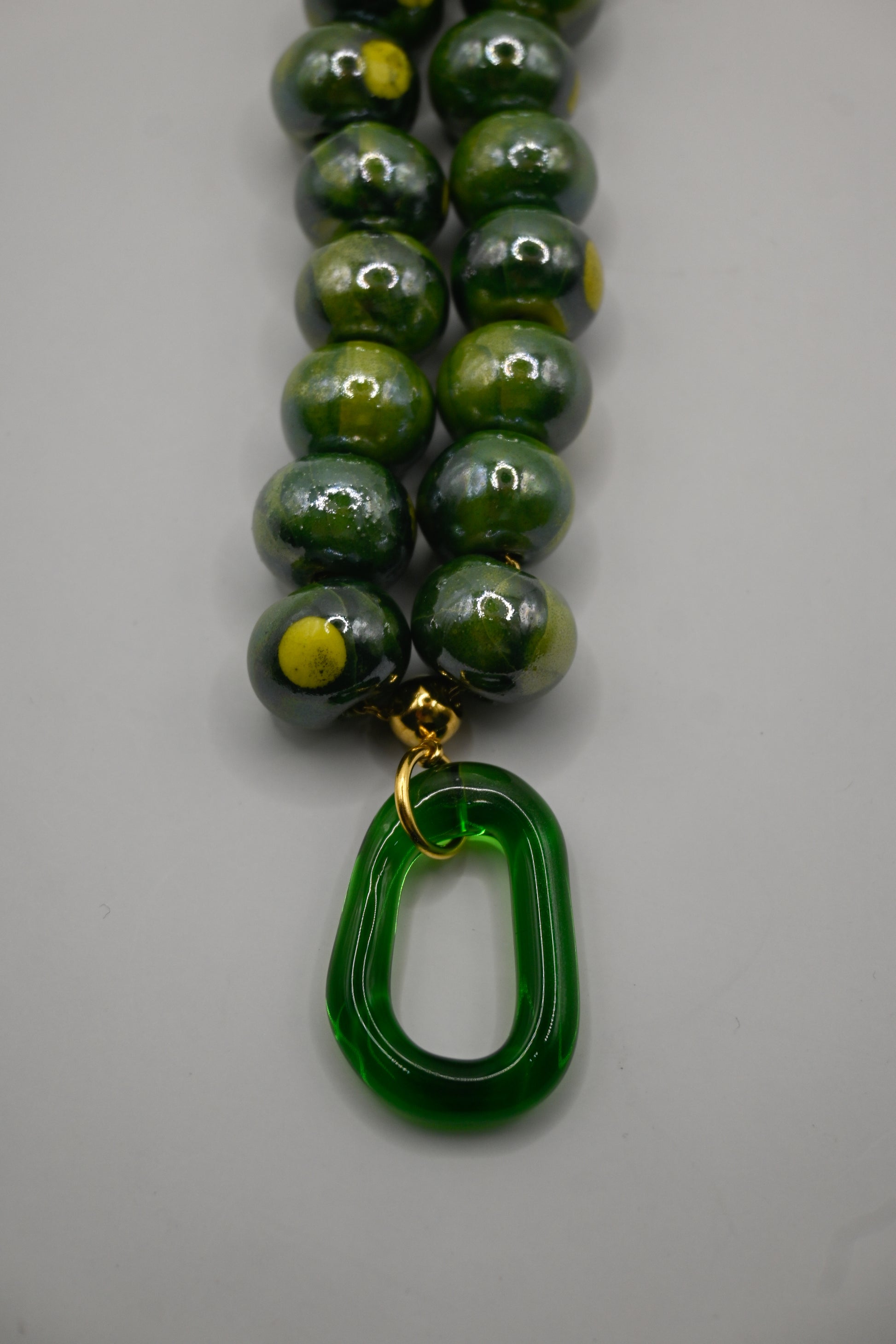 Vidrio borosilicato verde junto con entrepiezas de cerámica y cadena de acero inoxidable bañada en oro de 24k.